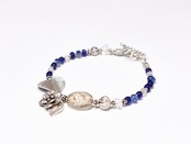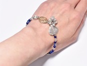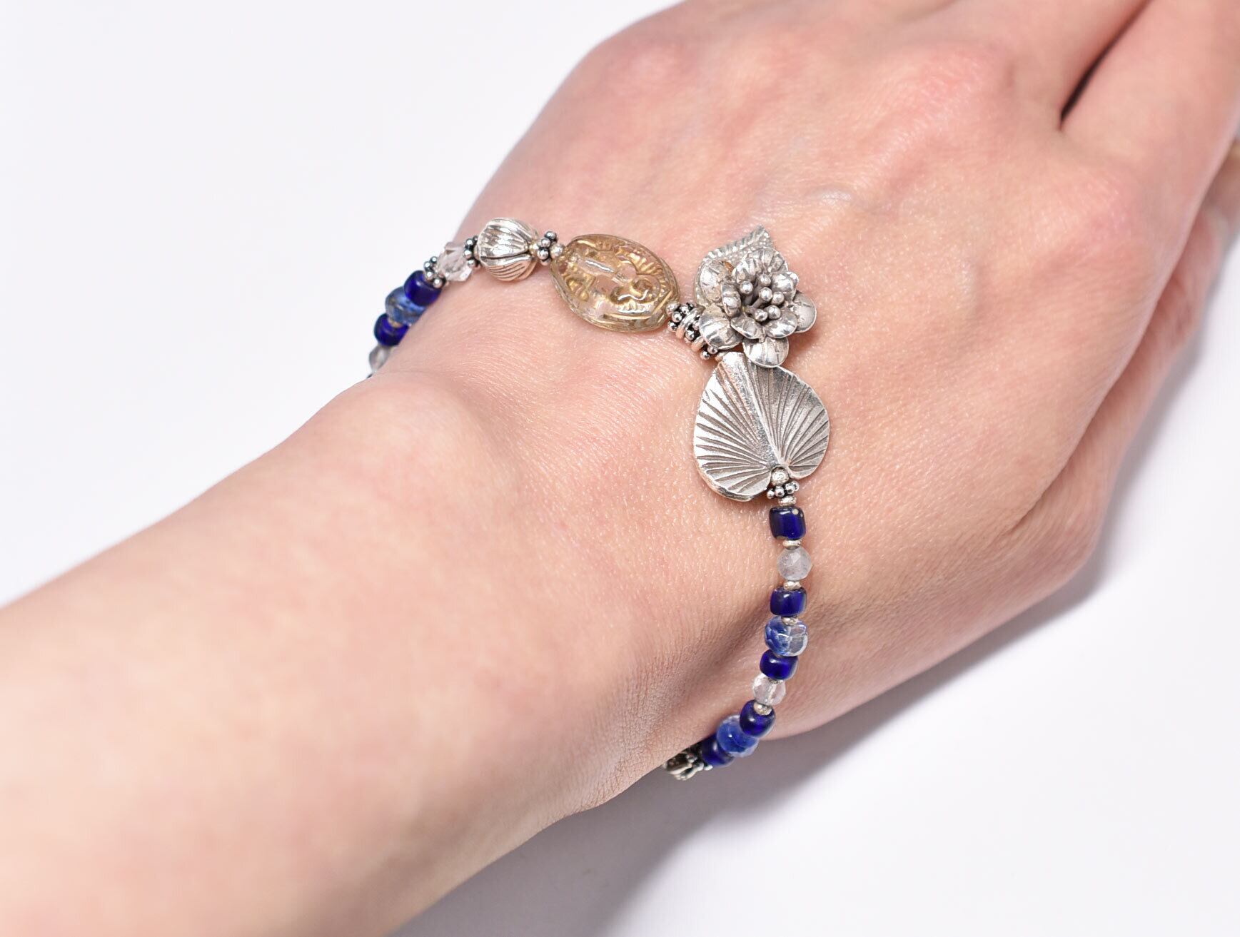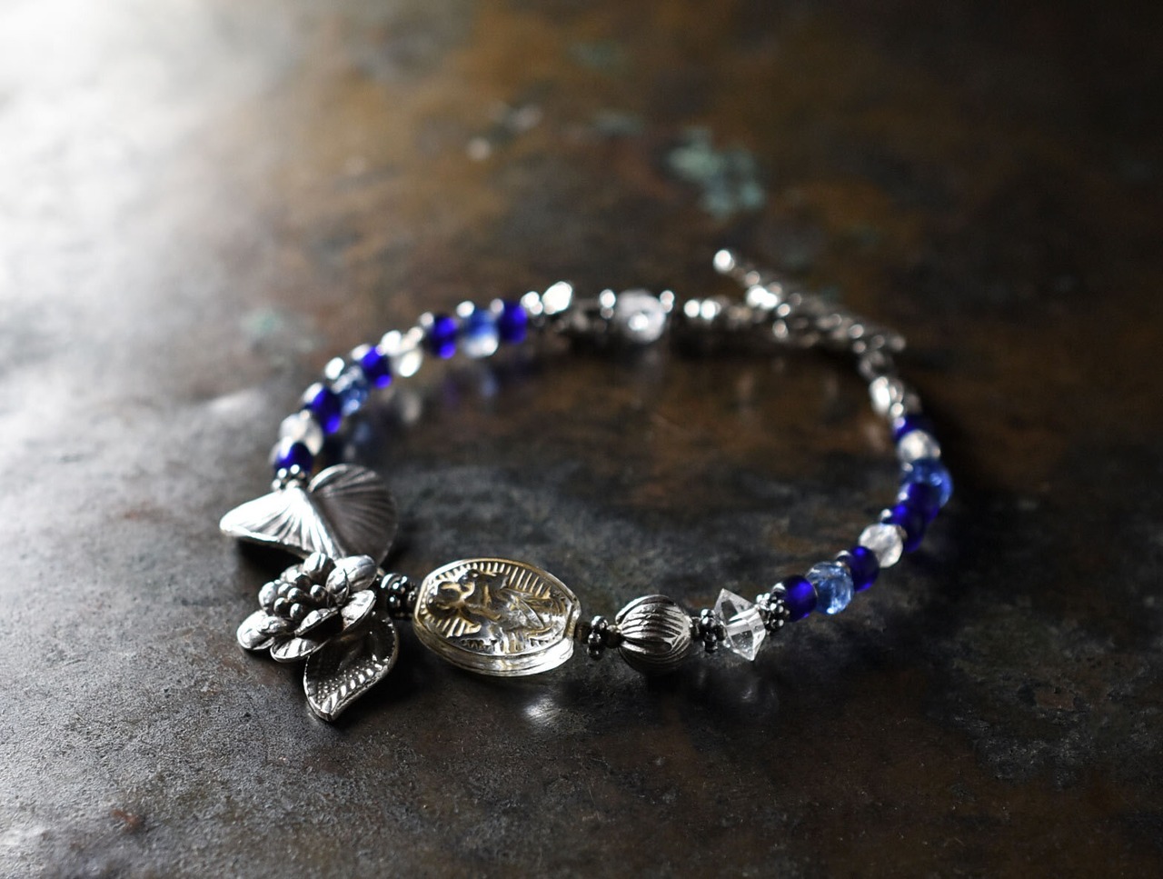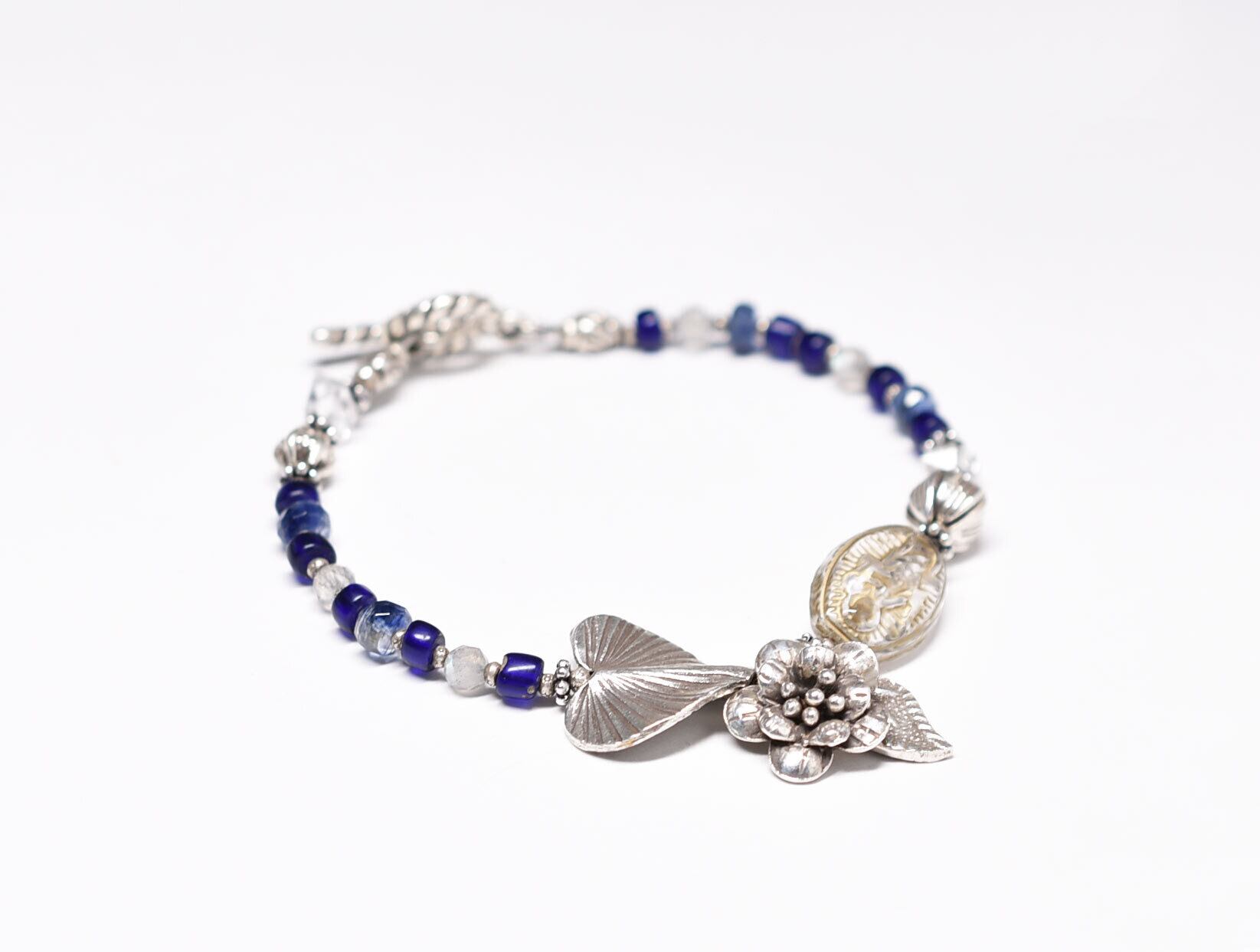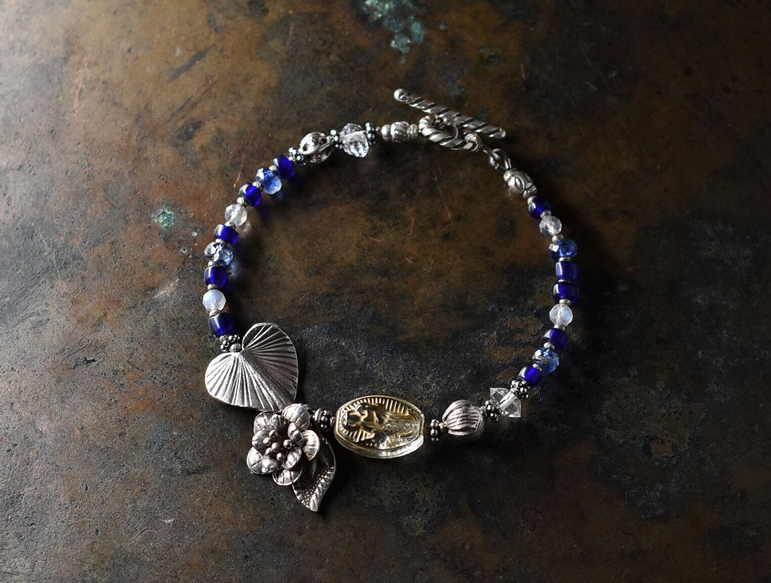 ロザリオパーツとボタニカルなカレンシルバー、瑠璃色アンティークビーズ、ラブラドライトとカイヤナイト、ハーキマーダイヤモンドを繋いだブレスです。
