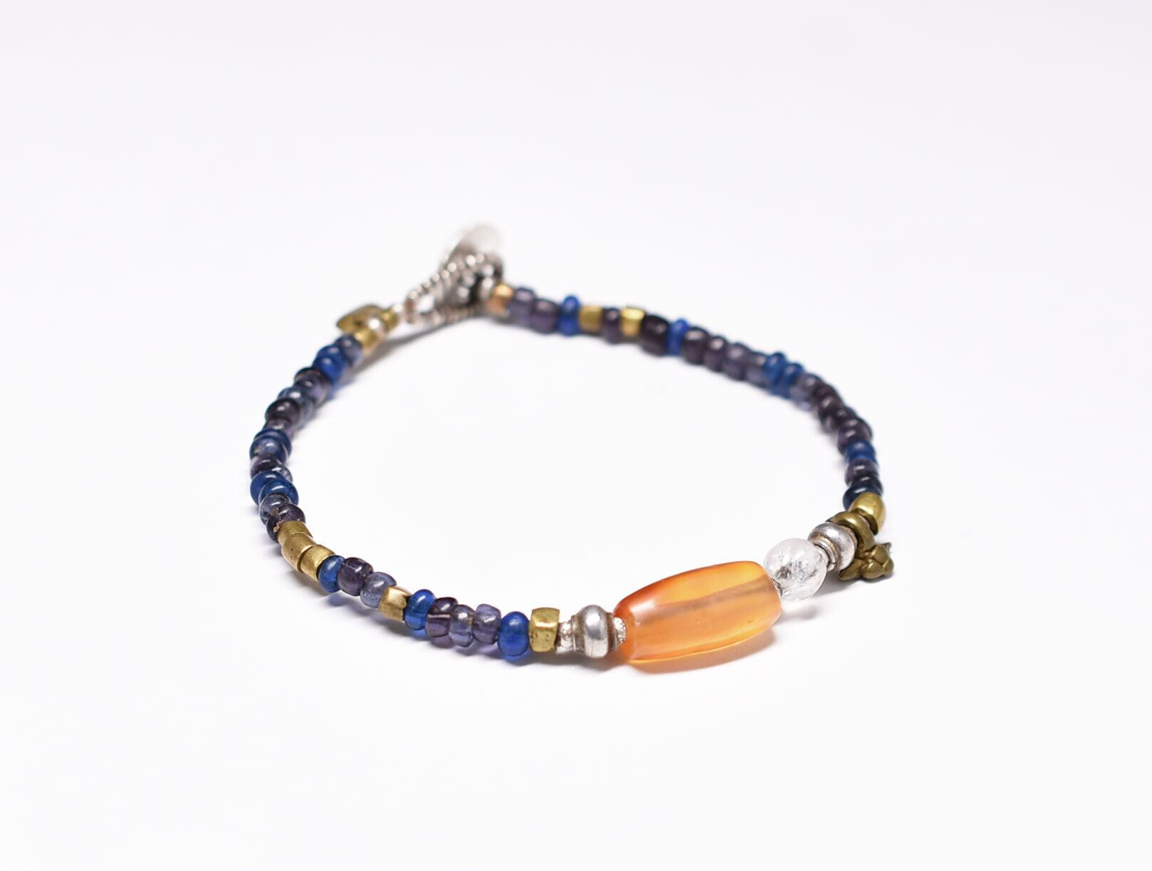 古代カーネリアンと古代水晶、oldチンシルバー&オリッサブラス、ブルー&パープルビーズのブレス