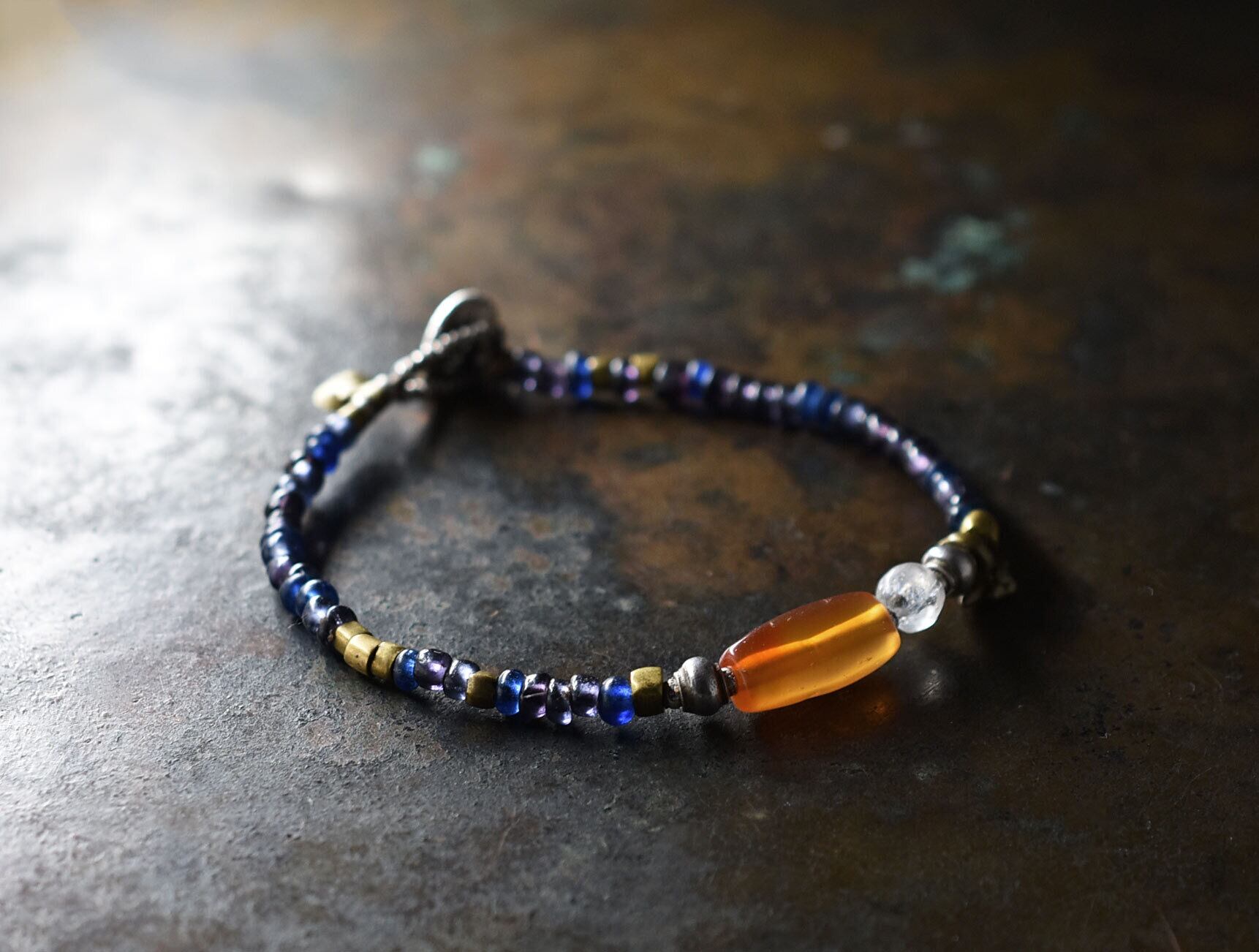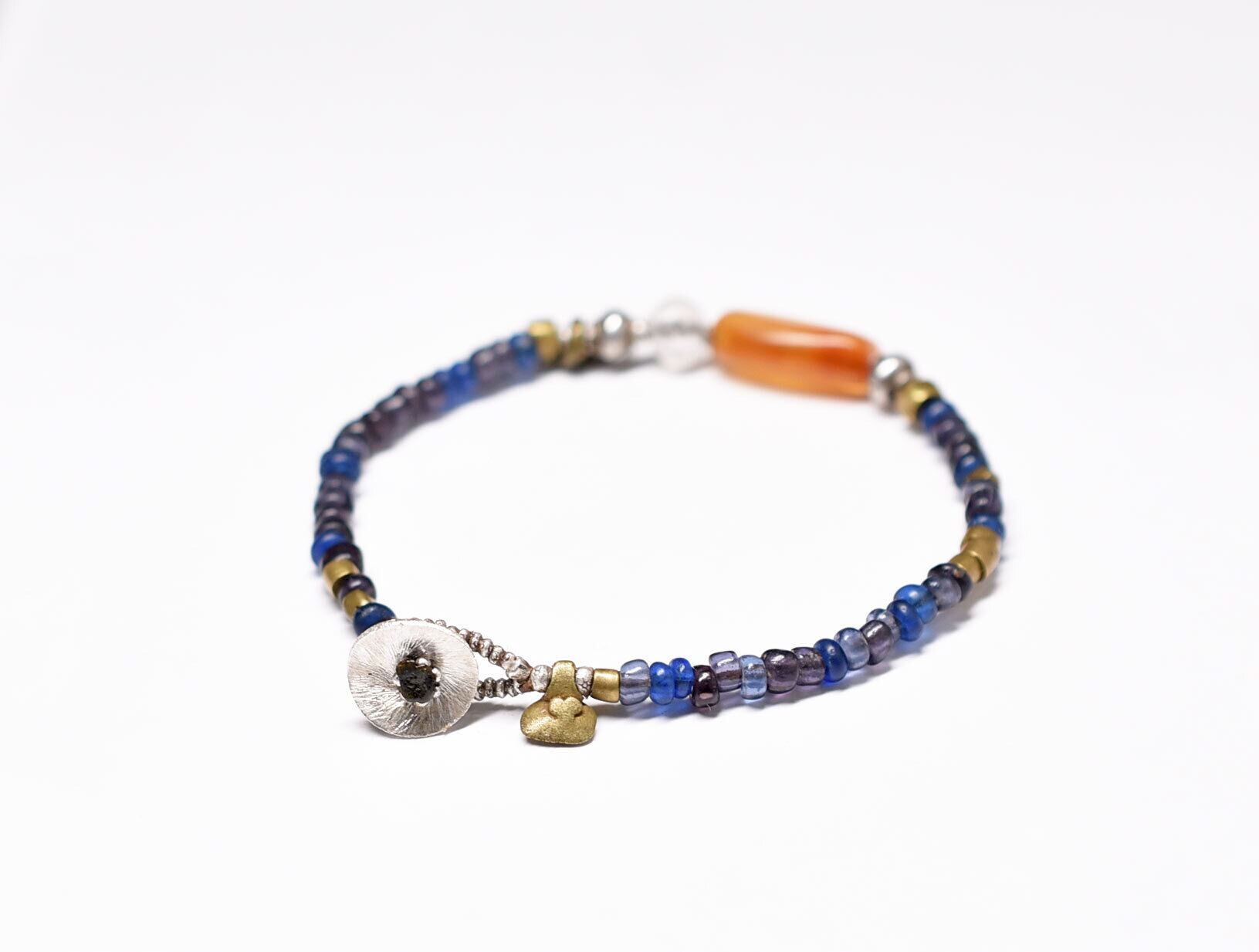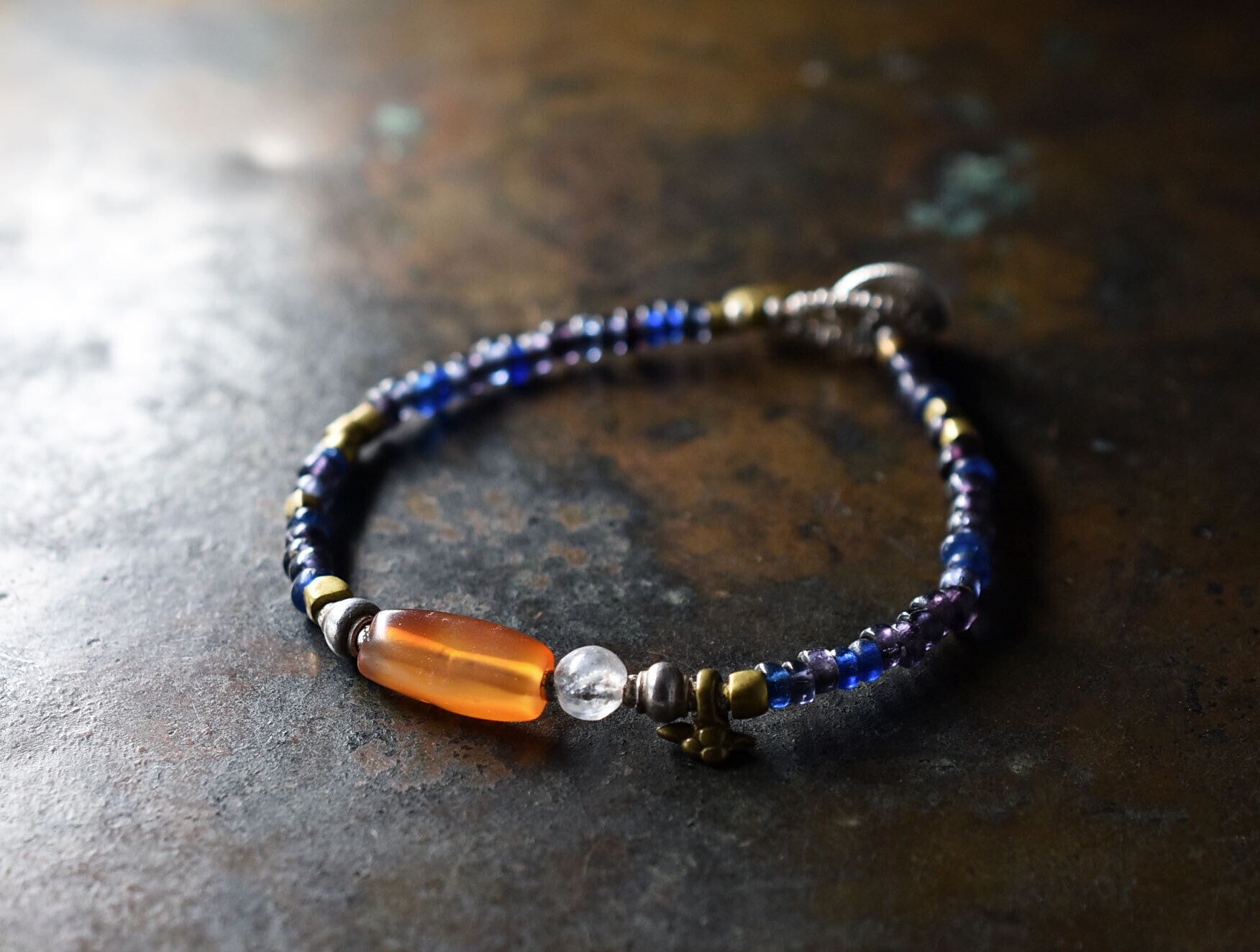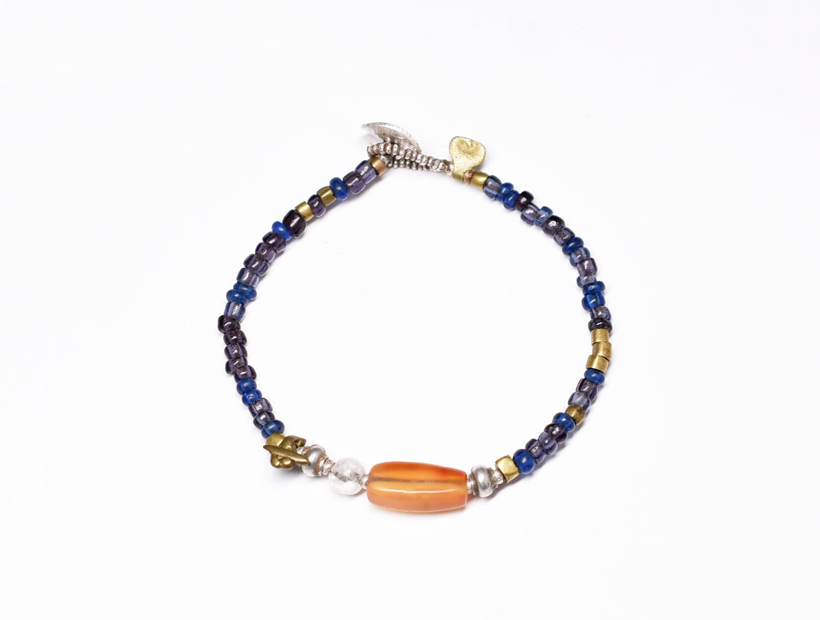 古代カーネリアンと古代水晶、oldチンシルバー&オリッサブラス、ブルー&パープルビーズを繋いだブレスです。