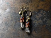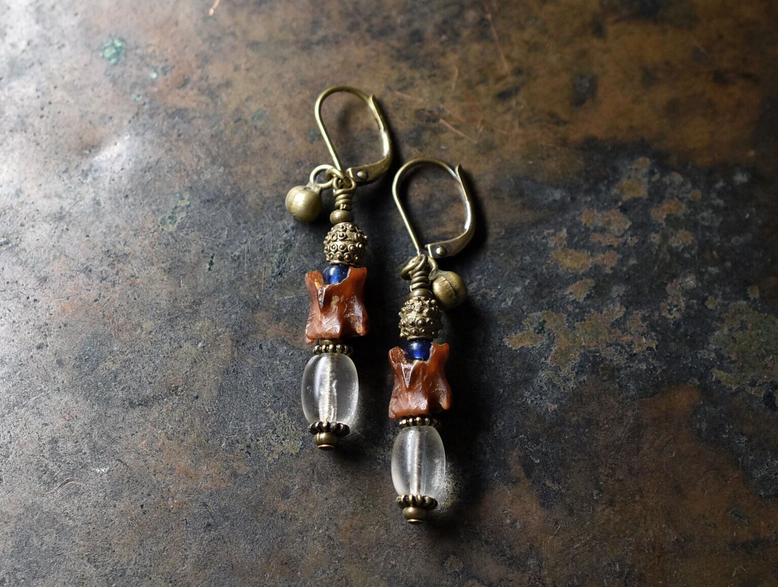 蛇骨とボヘミアビーズ、つぶつぶブラス、ブルーアンティークビーズ民族鈴のピアス