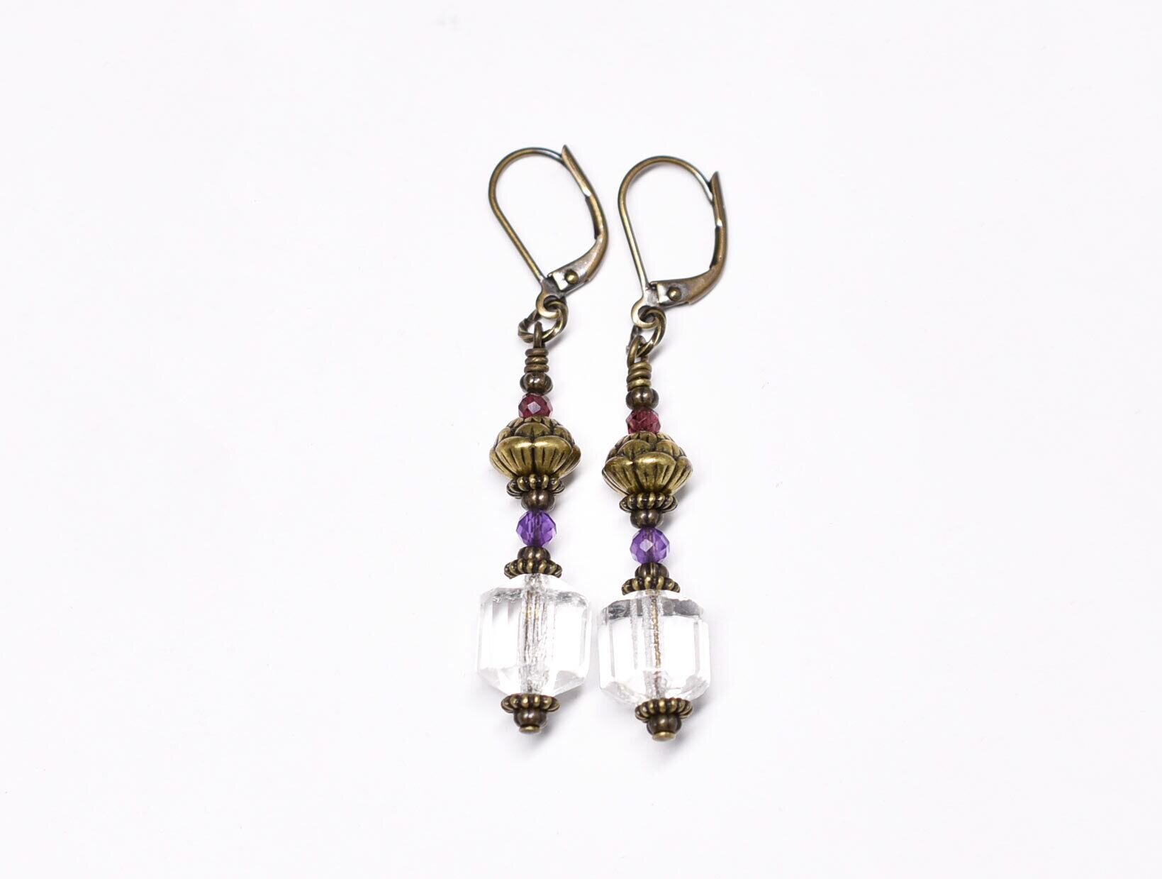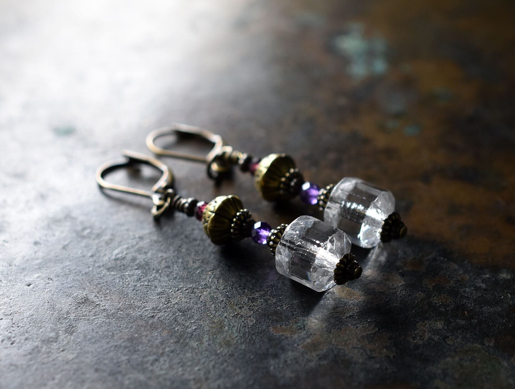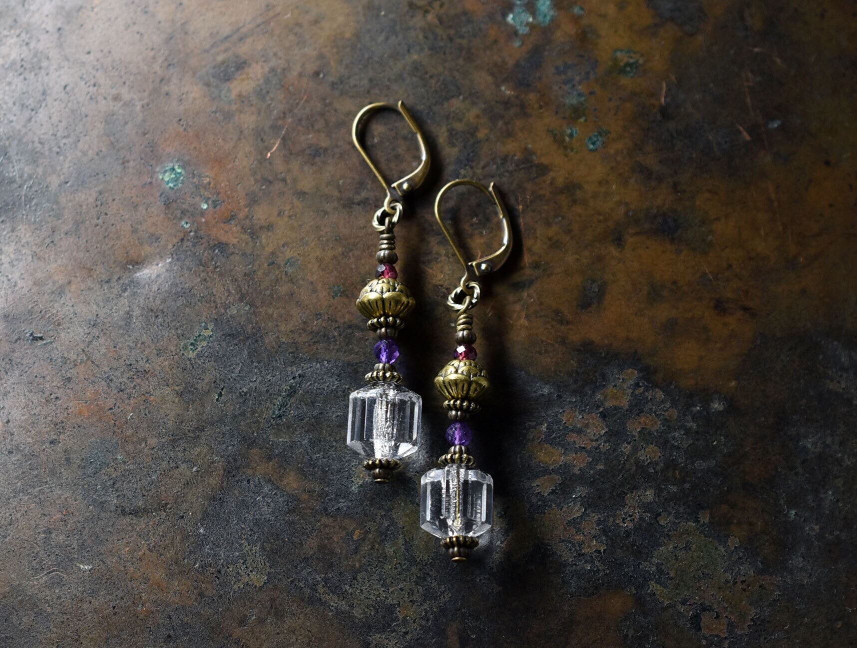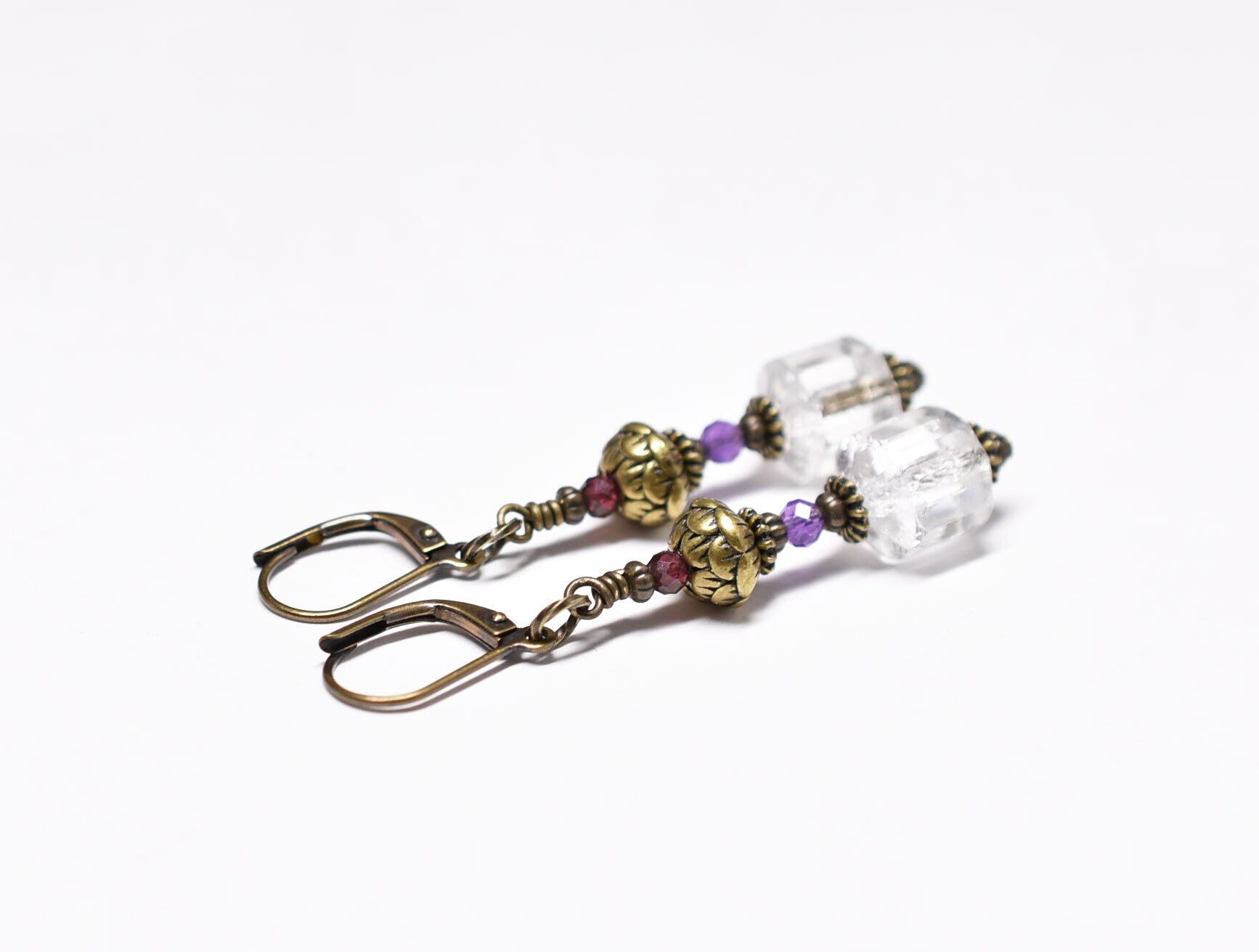 ヴィンテージクリアドイツビーズとガーネットとアメジスト、蓮華ブラスを繋いだピアスです。