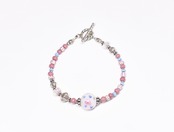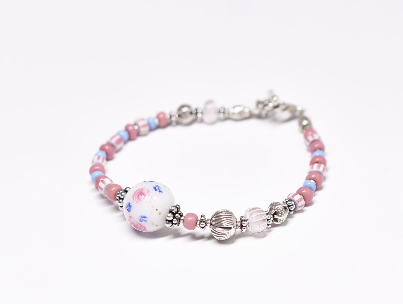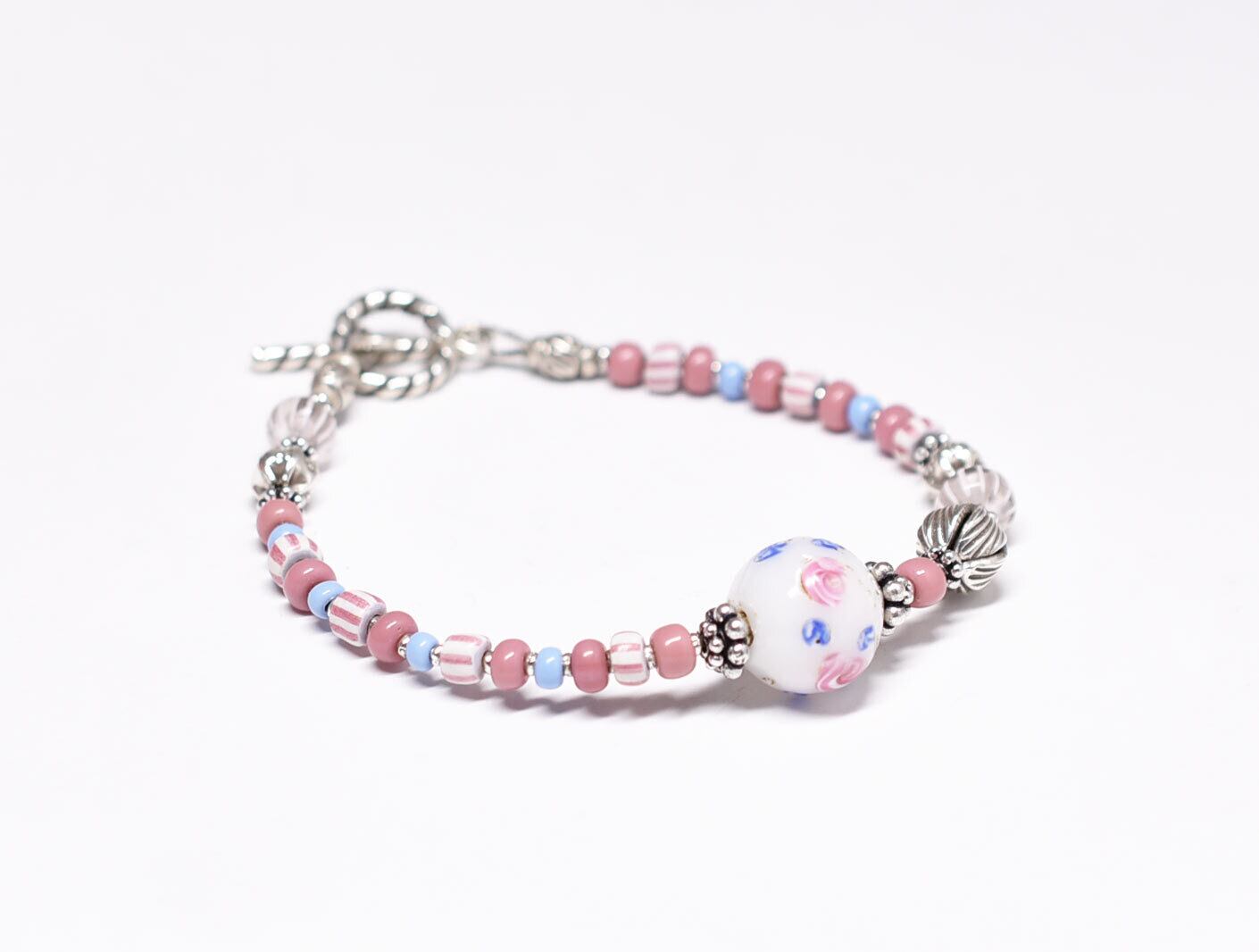 ヴェネチアアンティーク薔薇と勿忘草ビーズとグーズベリー、カレンシルバー、シャーベットカラービーズのブレス