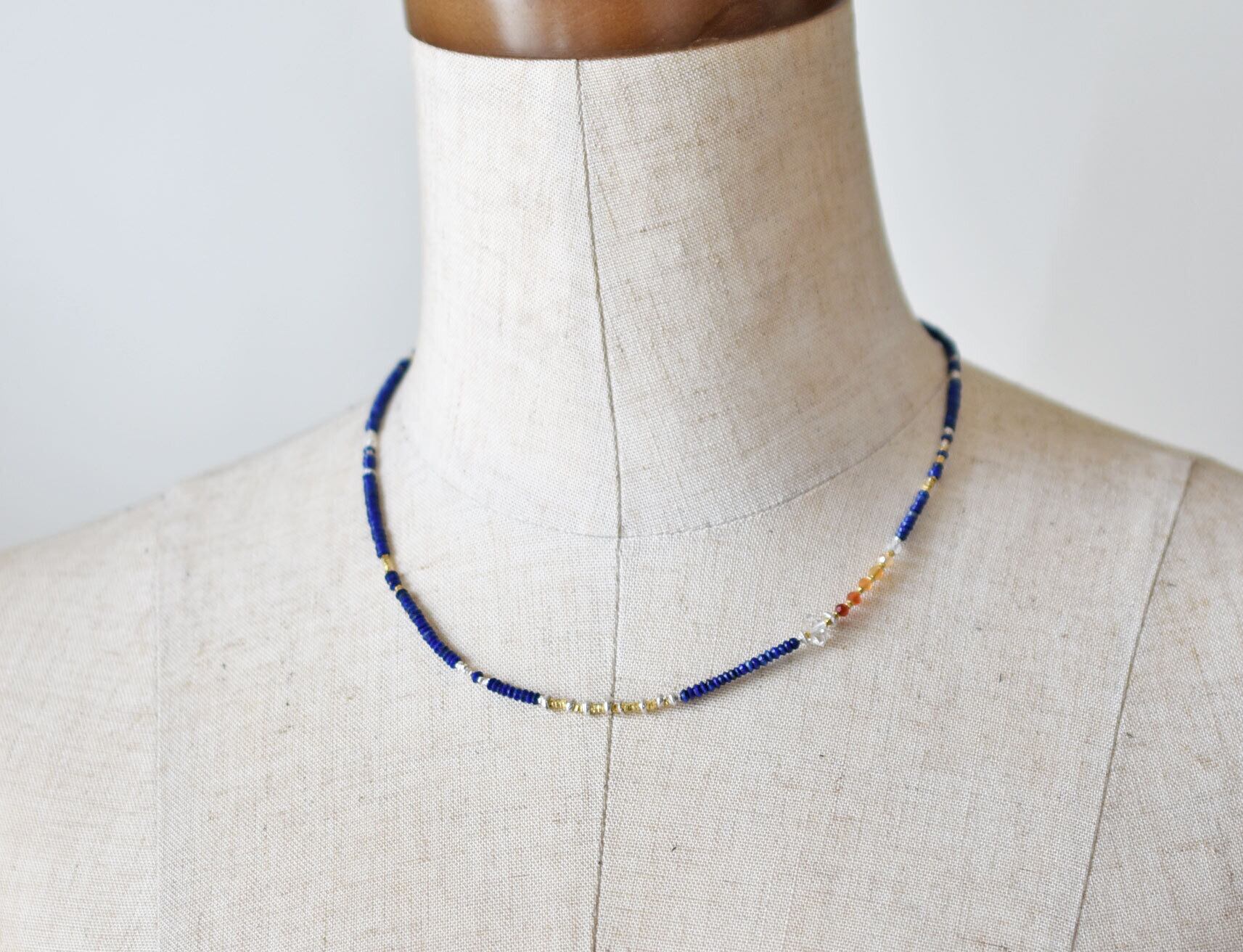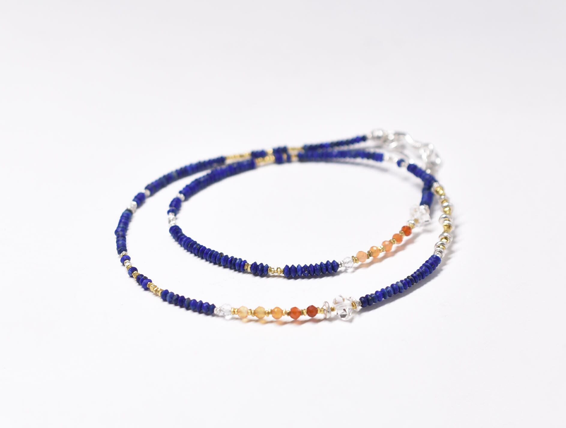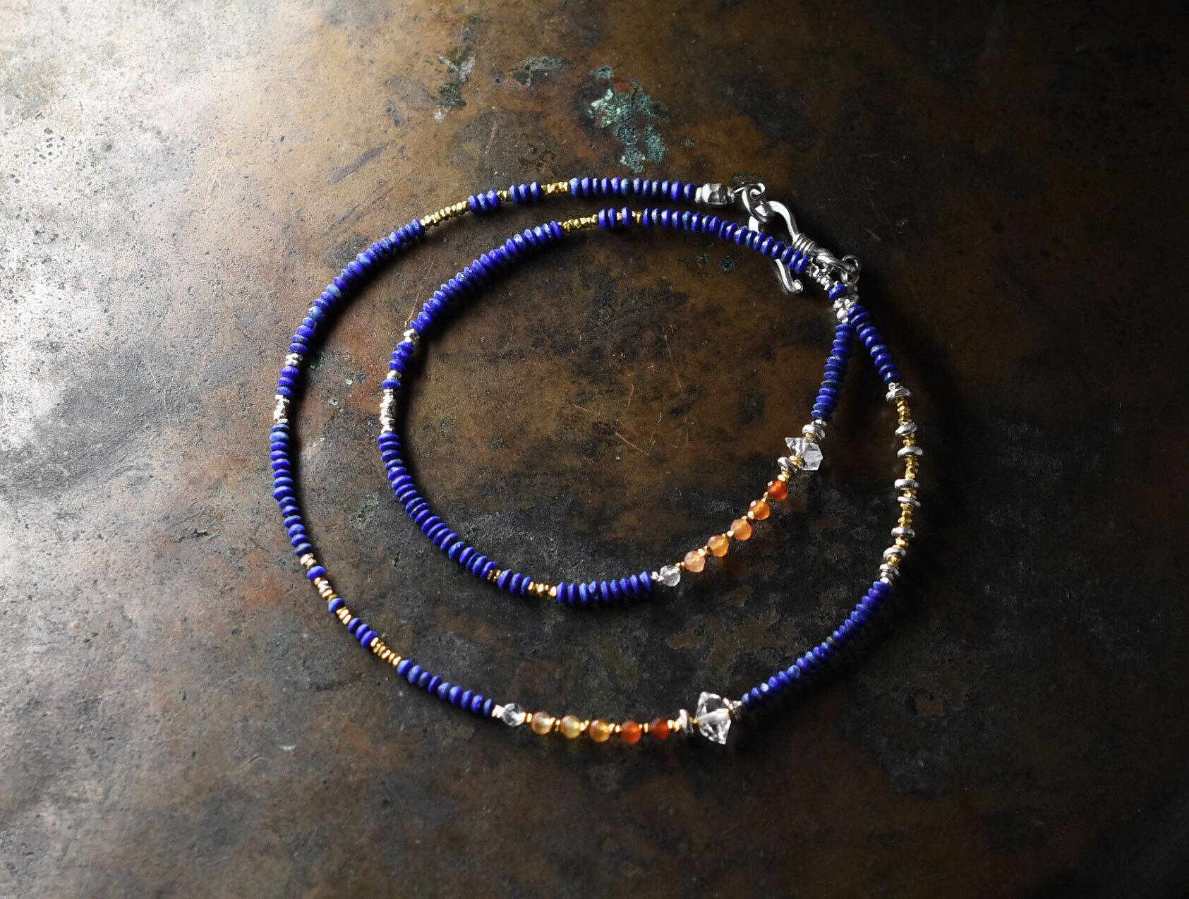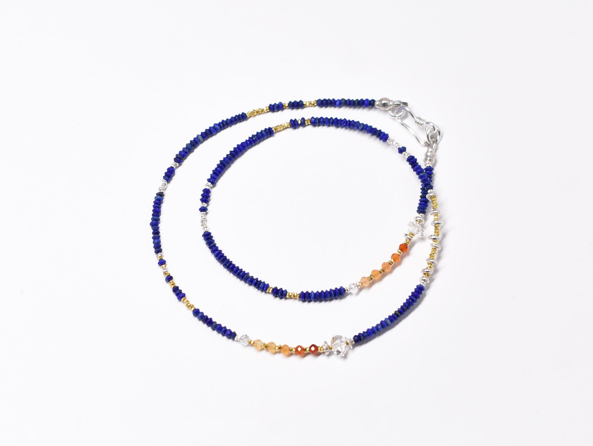 ラピスと、カーネリアンなどの小さな天然石、ハーキマーダイヤモンド、カレンシルバーを繋いだ華奢なネックレスです。