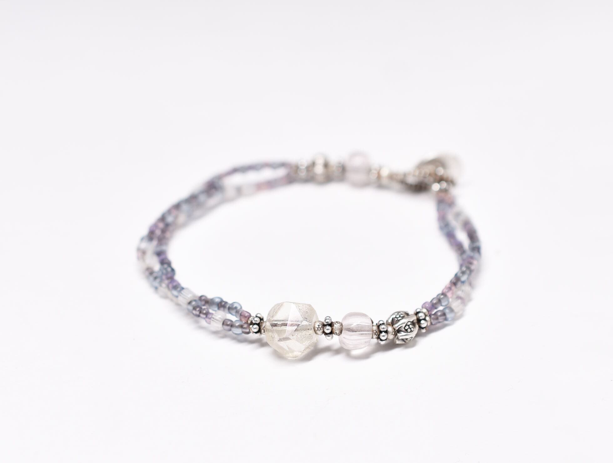 ヴィンテージオーロラチェコビーズとグーズベリー、フランスのヴィンテージビーズ、カレンシルバーなどを繋いだ2連のブレスです。