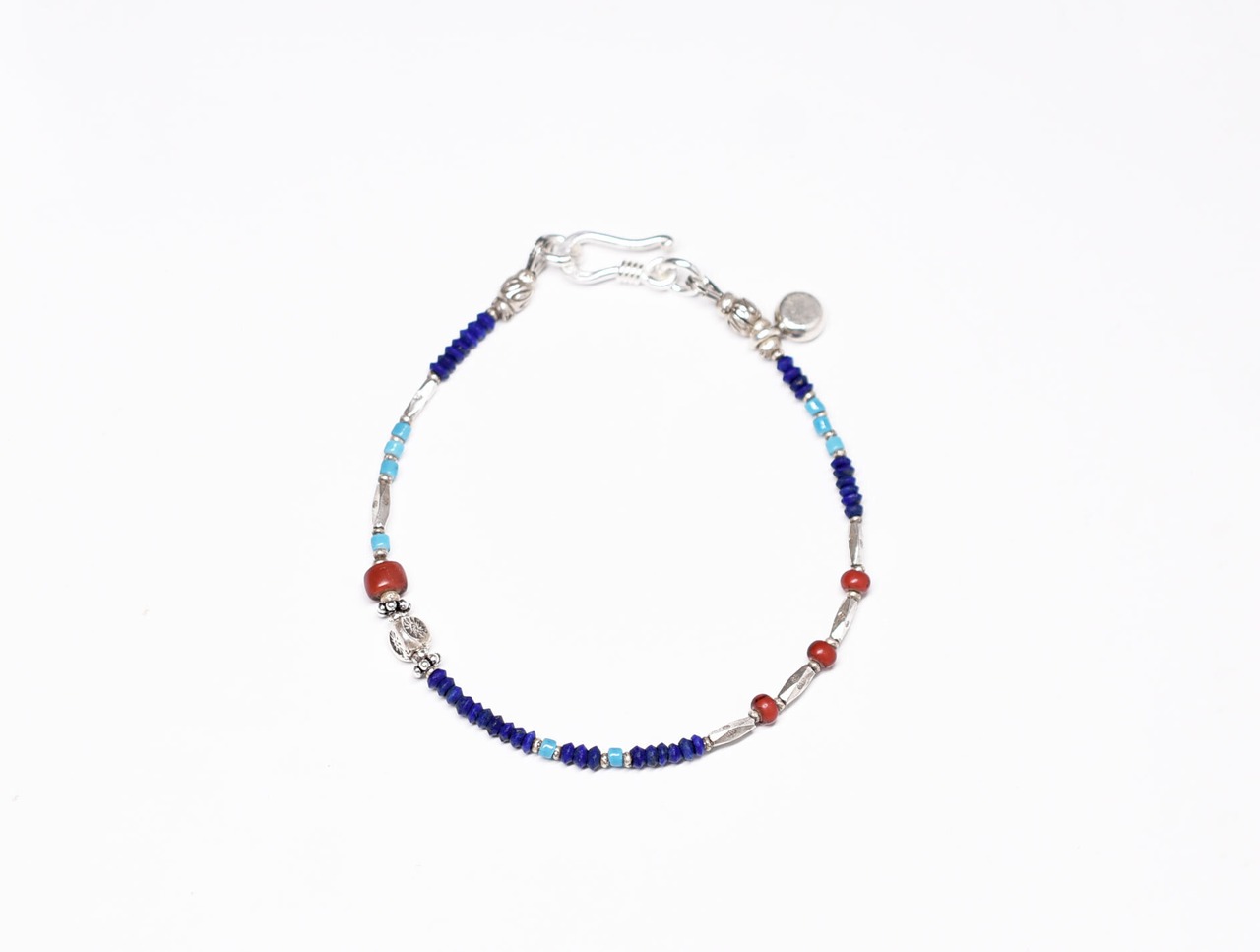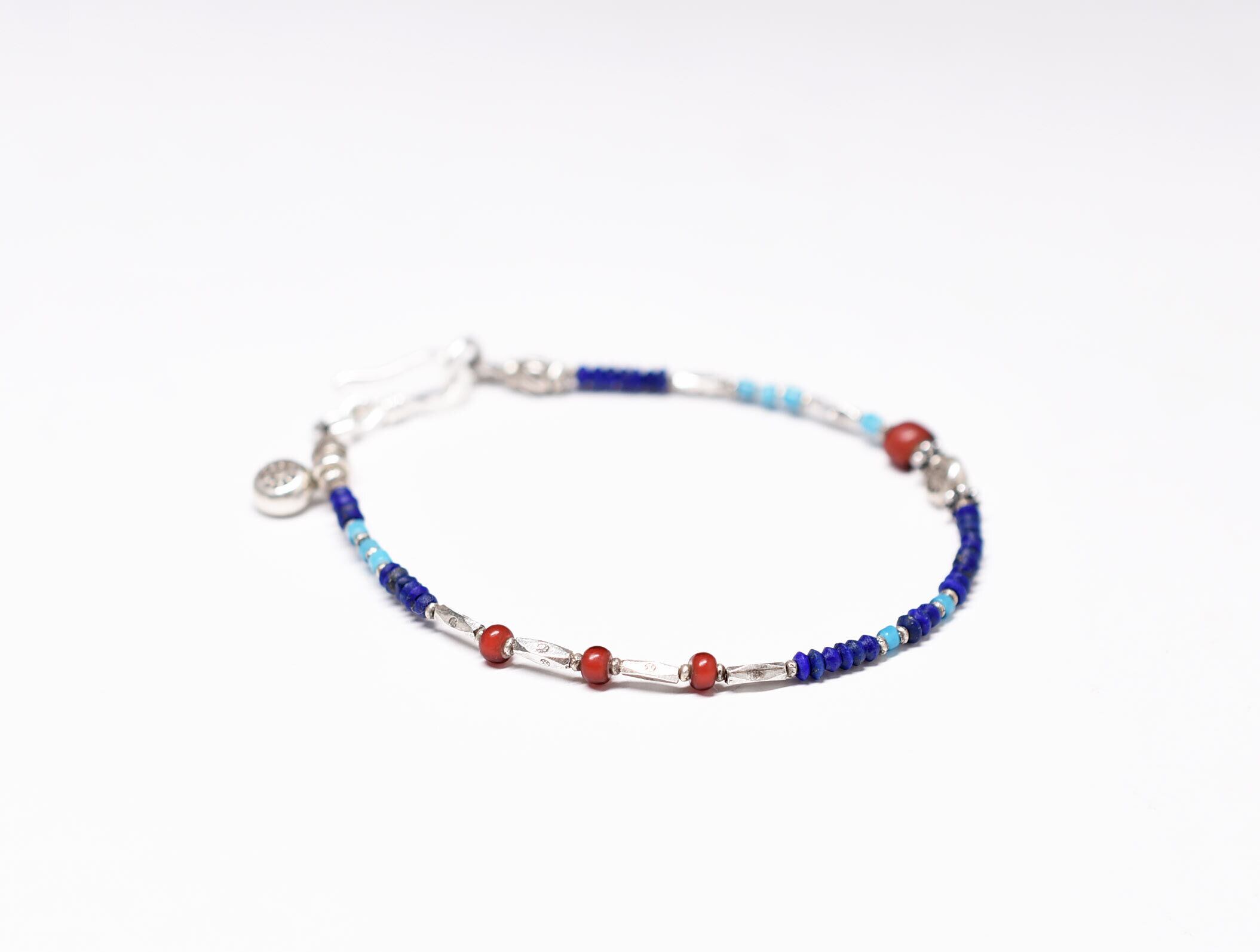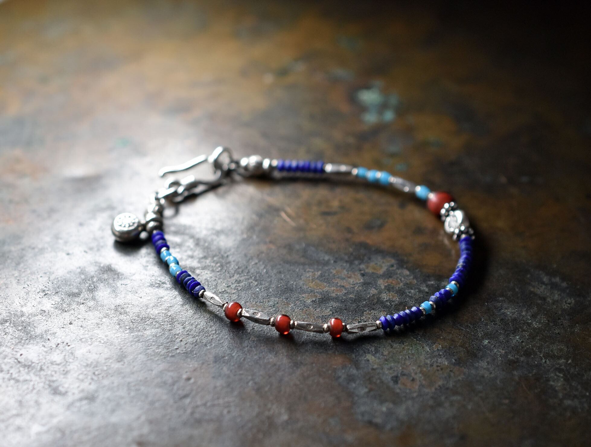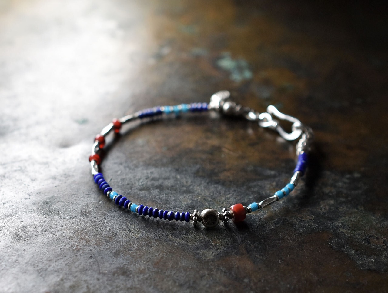 ラピスとターコイズブルー&金赤ホワイトハーツ 、カレンシルバーの華奢なブレス
