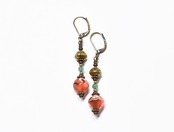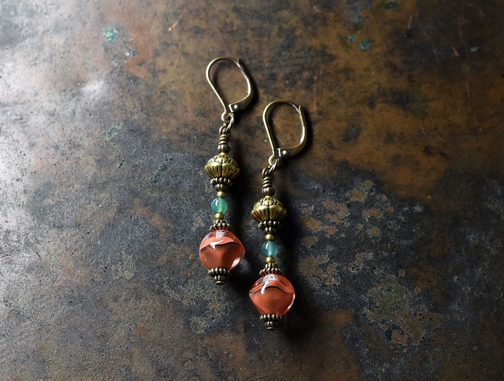 茜色ドイツヴィンテージとグリーン瑪瑙、蓮華ブラスを繋いだピアスです。
