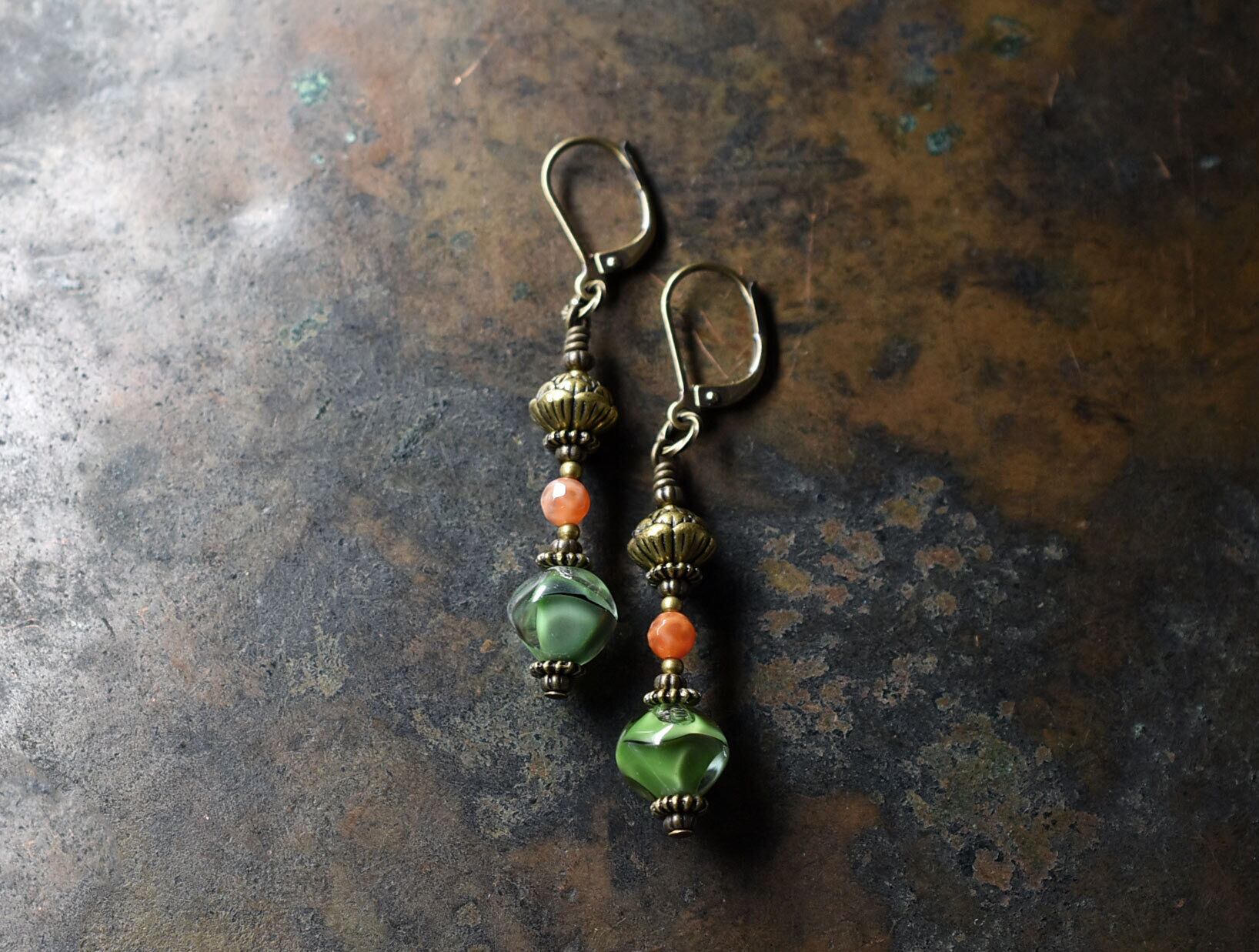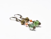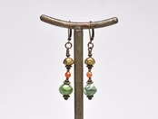 若草色ドイツヴィンテージとファイヤーアゲート、蓮華ブラスを繋いだピアスです。