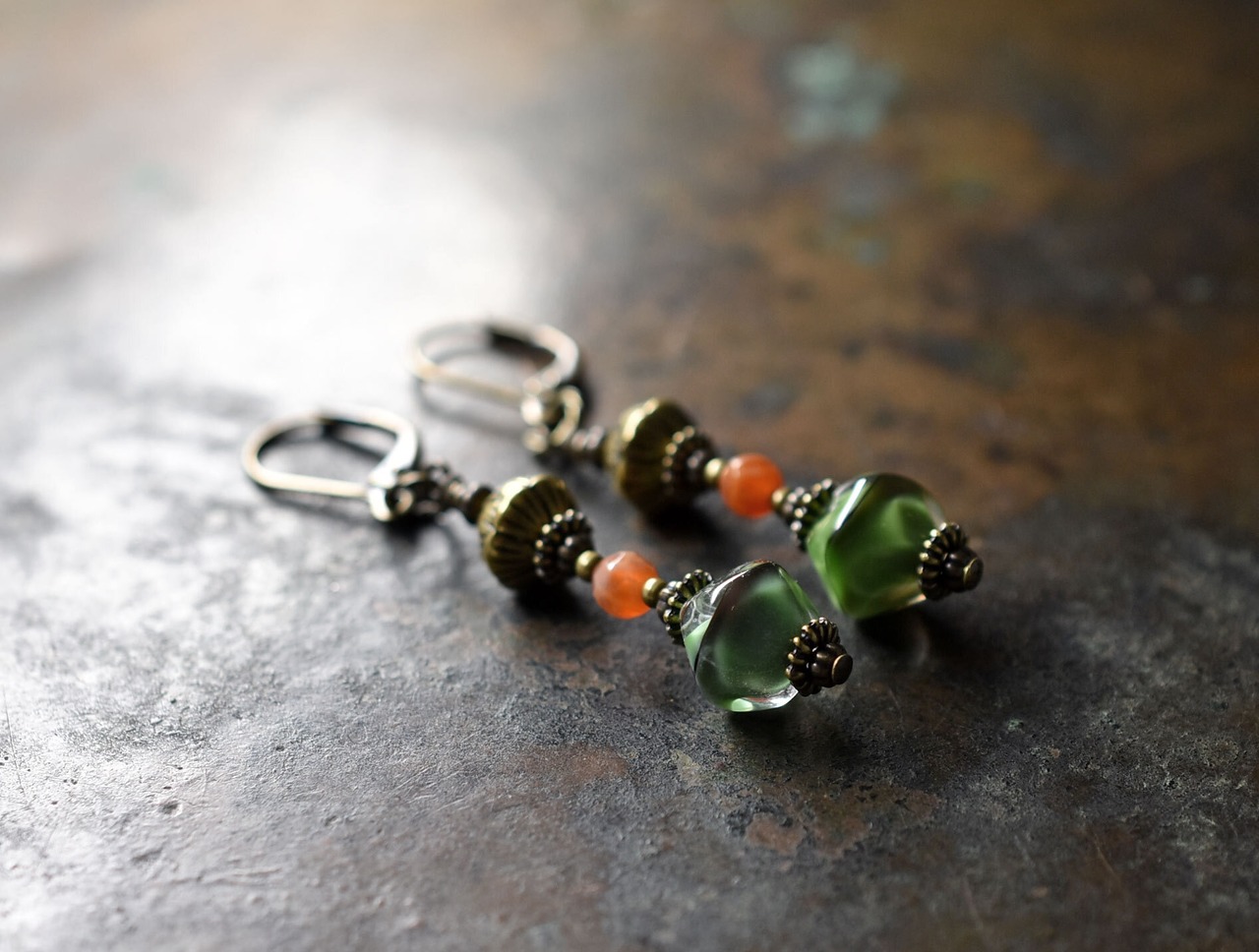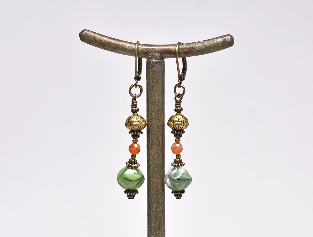 若草色ドイツヴィンテージとファイヤーアゲート、蓮華ブラスのピアス