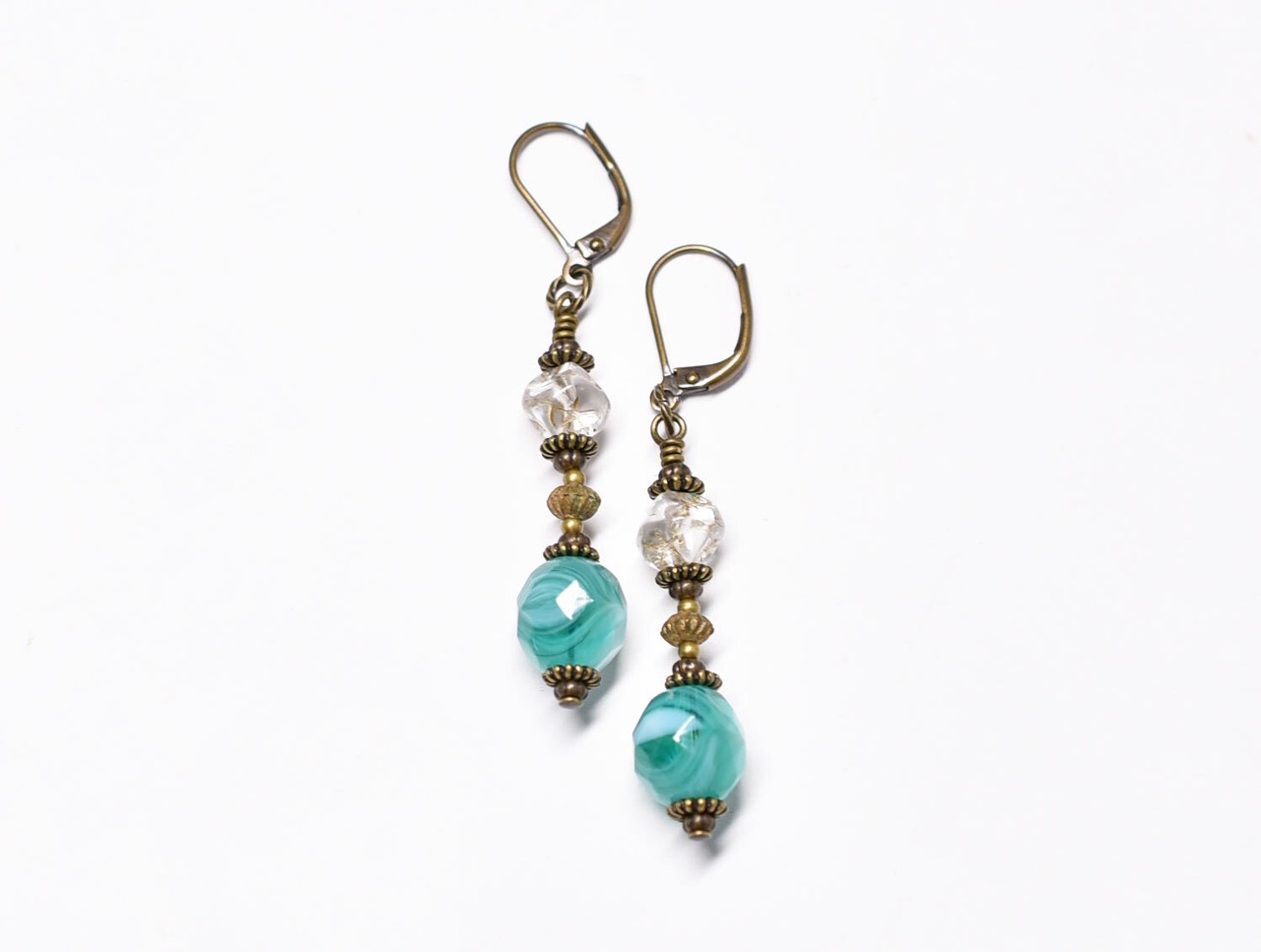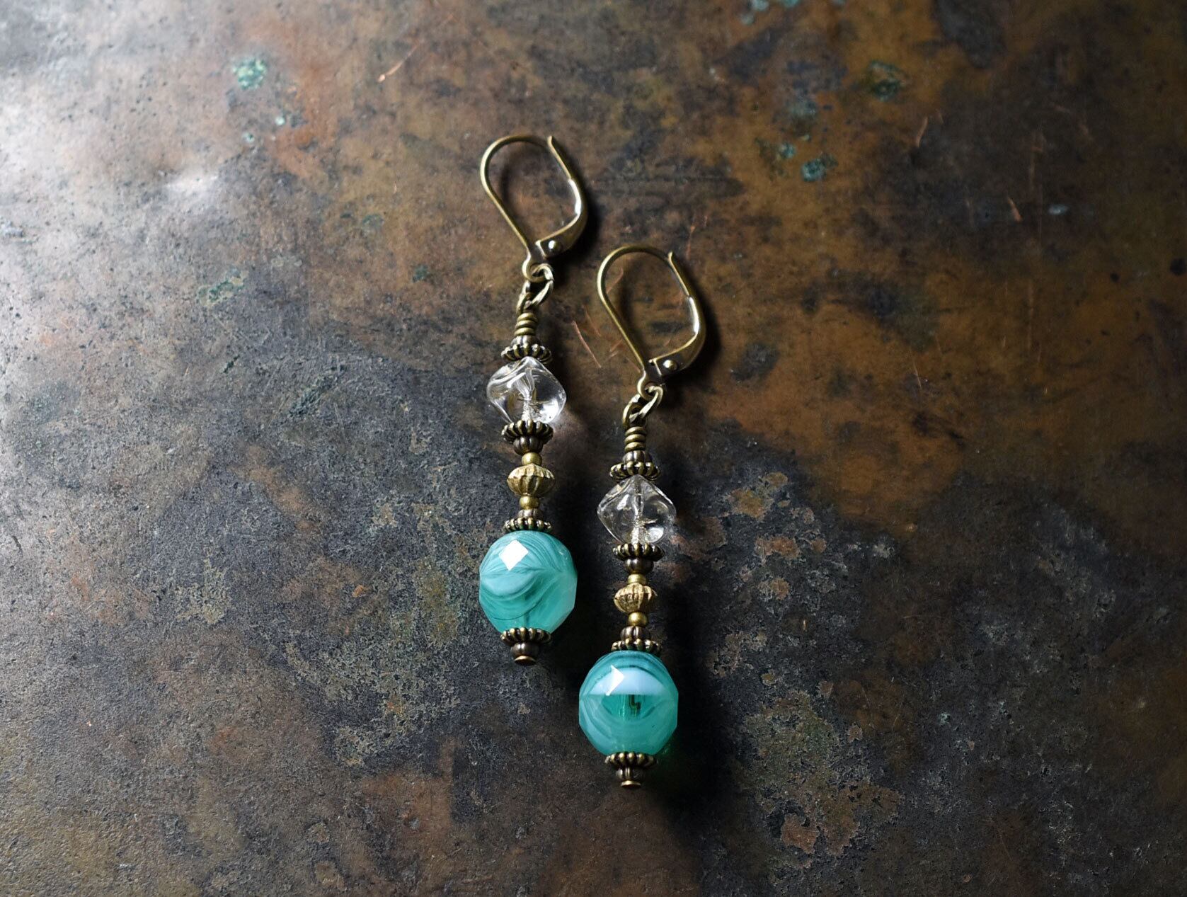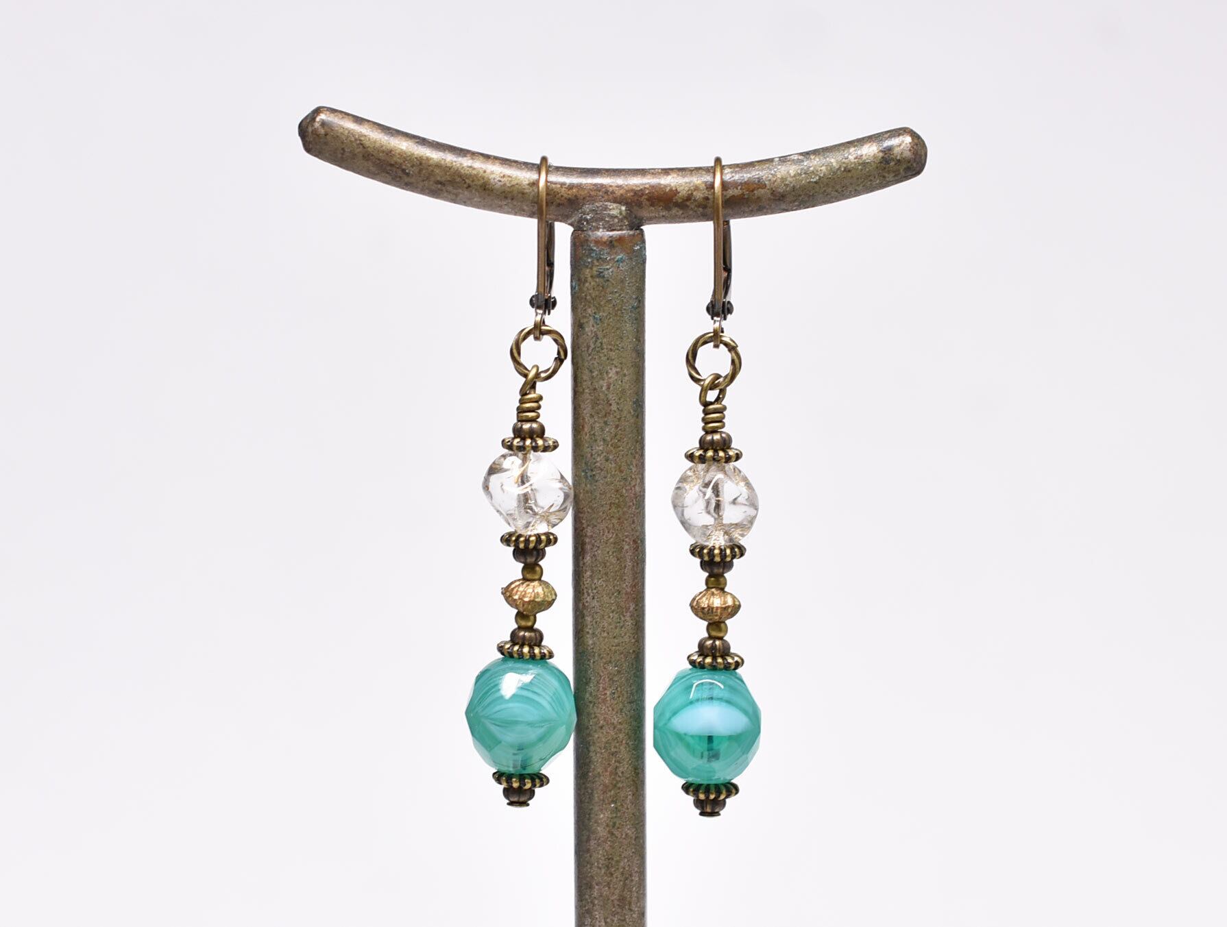 エメラルドグリーンチェコビーズとブラスビーズ、星模様ヴィンテージビーズを繋いだピアスです。