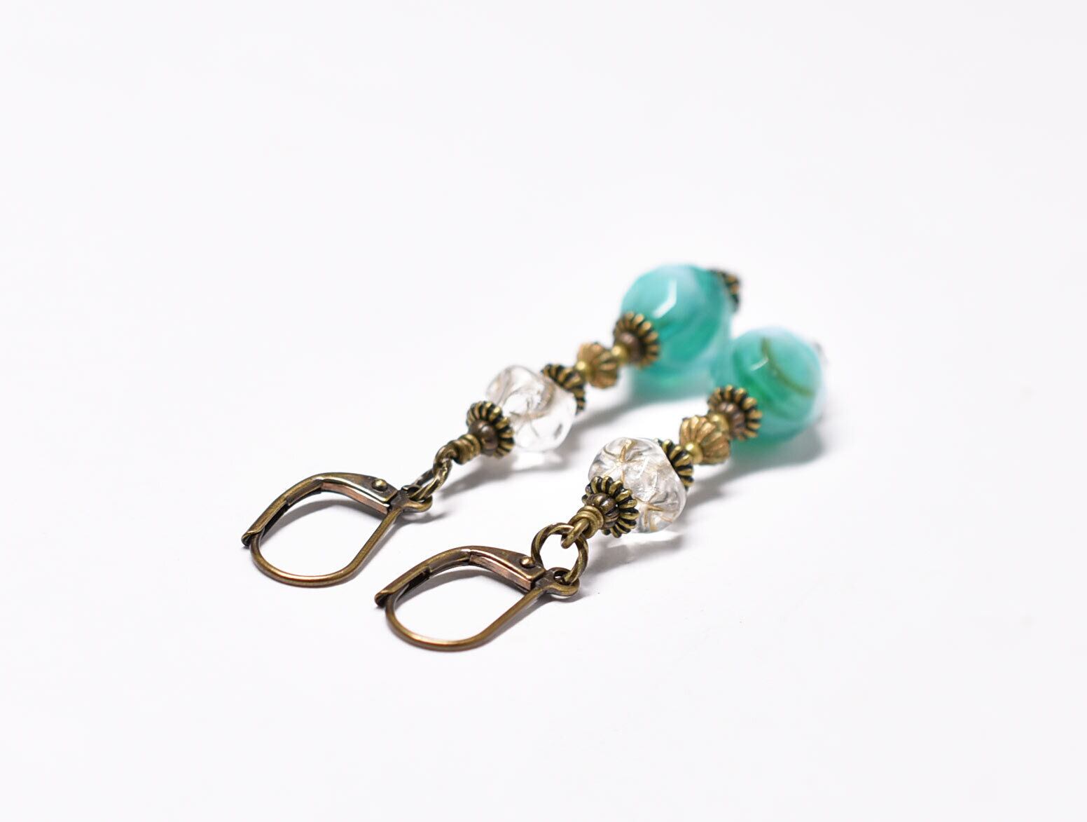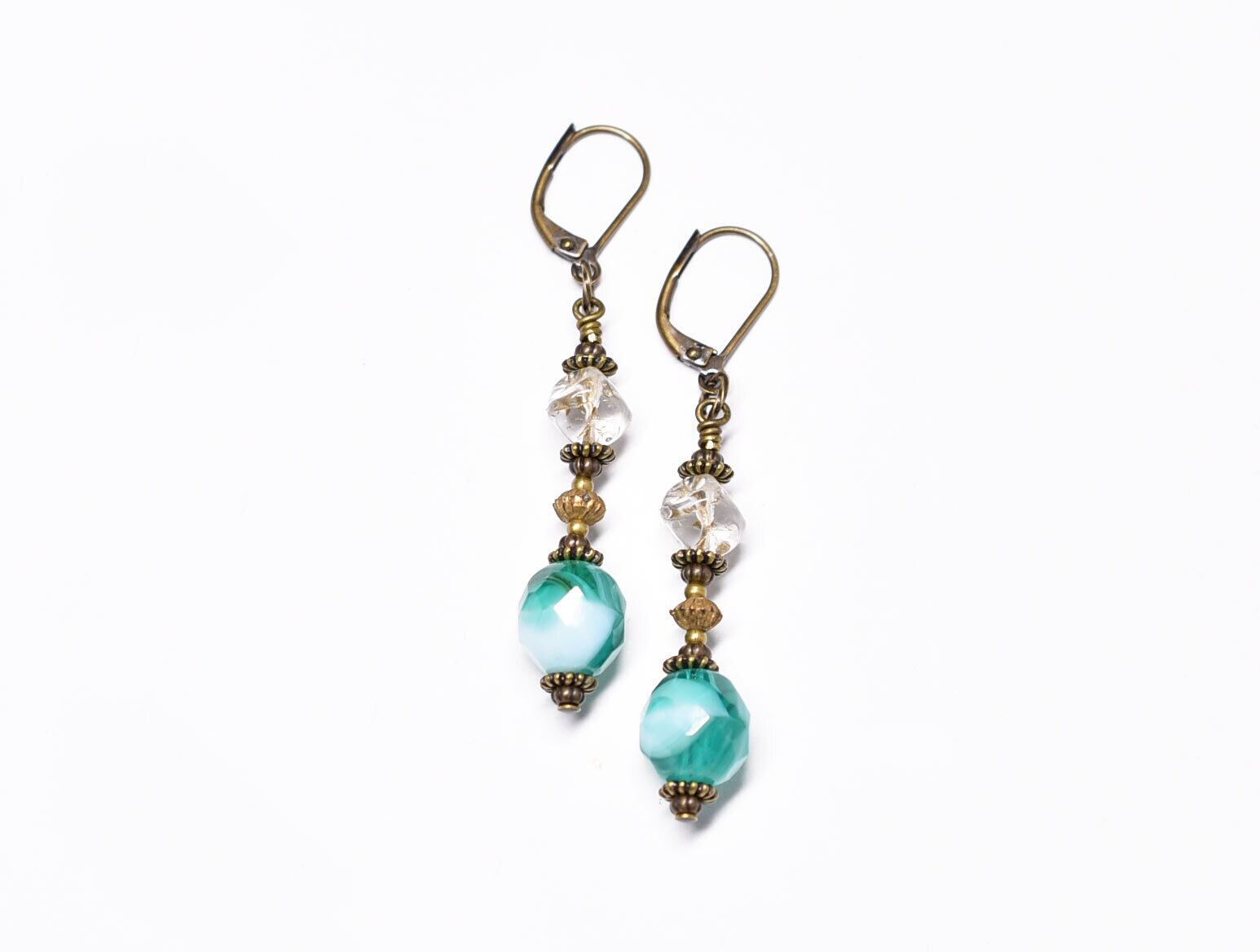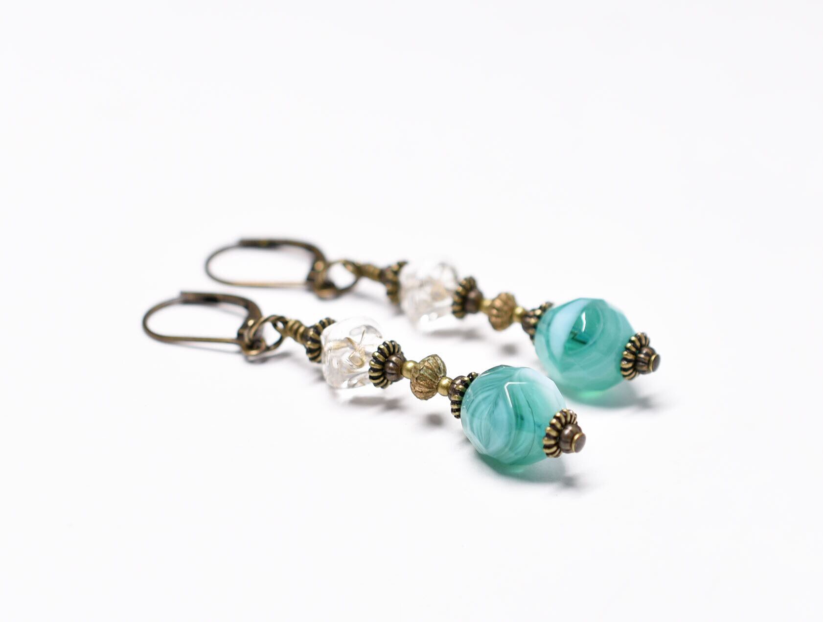 エメラルドグリーンチェコビーズとブラスビーズ、星模様ヴィンテージビーズを繋いだピアスです。