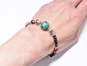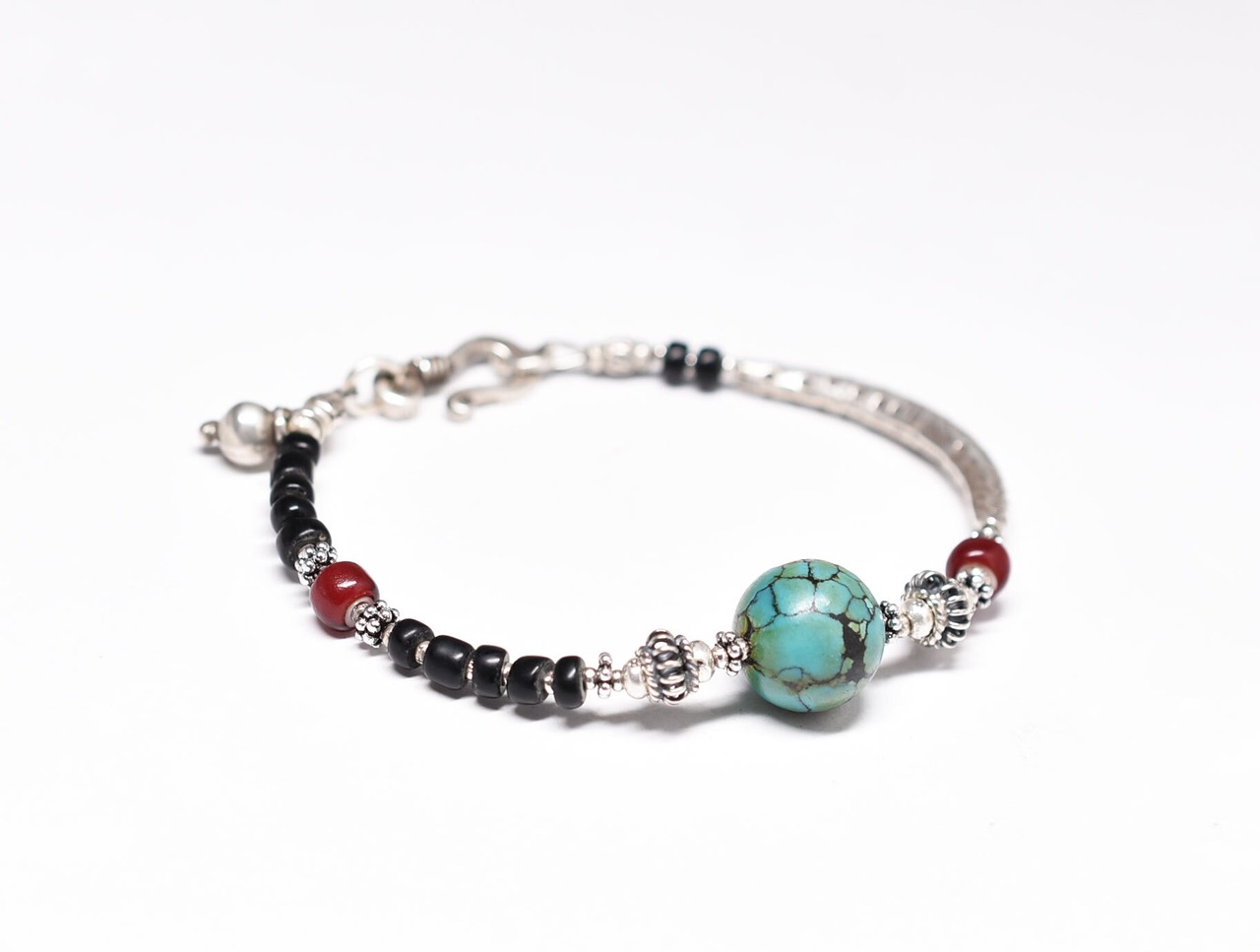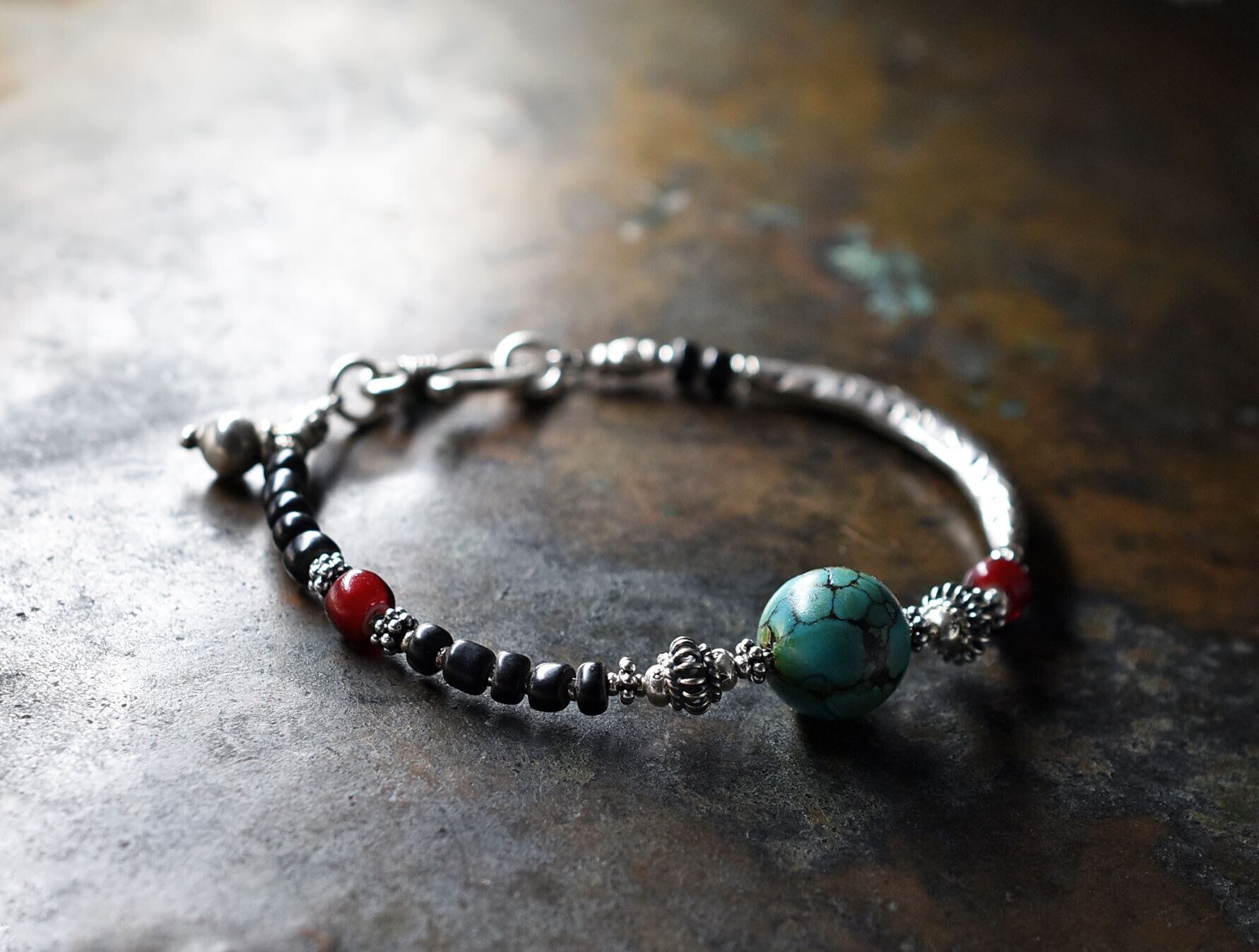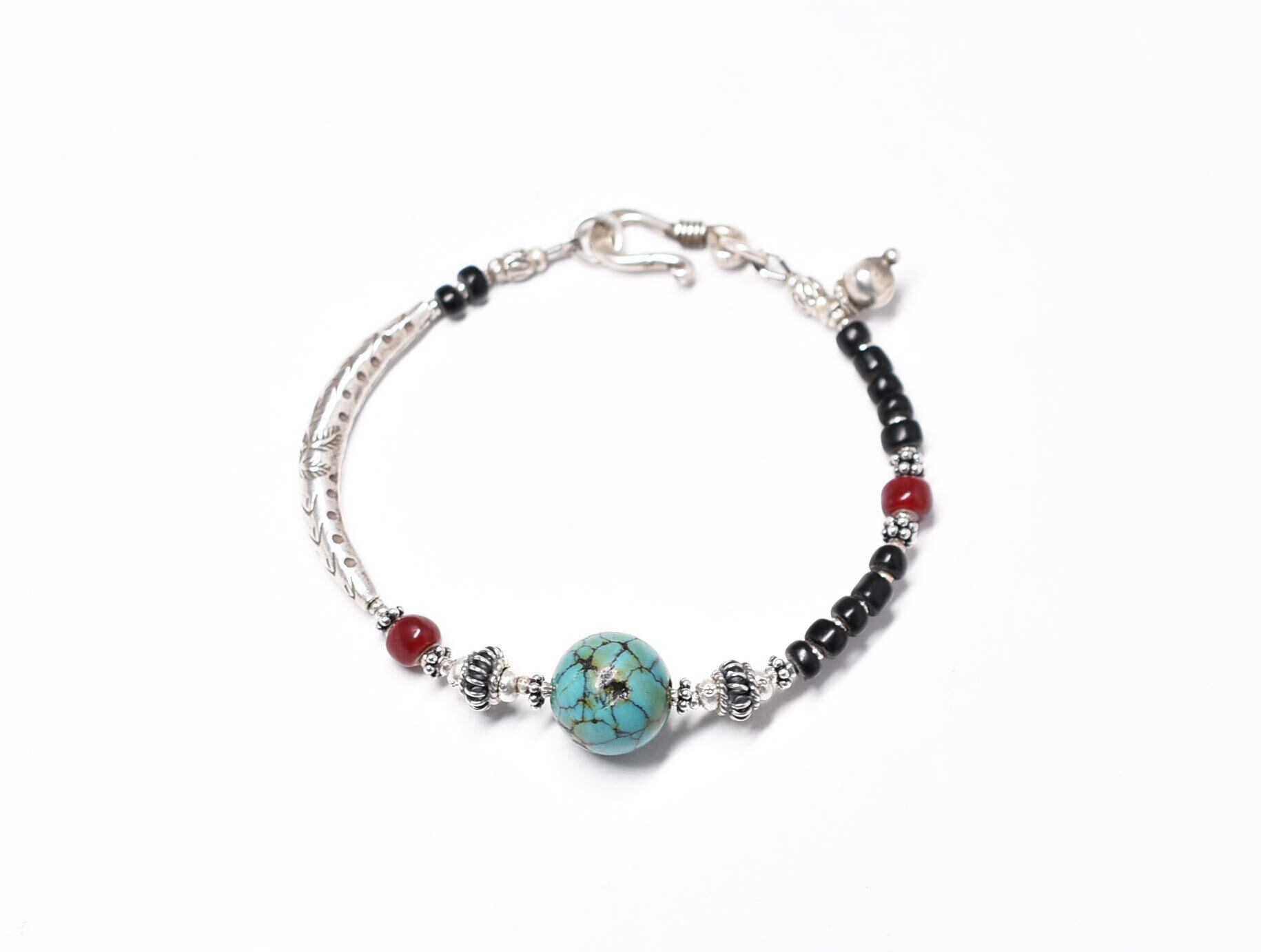 まん丸チベタンターコイズを中心に、濃赤ホワイトハーツ、湾曲したカレンシルバー、漆黒アンティークビーズなどで繋いだブレスです。