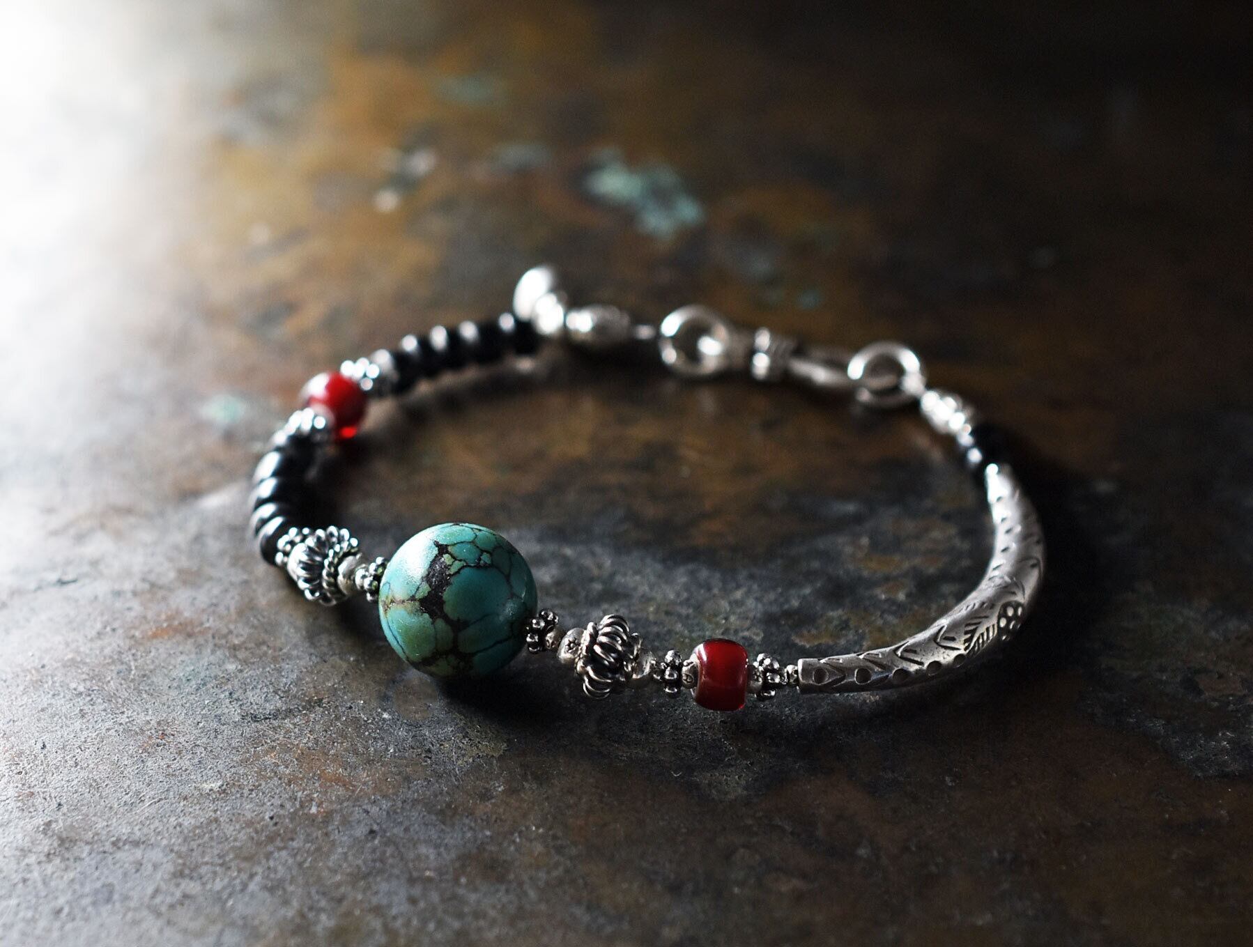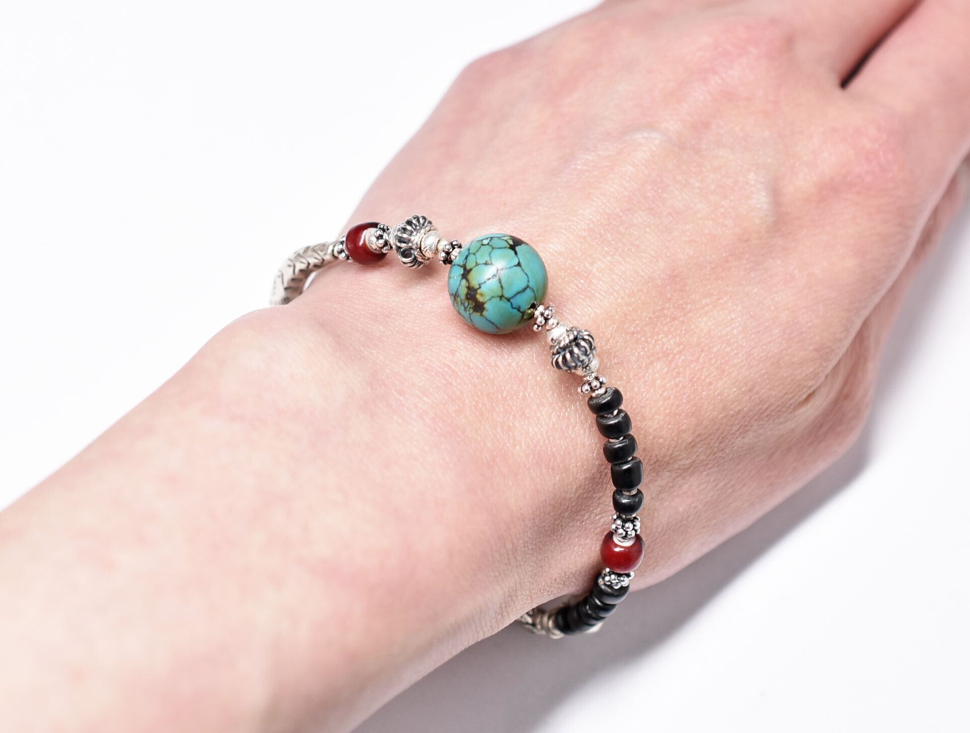 まん丸チベタンターコイズと濃赤ホワイトハーツ、湾曲カレンシルバー、漆黒アンティークビーズのブレス