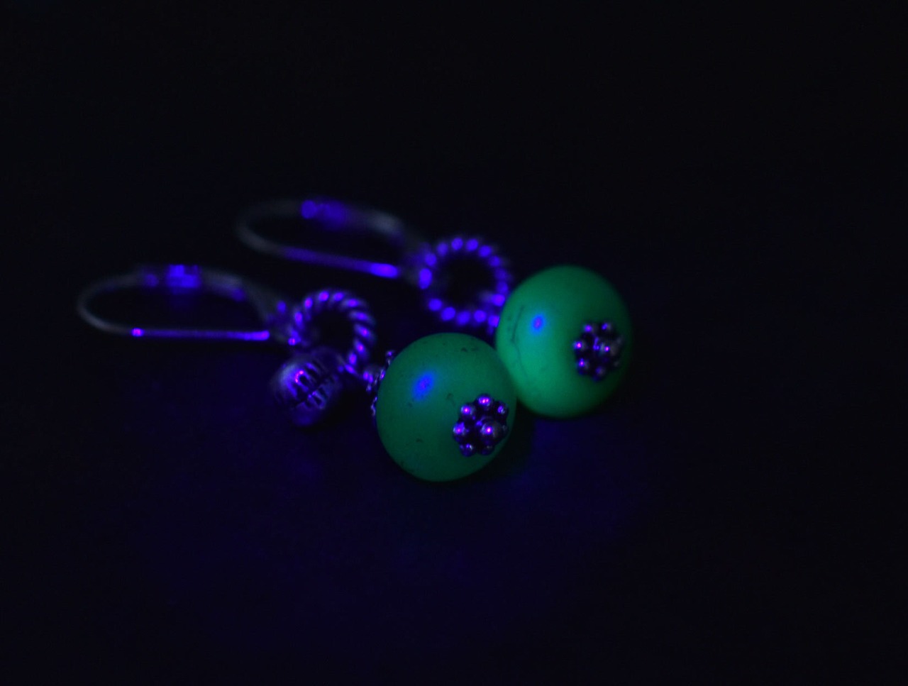 独特な乳白色のセミクリアグリーンのビーズは、極々微量のウランで発色させています。ブラックライトを当てると光ります!