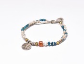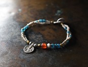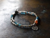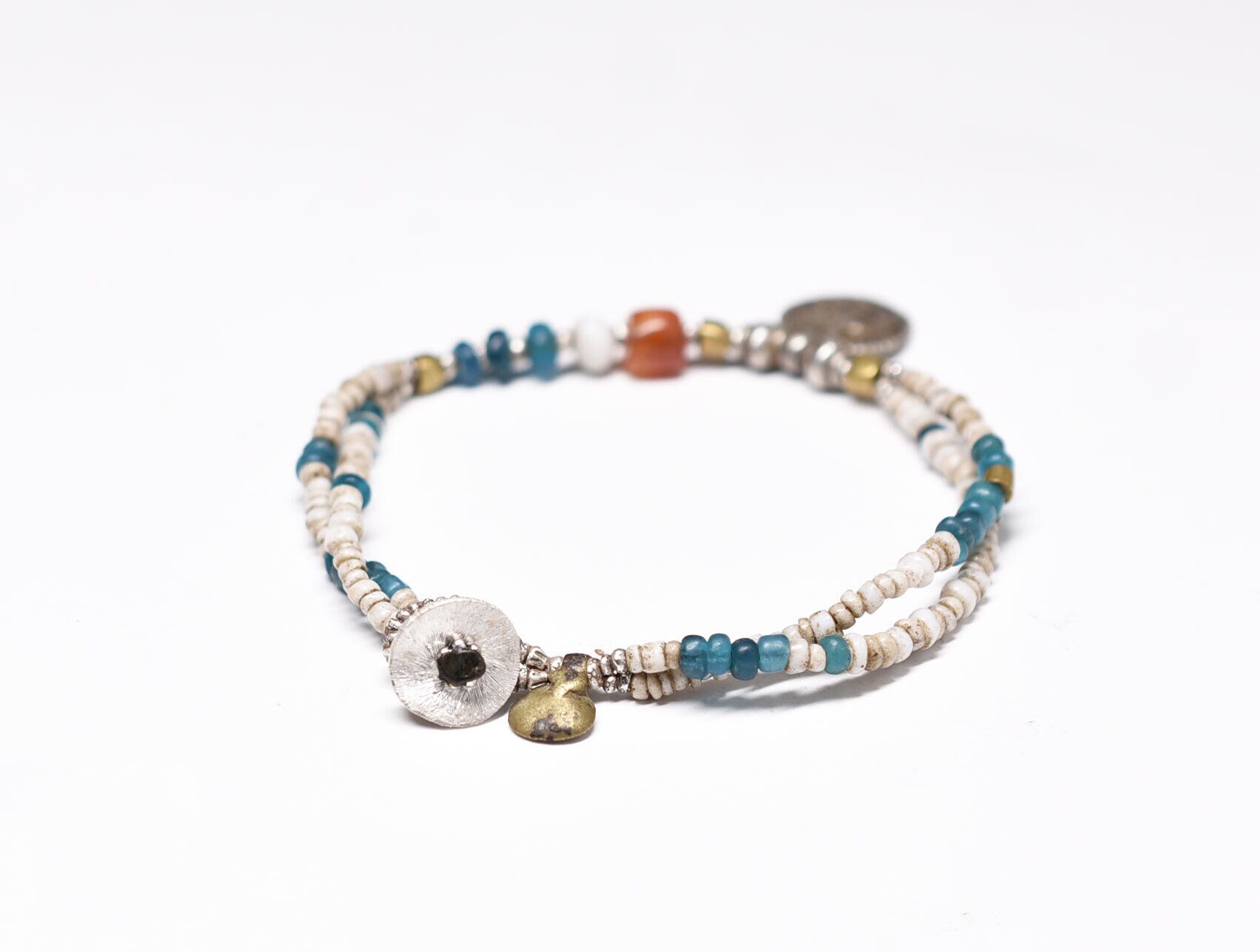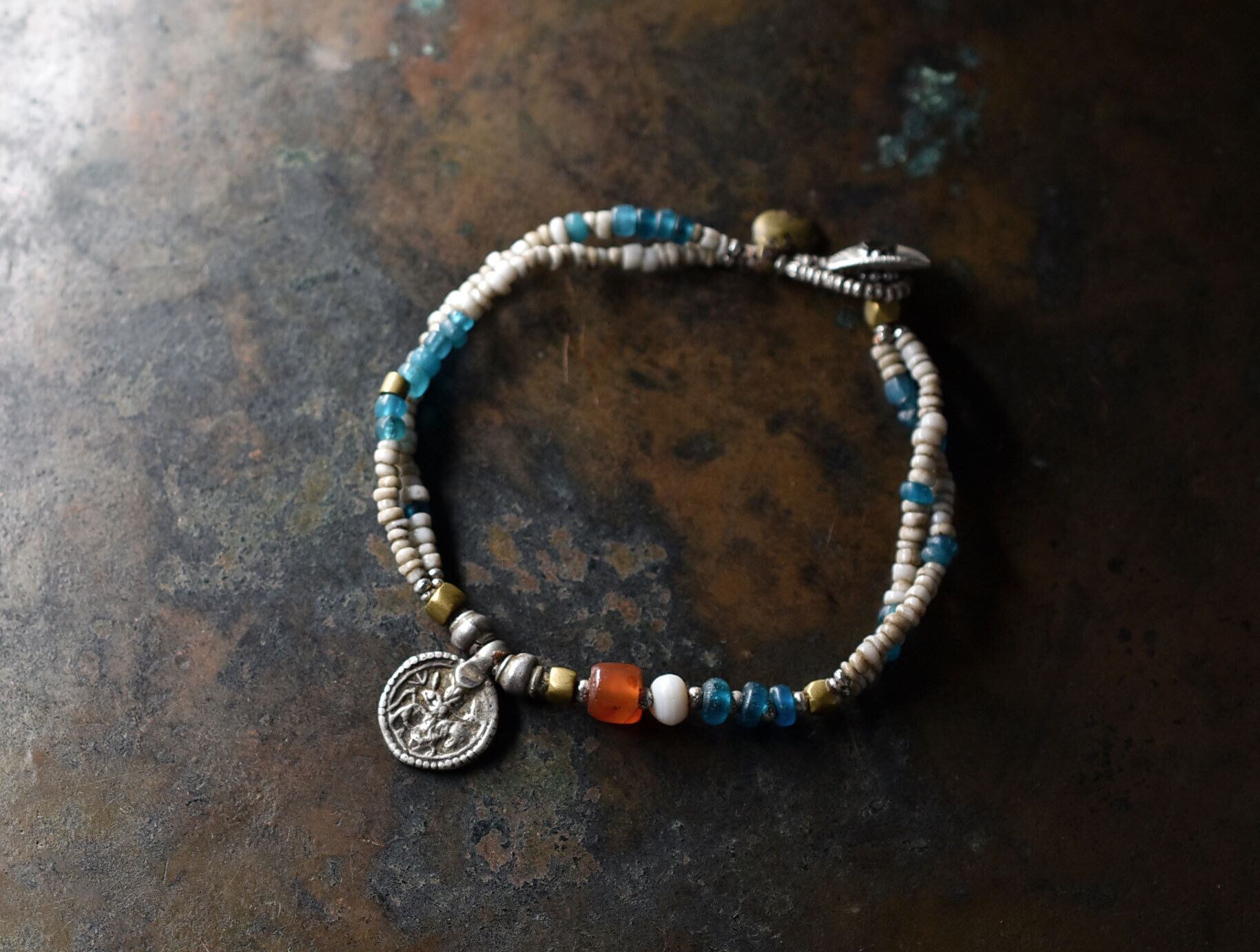 oldインドシルバートップとoldチンシルバー、ミゾーラムカーネリアン、古代瑪瑙、ホワイト&エメラルドブルービーズを繋いだ2連のブレスです。