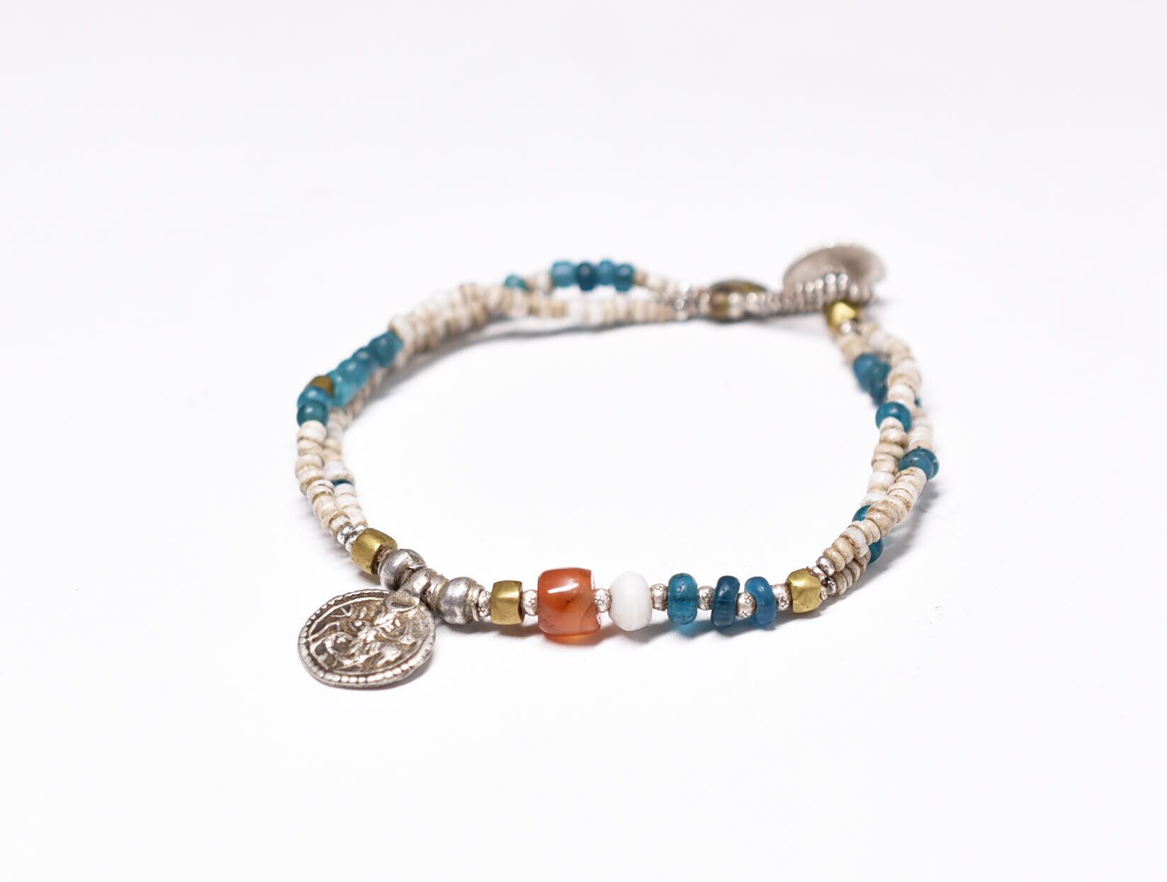 oldインドシルバートップ、oldチンシルバー、ミゾーラムカーネリアン、古代瑪瑙、ホワイト&エメラルドブルービーズの2連ブレス