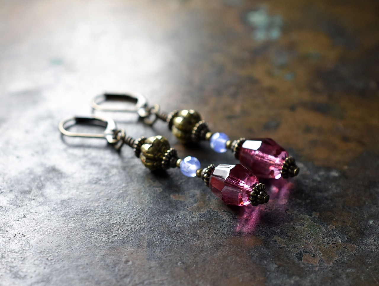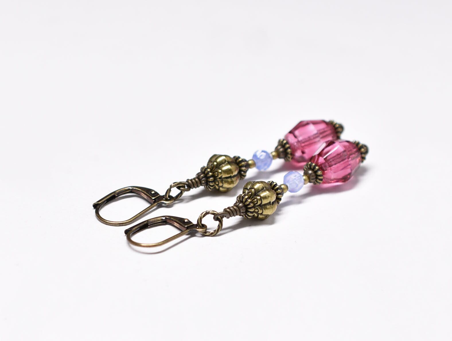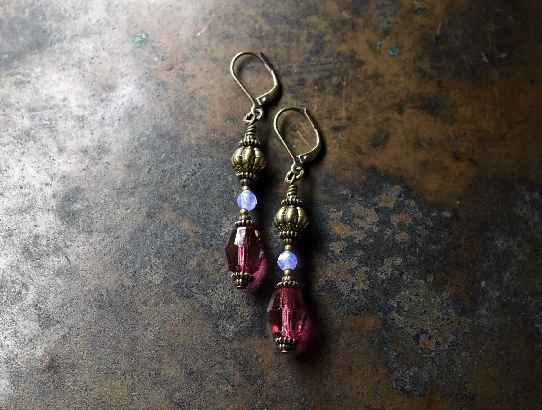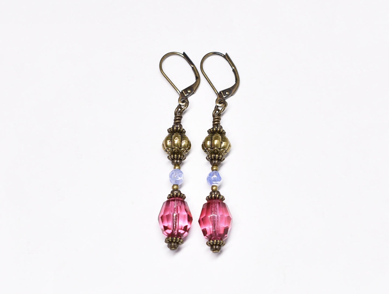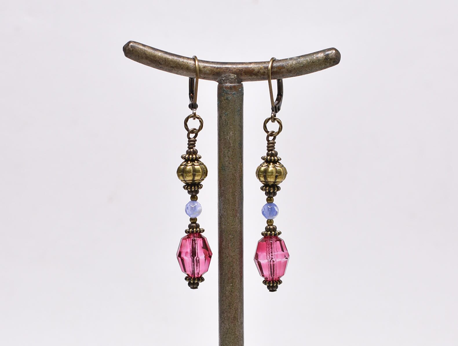 ラズベリーカラードイツヴィンテージとブルー瑪瑙、手毬ブラスを繋いだピアスです。
