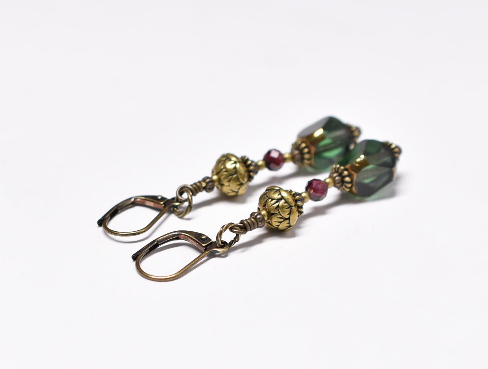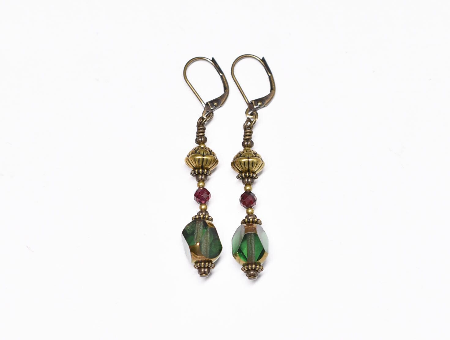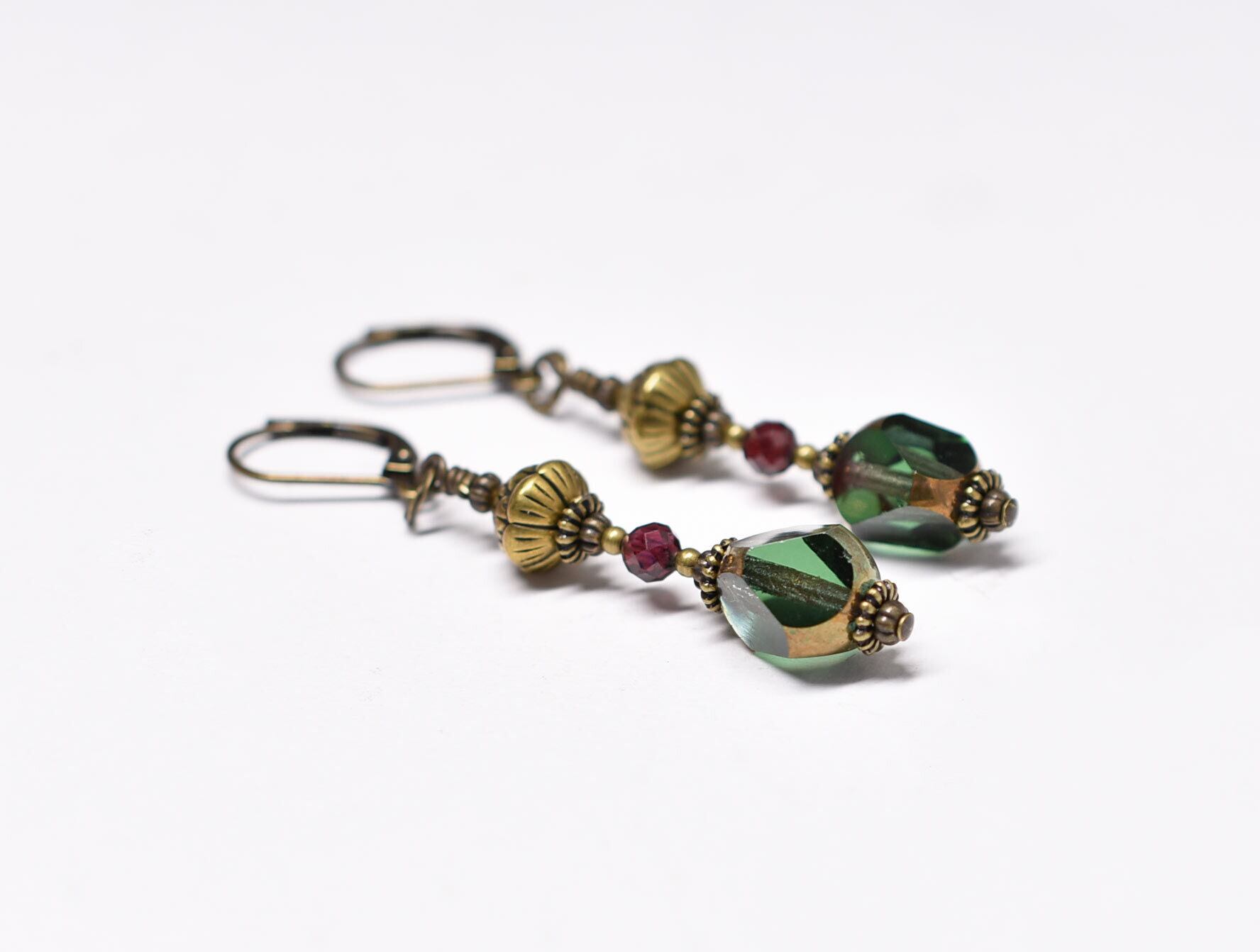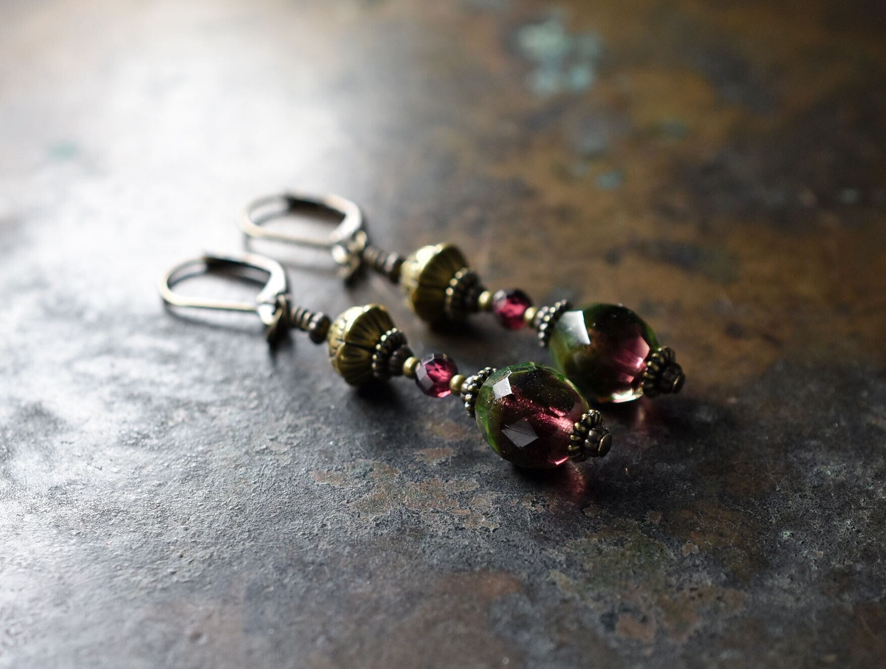 パープル&グリーンドイツヴィンテージとガーネット、蓮華ブラスのピアス