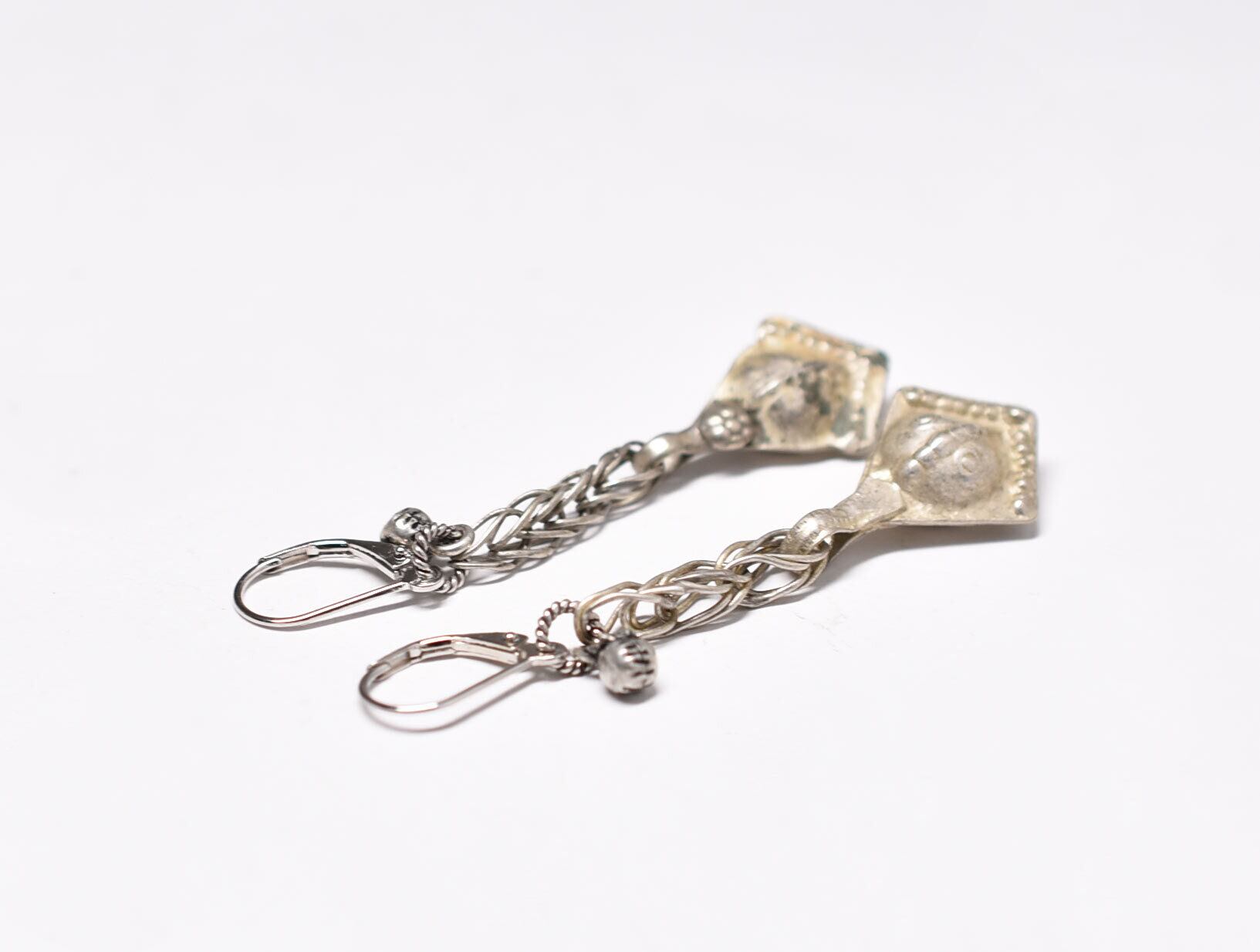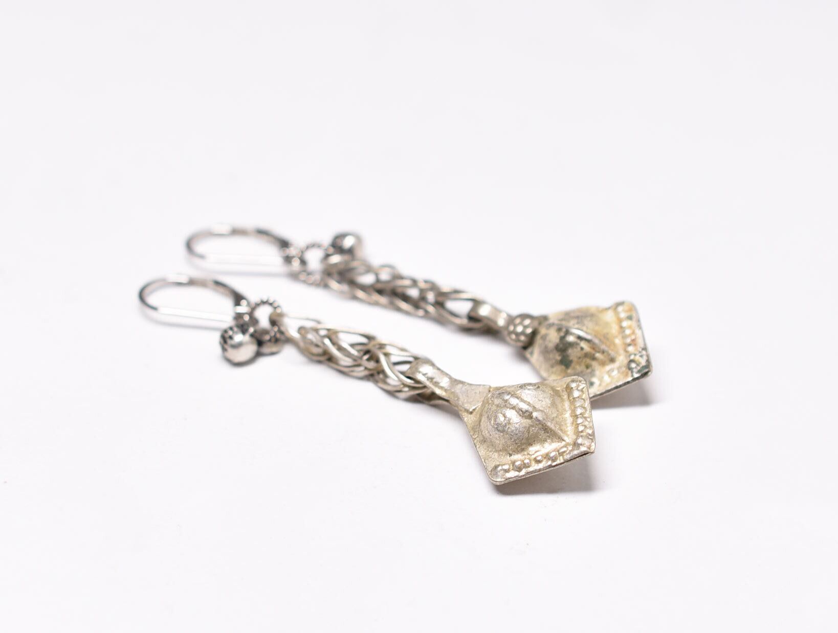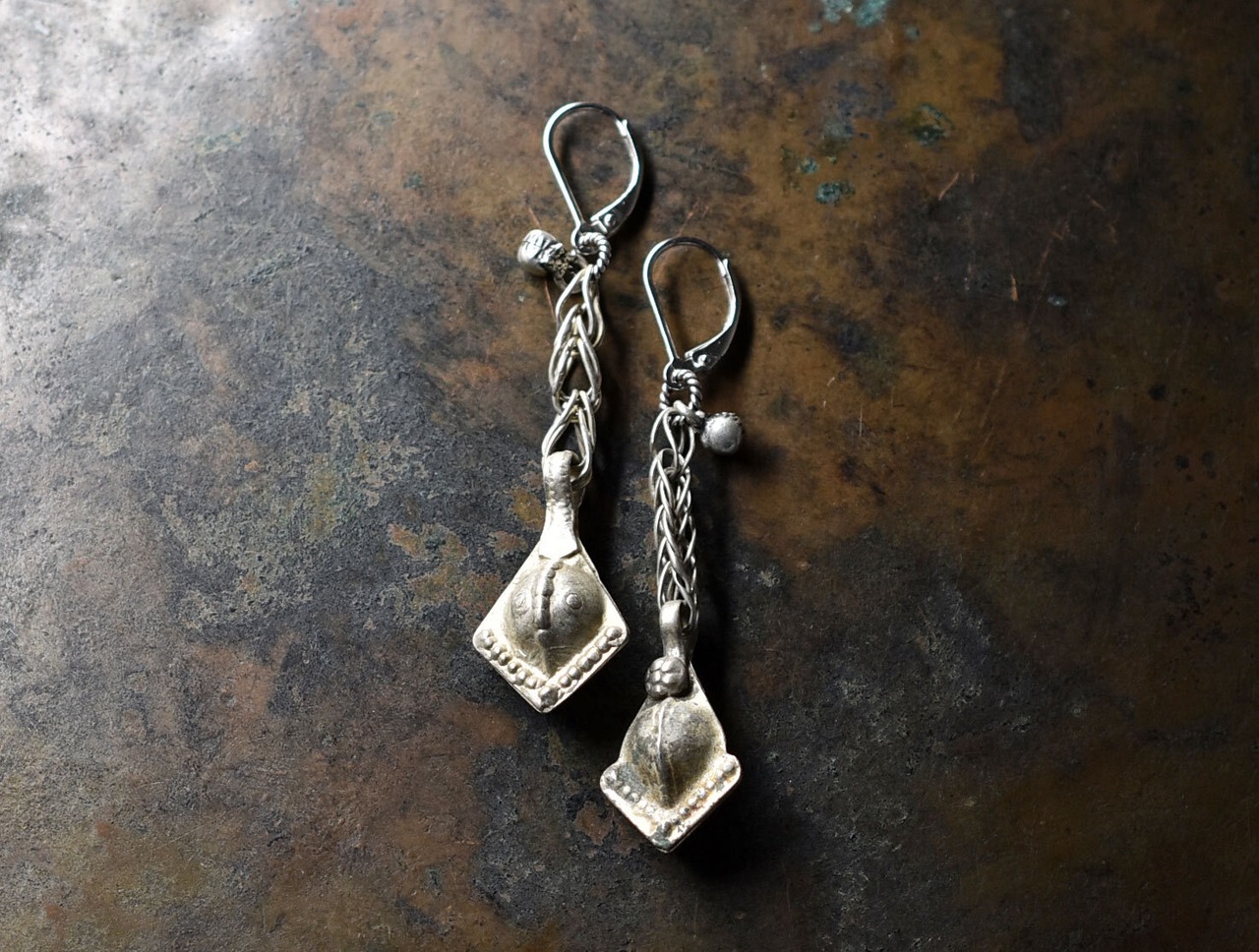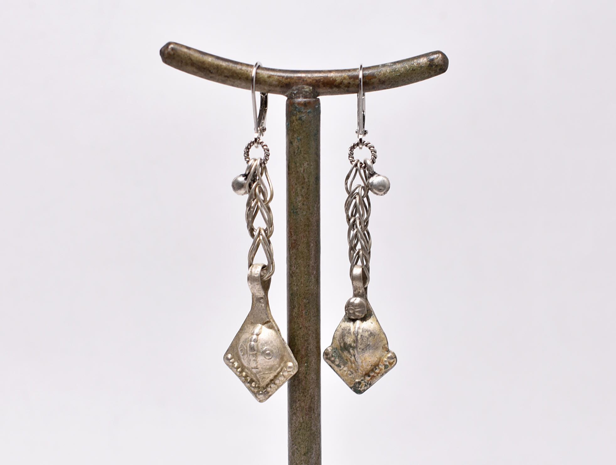 チェーン付きのアフガンメタルパーツとインドシルバーの鈴を繋いだピアスです。