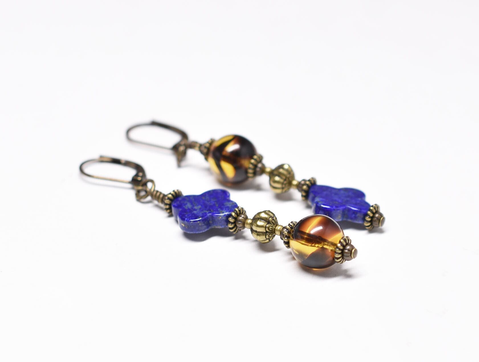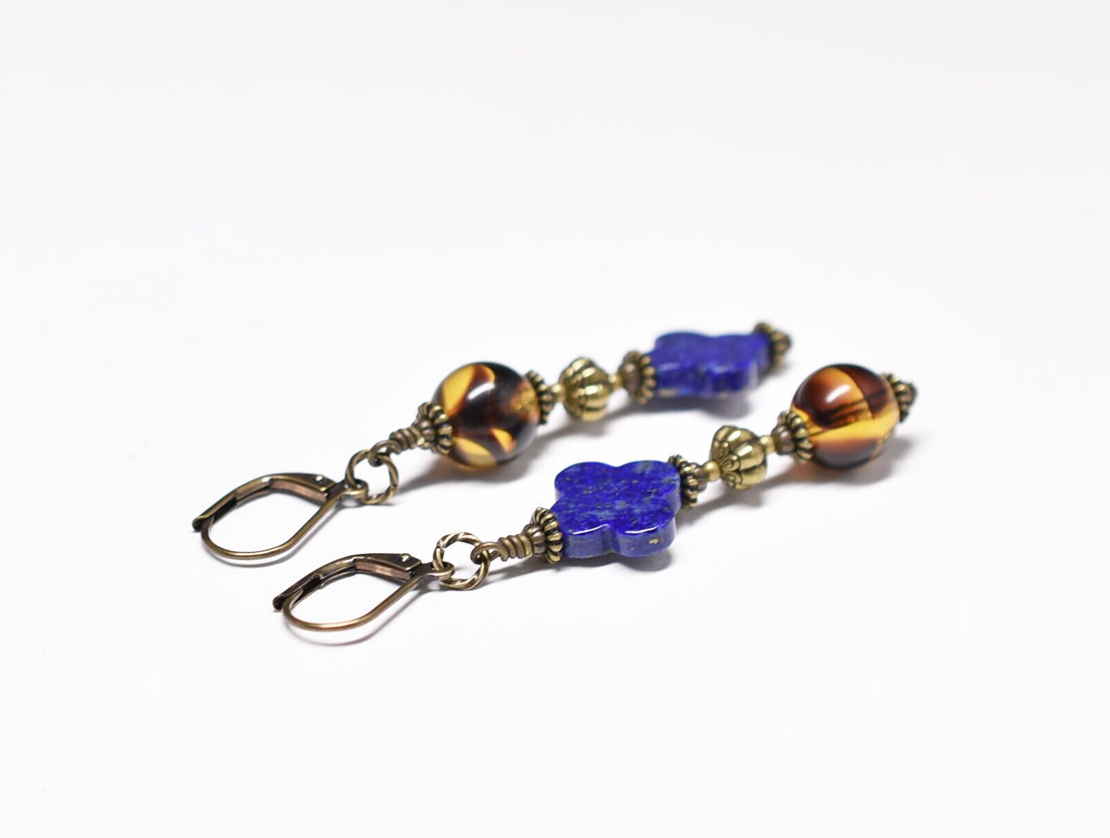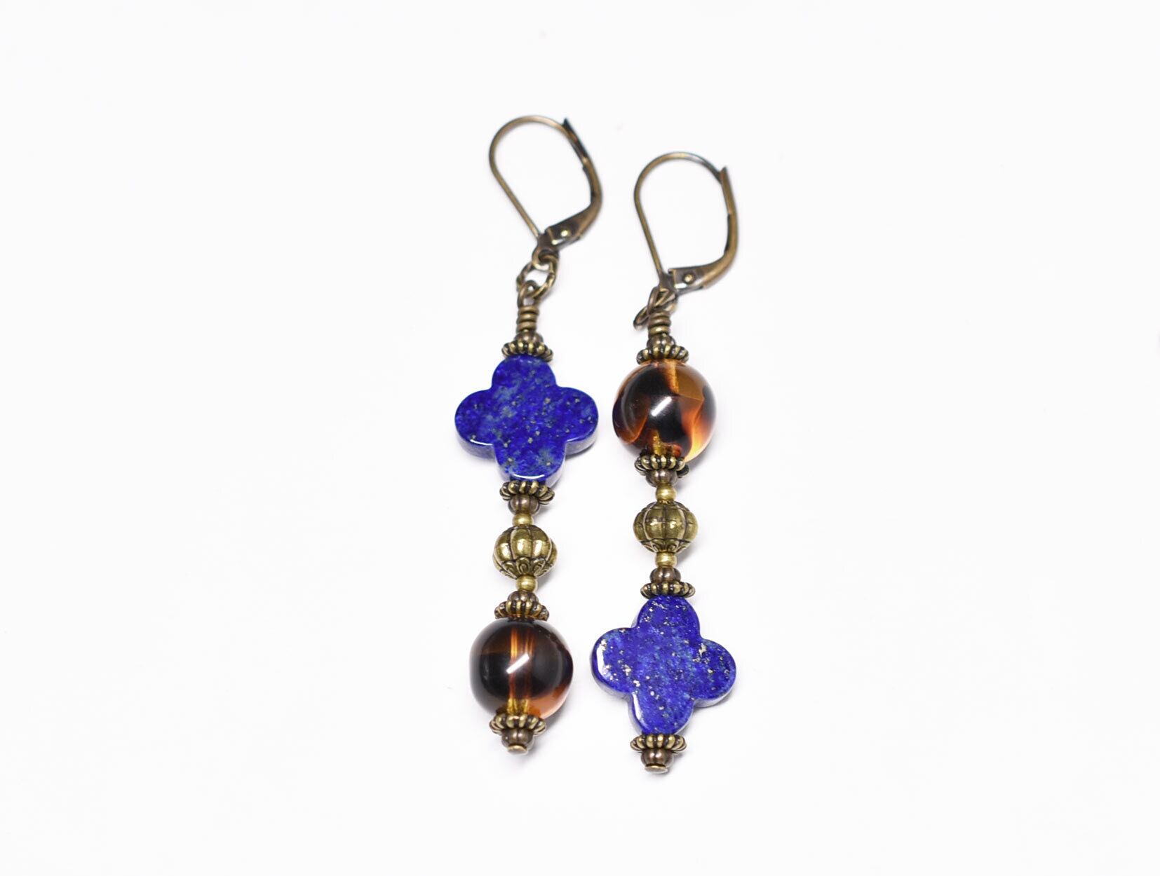 まん丸べっ甲色ドイツヴィンテージビーズとクローバーラピス、手毬ブラスのアンシメトリーピアス