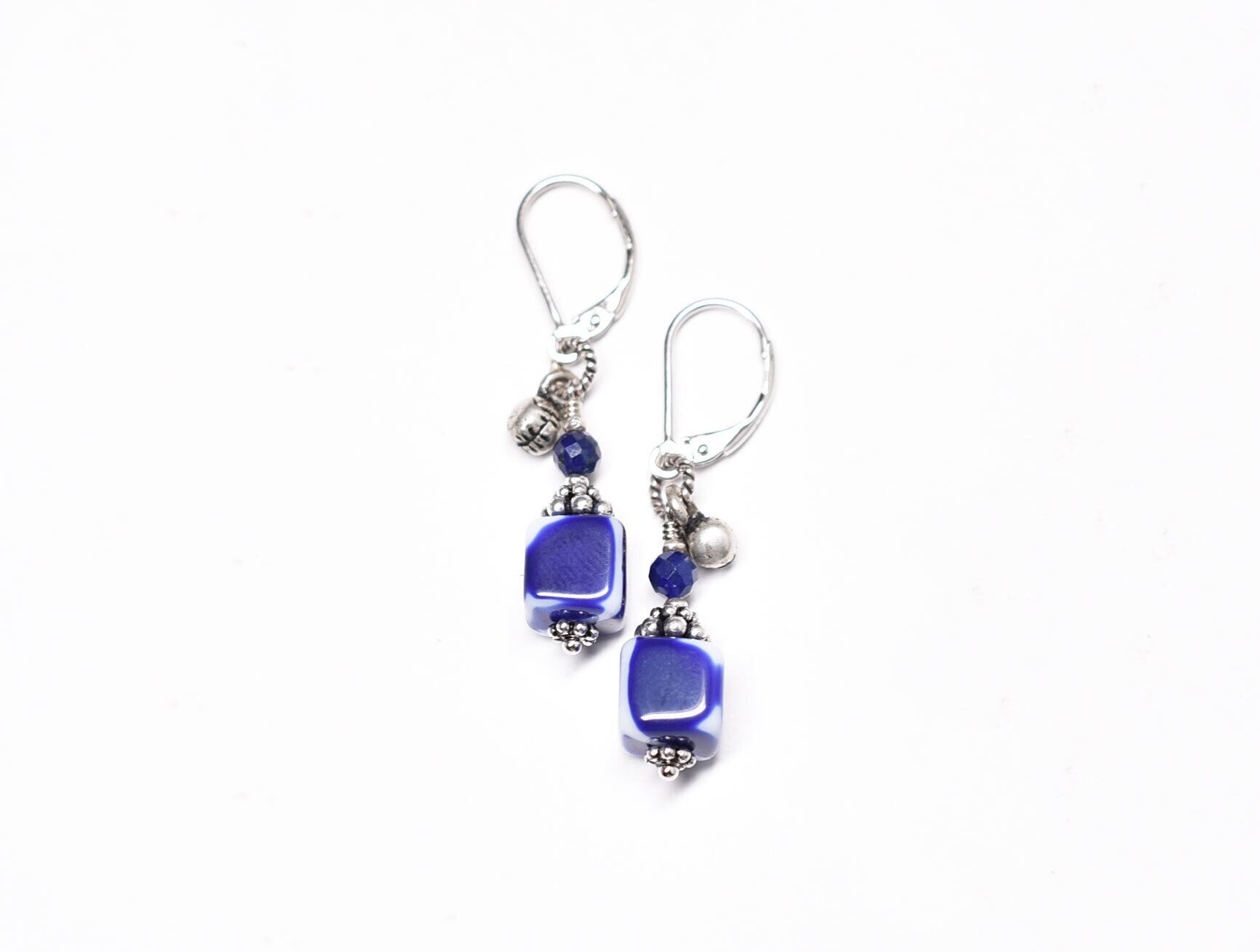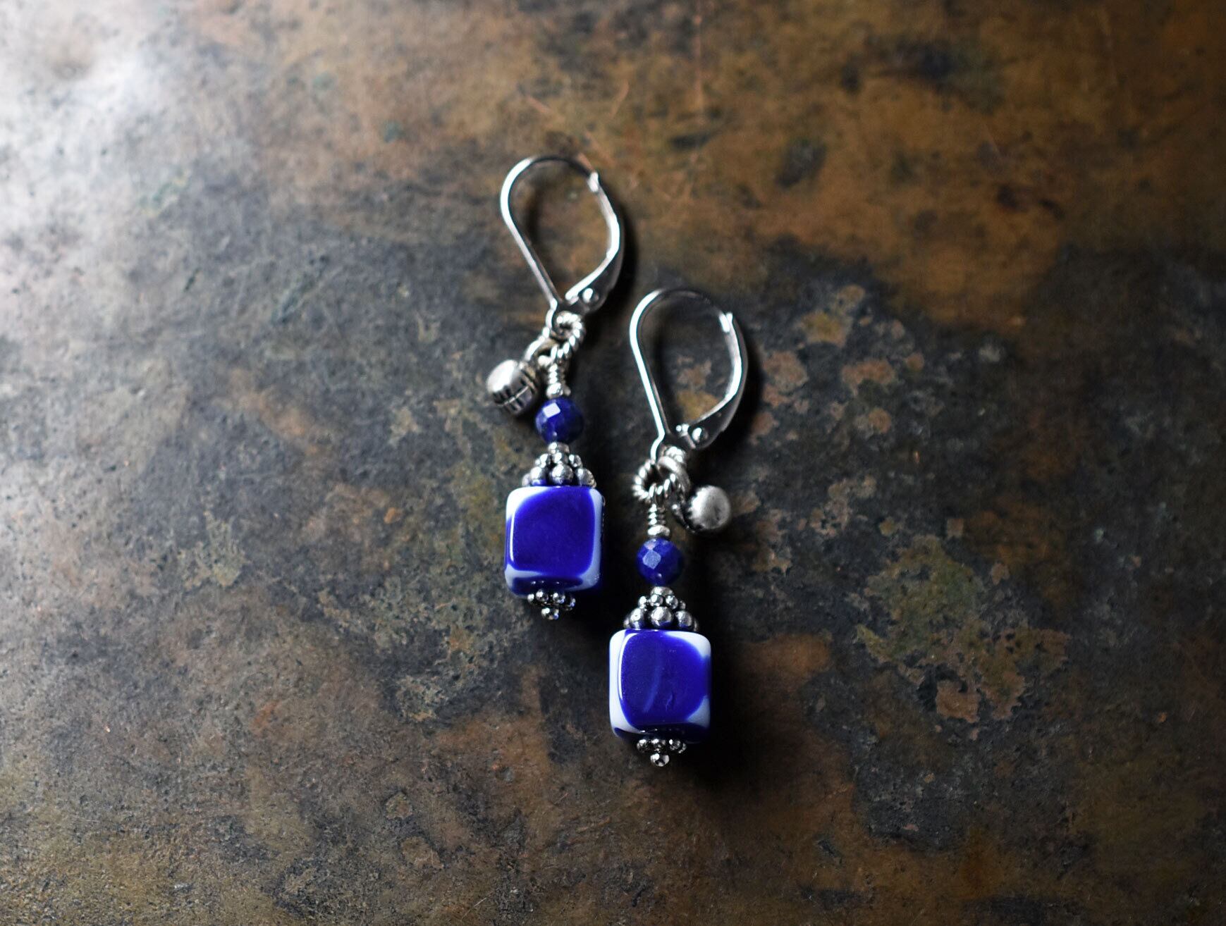 濃紺スクエアアンティークボヘミアビーズとラピス、インドシルバー鈴のピアス