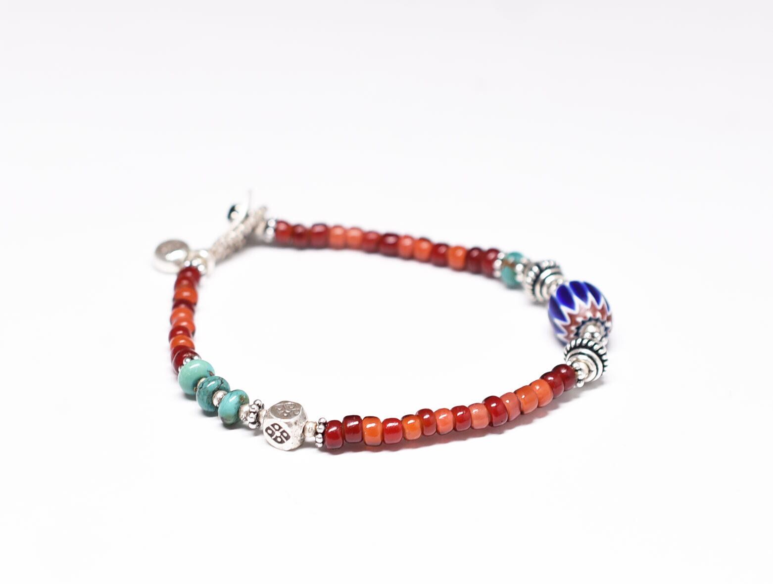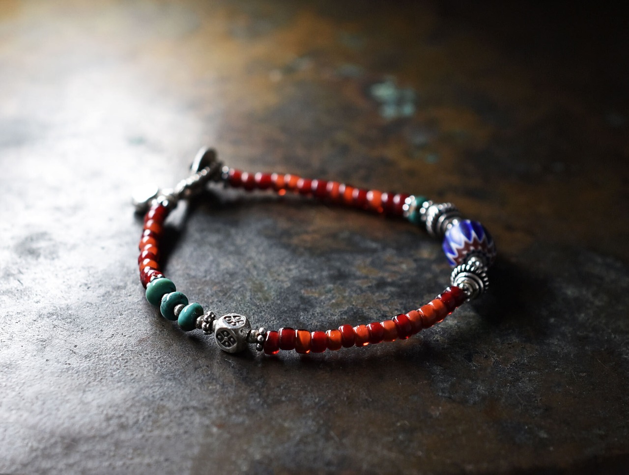 ブルーシェブロンビーズと、カレンシルバー、チベタンターコイズと血赤&金赤ホワイトハーツを繋いだブレスです。
