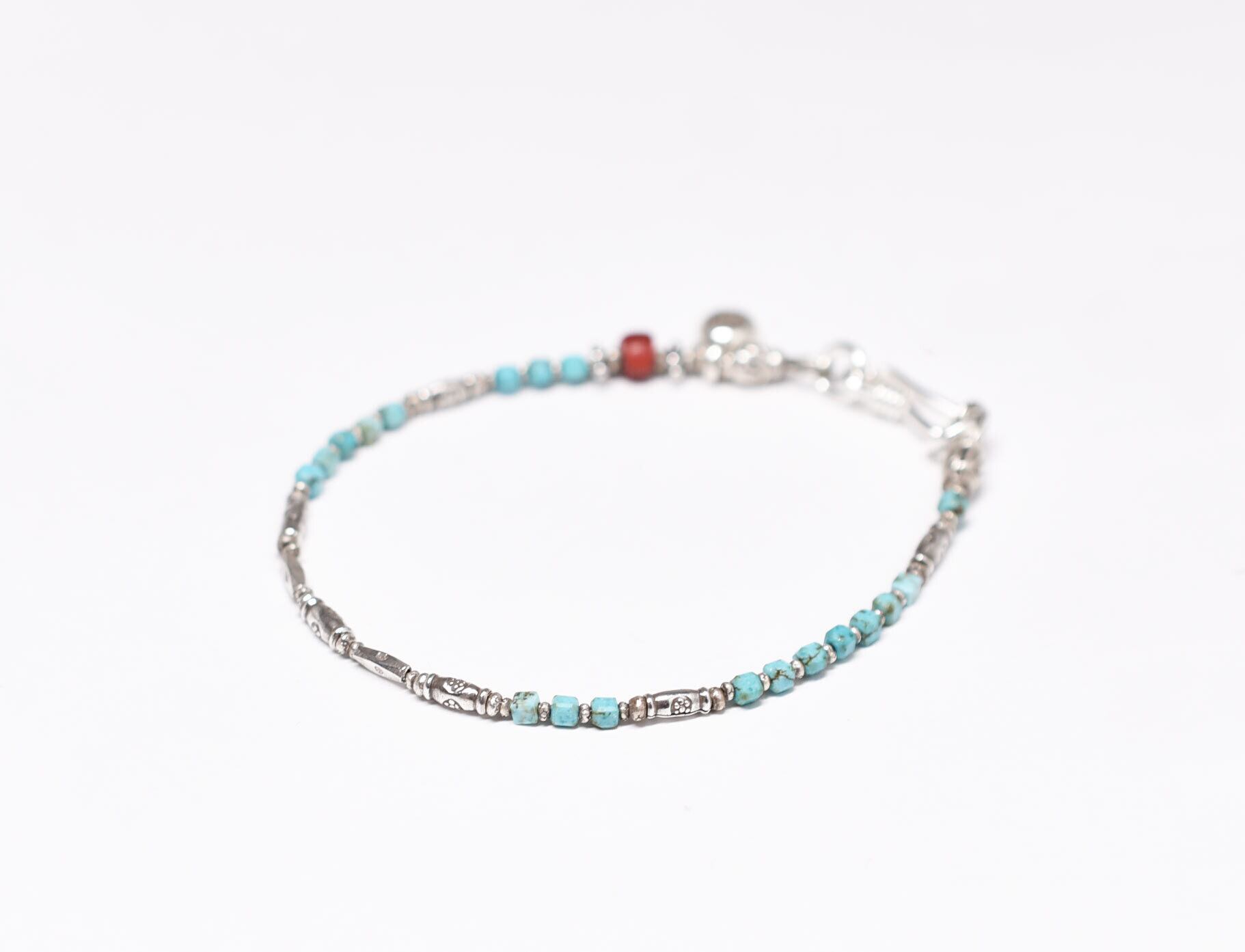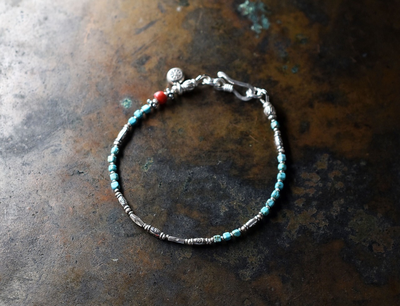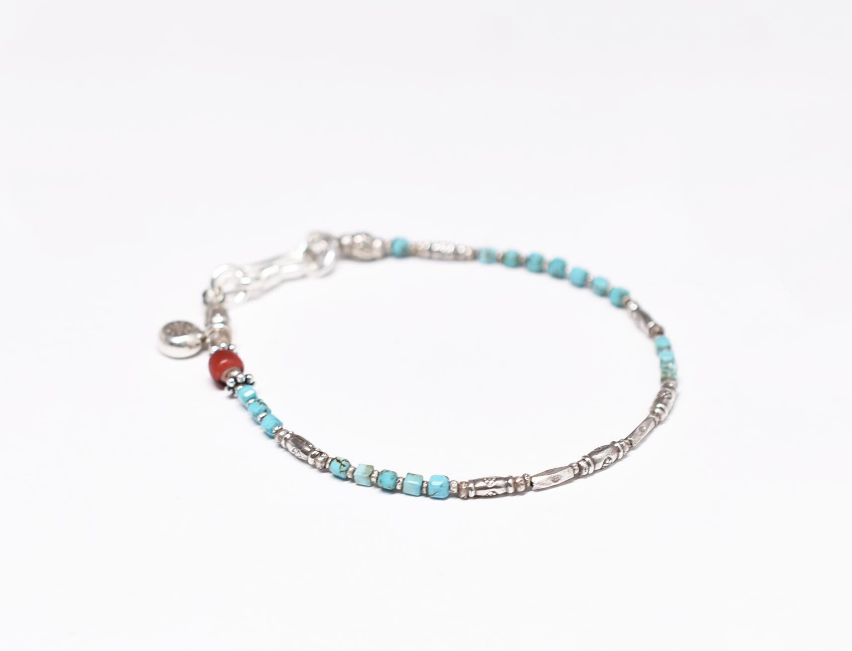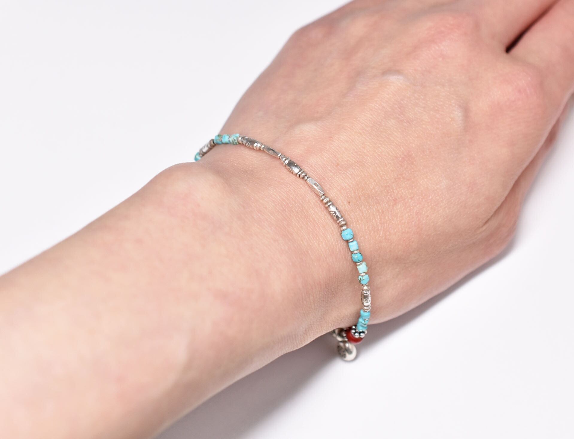 スクエアターコイズとカレンシルバー、金赤ホワイトハーツを繋いだ華奢なブレス です。