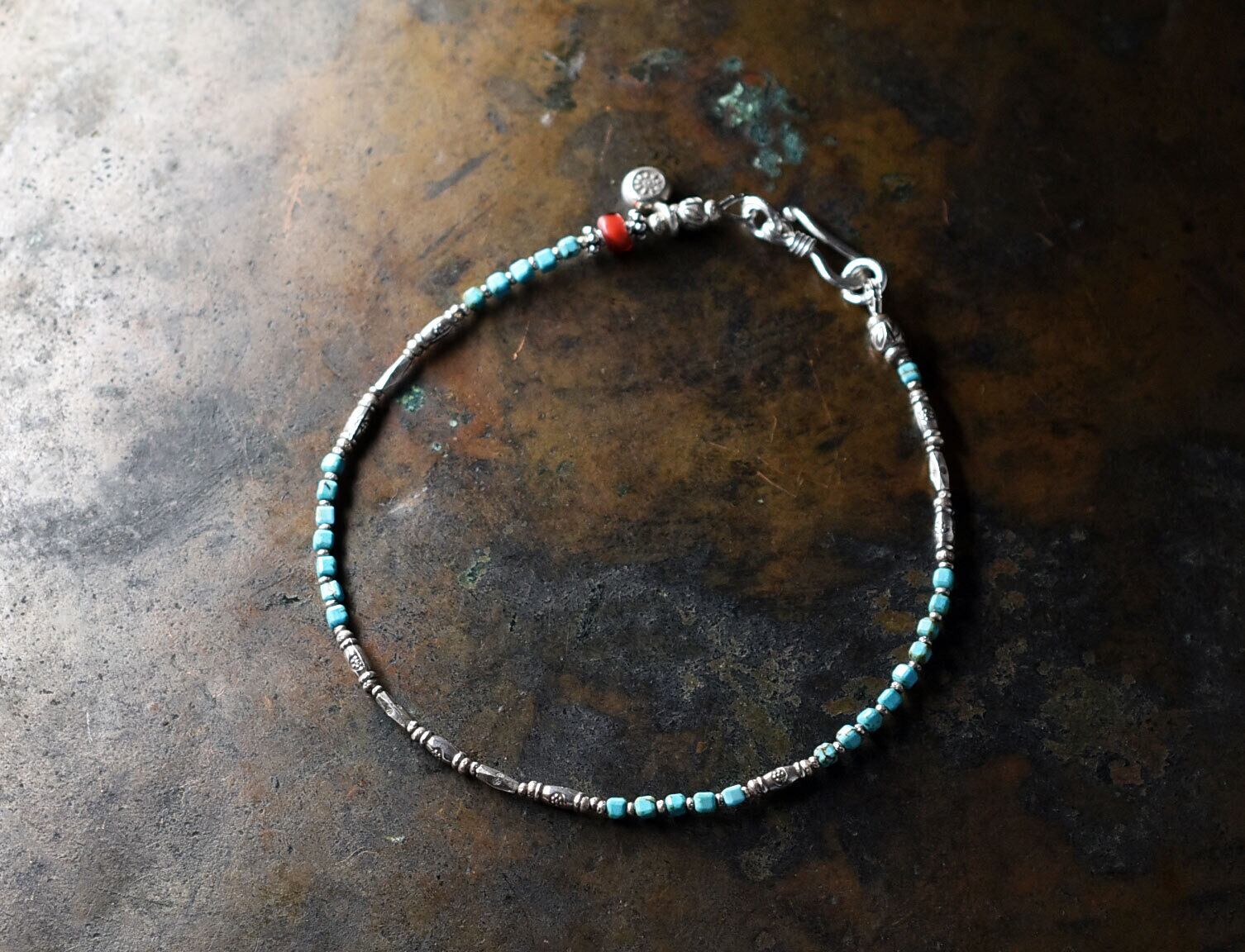 スクエアターコイズとカレンシルバー、金赤ホワイトハーツの華奢なアンクレット