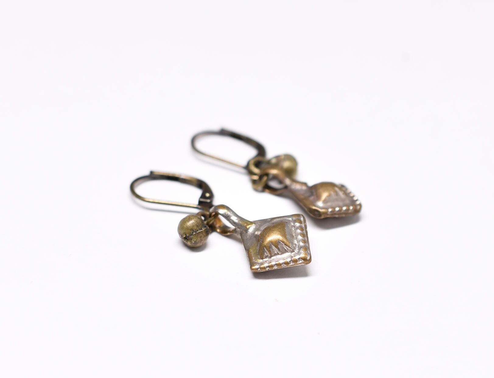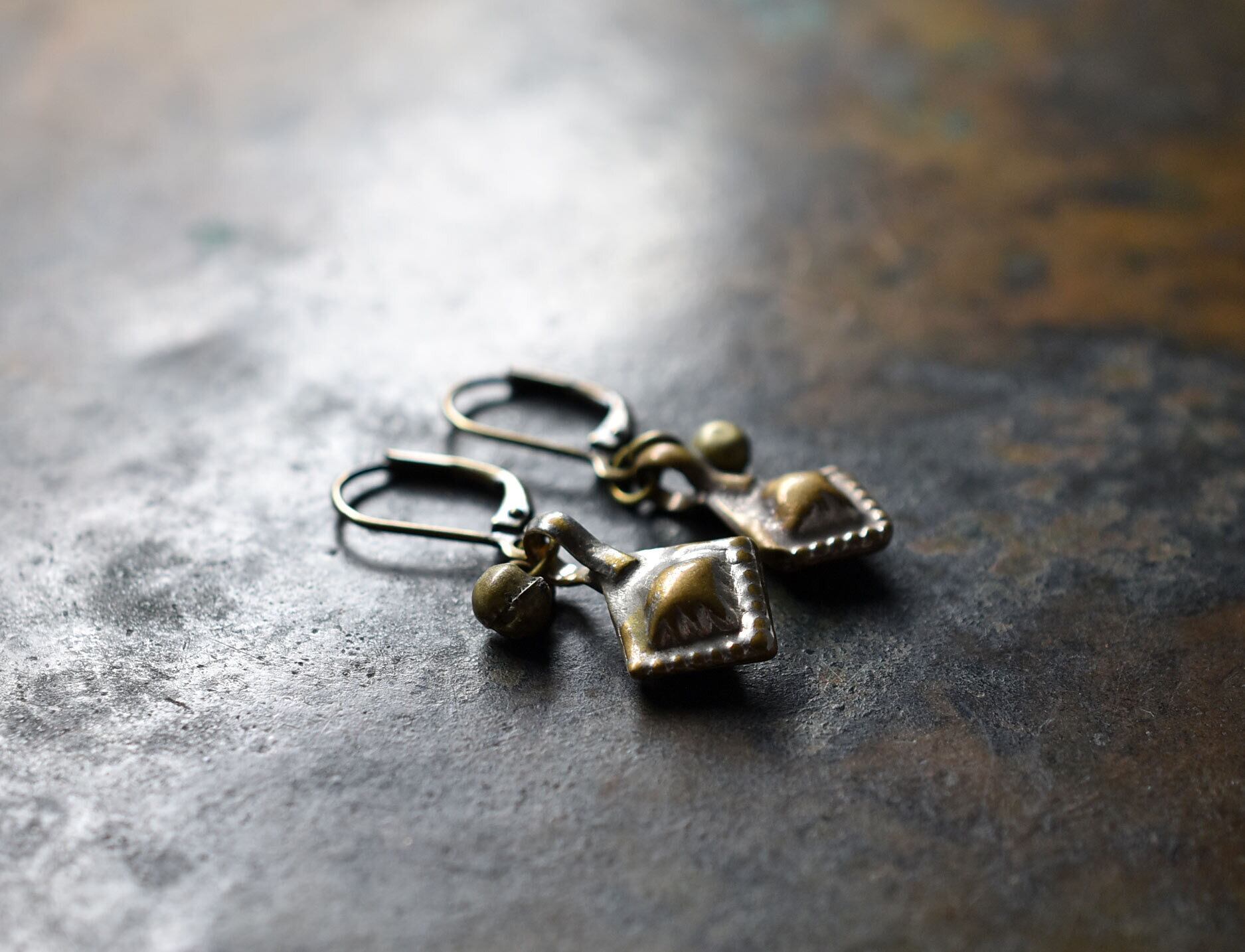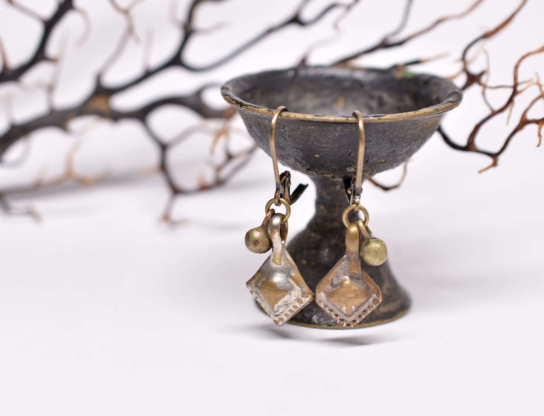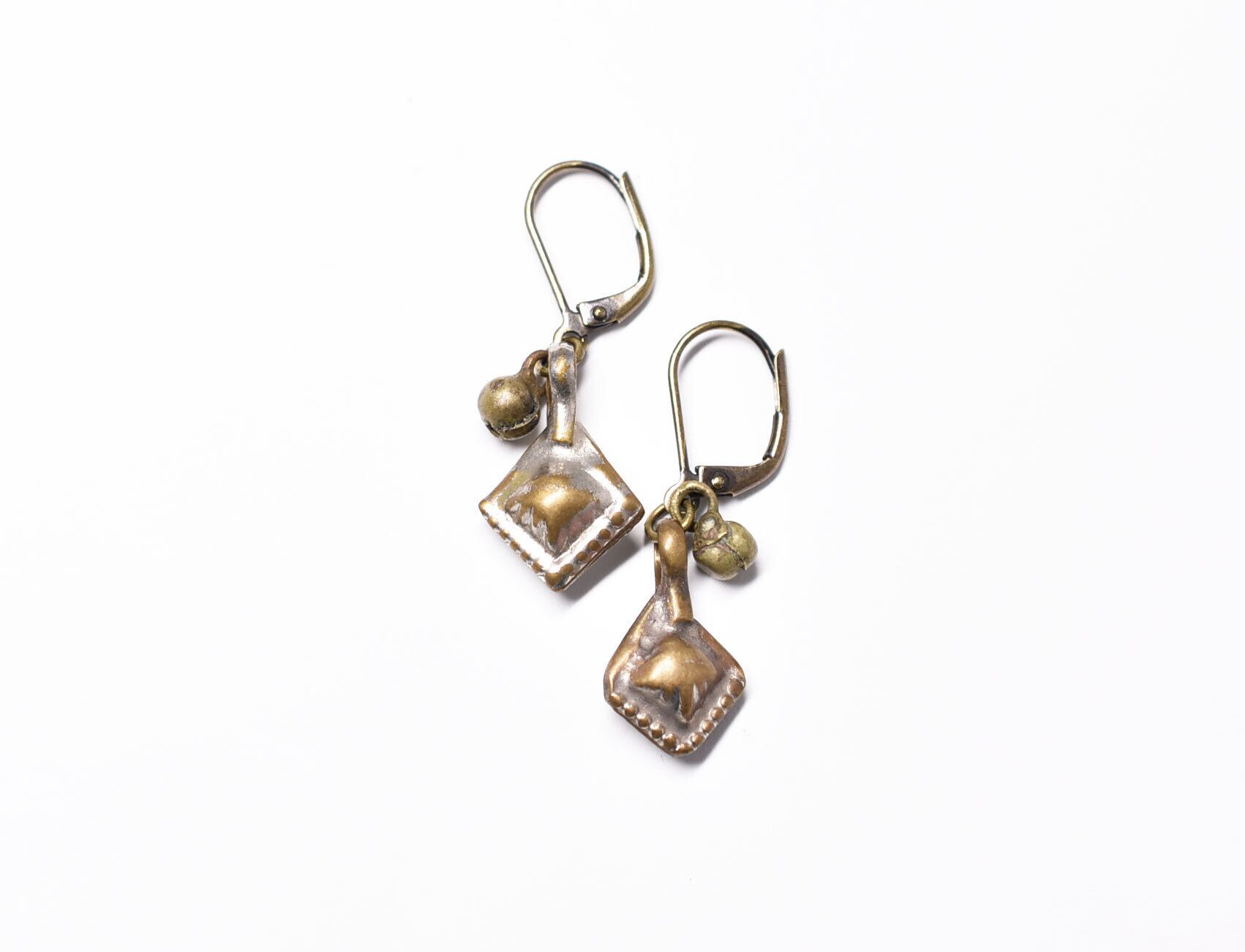 スクエアアフガンパーツと民族鈴を繋いだ小さめなピアスです。