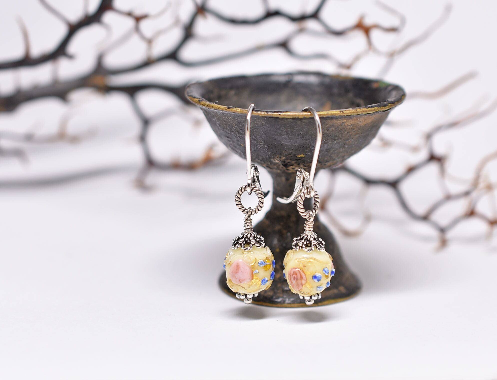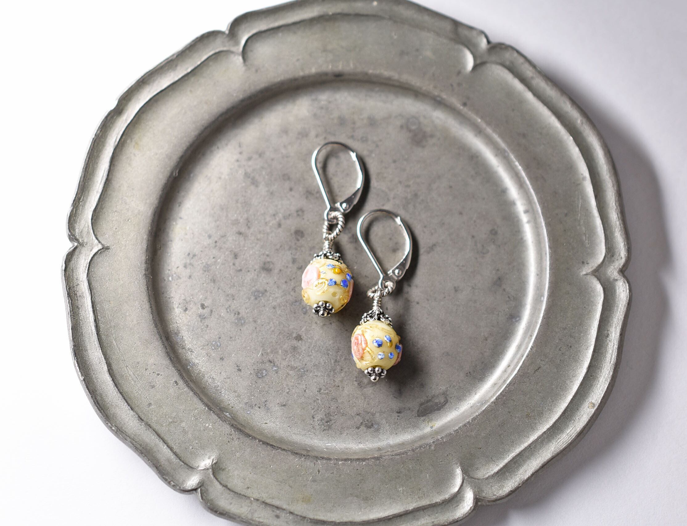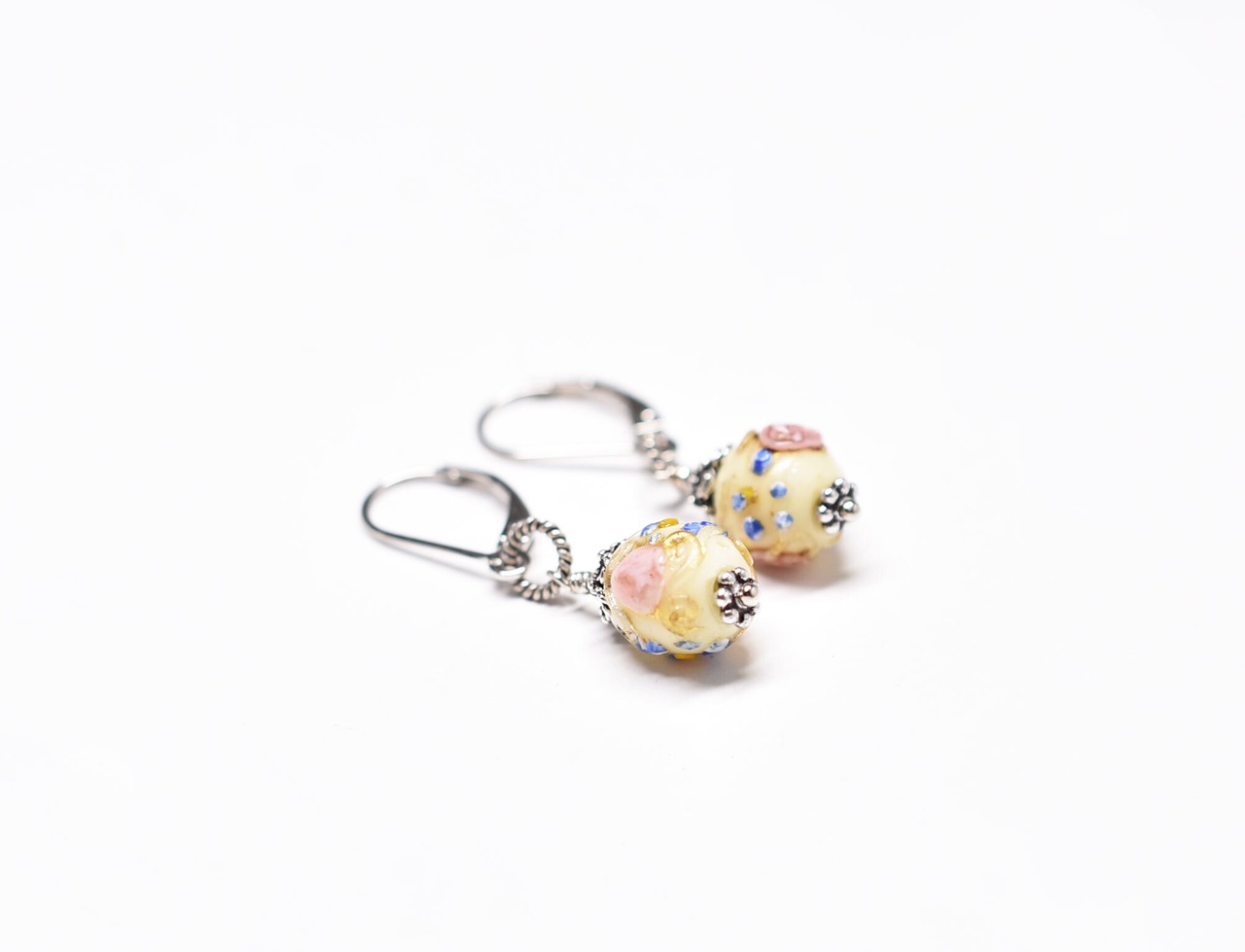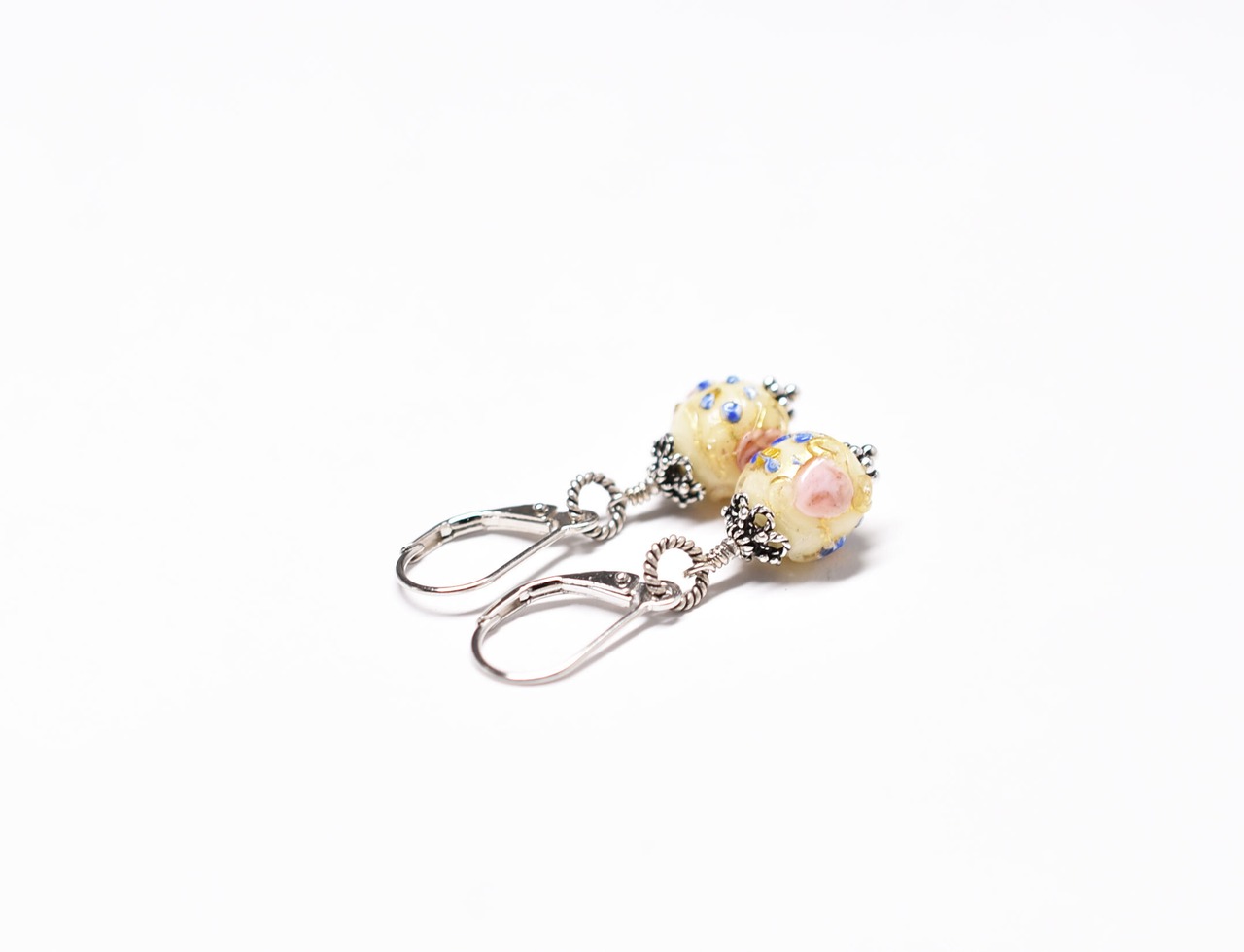 ヴェネチアアンティークビーズ勿忘草と薔薇の小さなピアス(クリーム)
