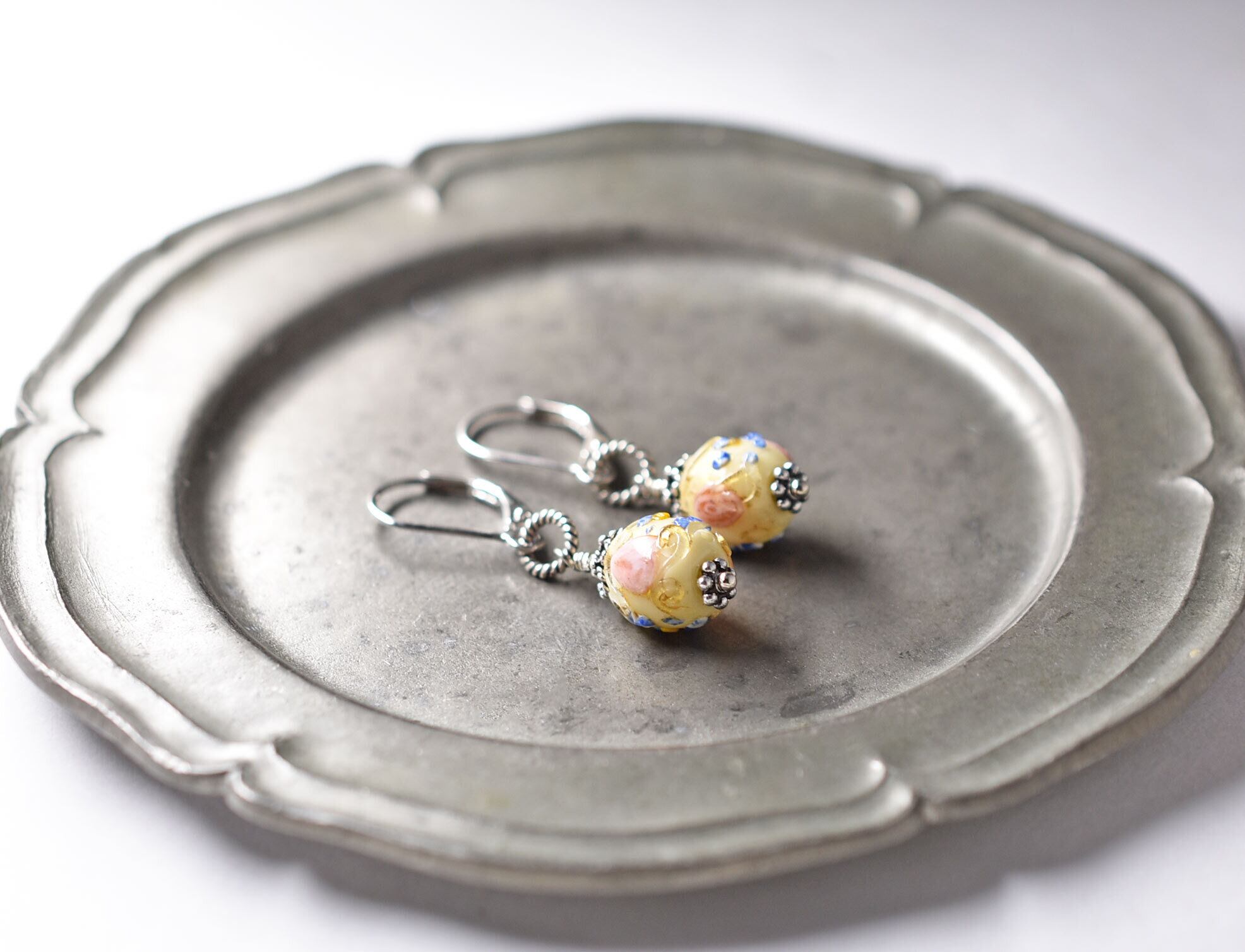 ヴェネチアアンティークビーズ勿忘草と薔薇が施された小さなピアスです。