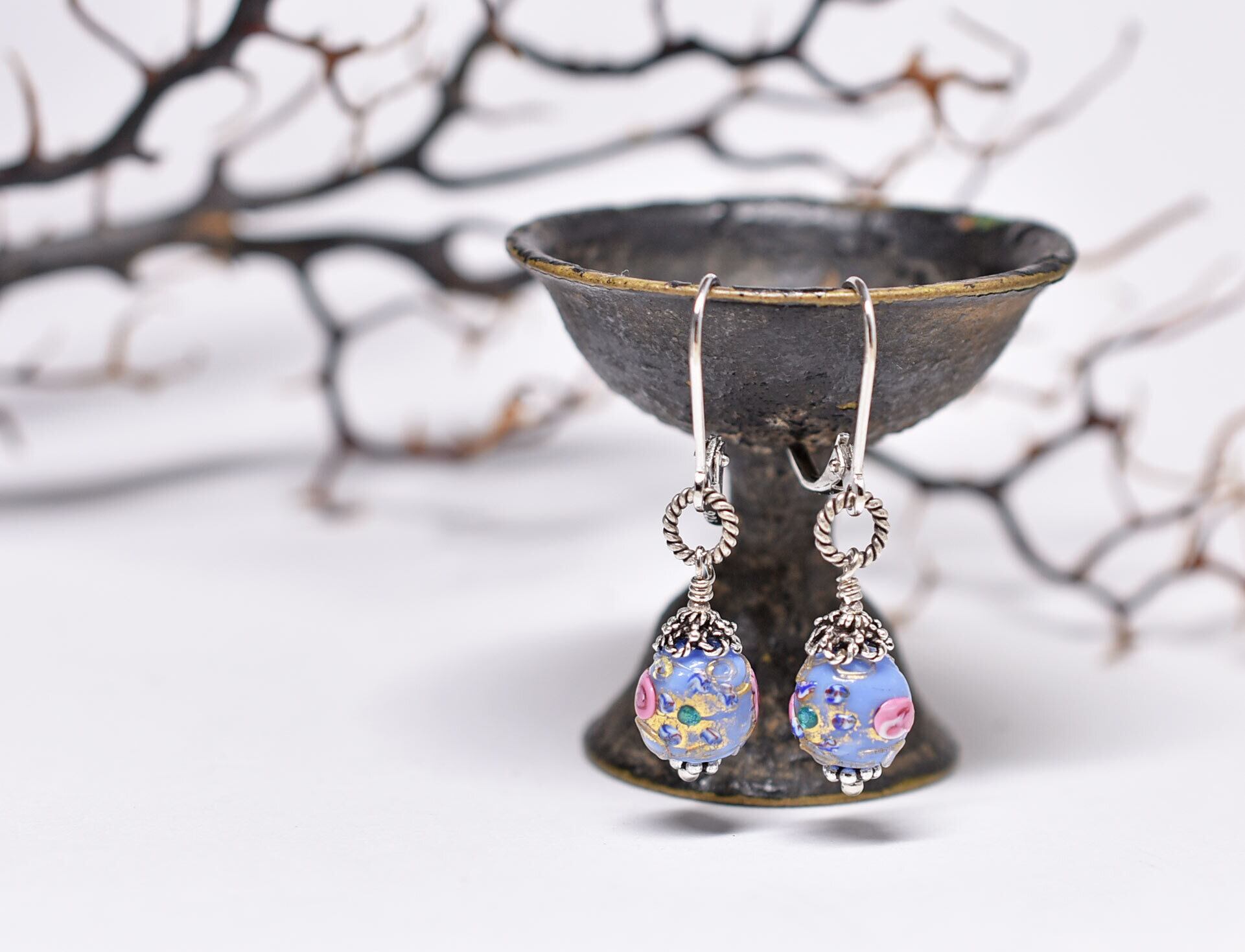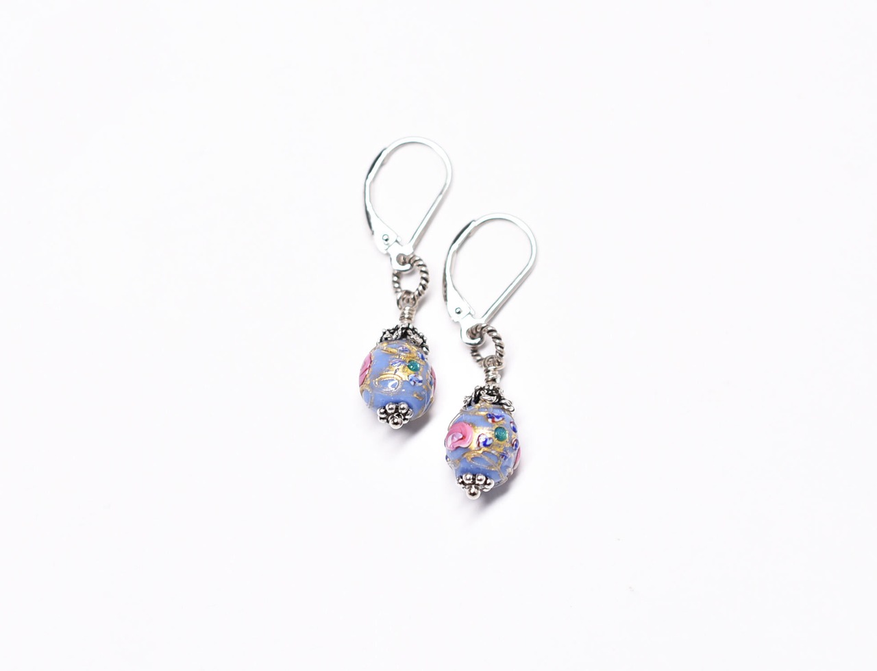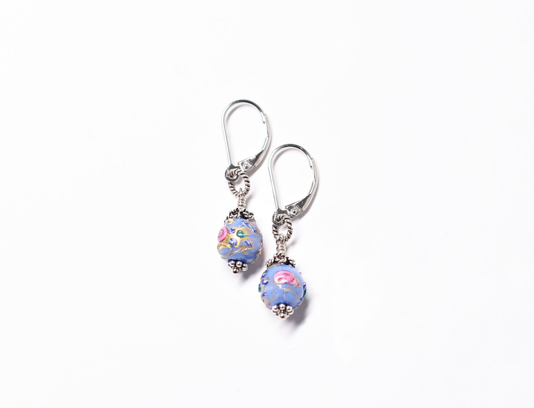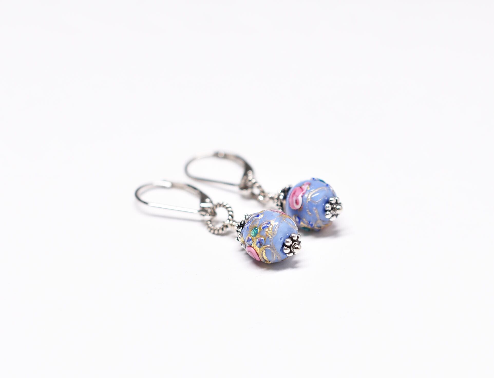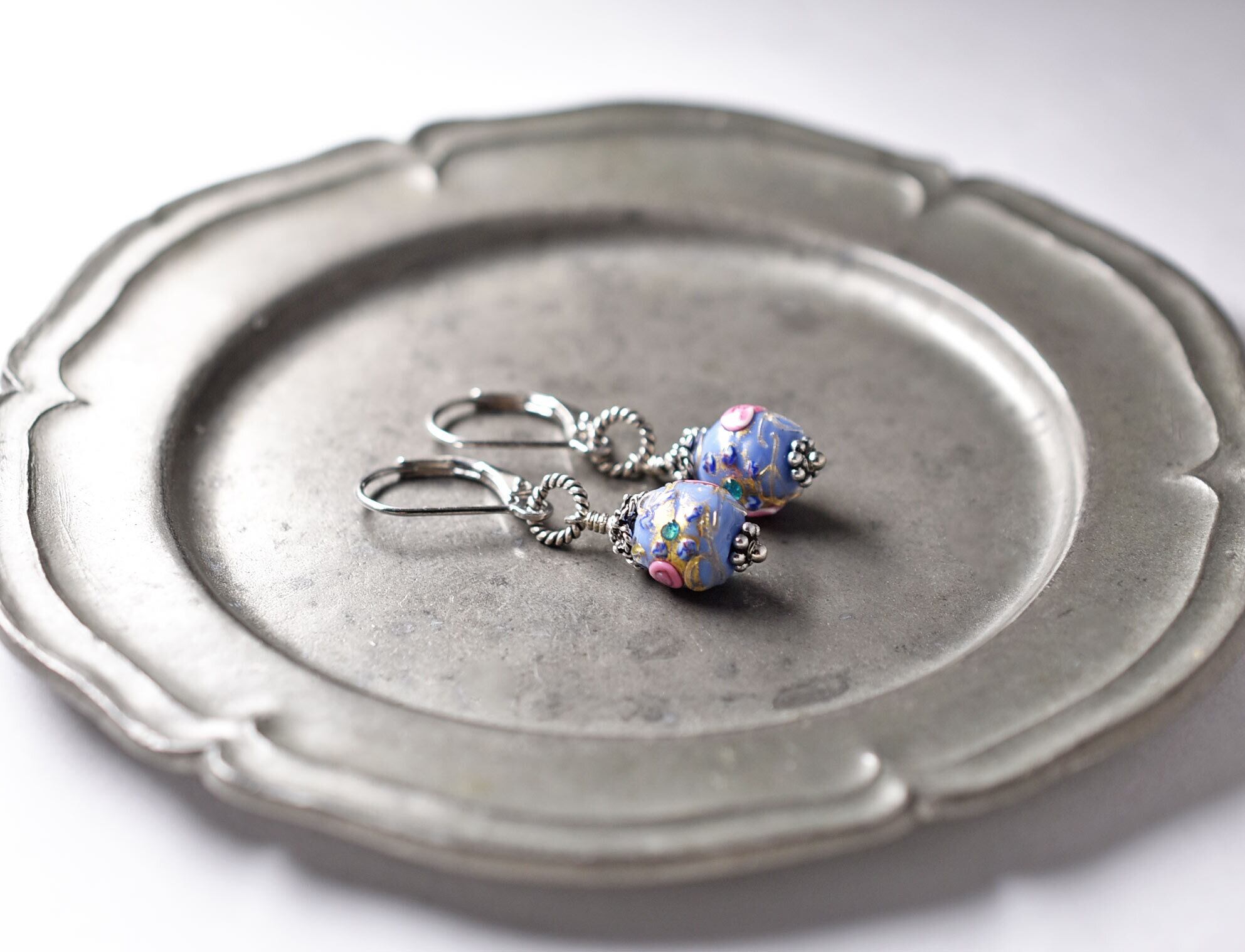 ヴェネチアアンティークビーズ勿忘草と薔薇が施された小さなピアスです。