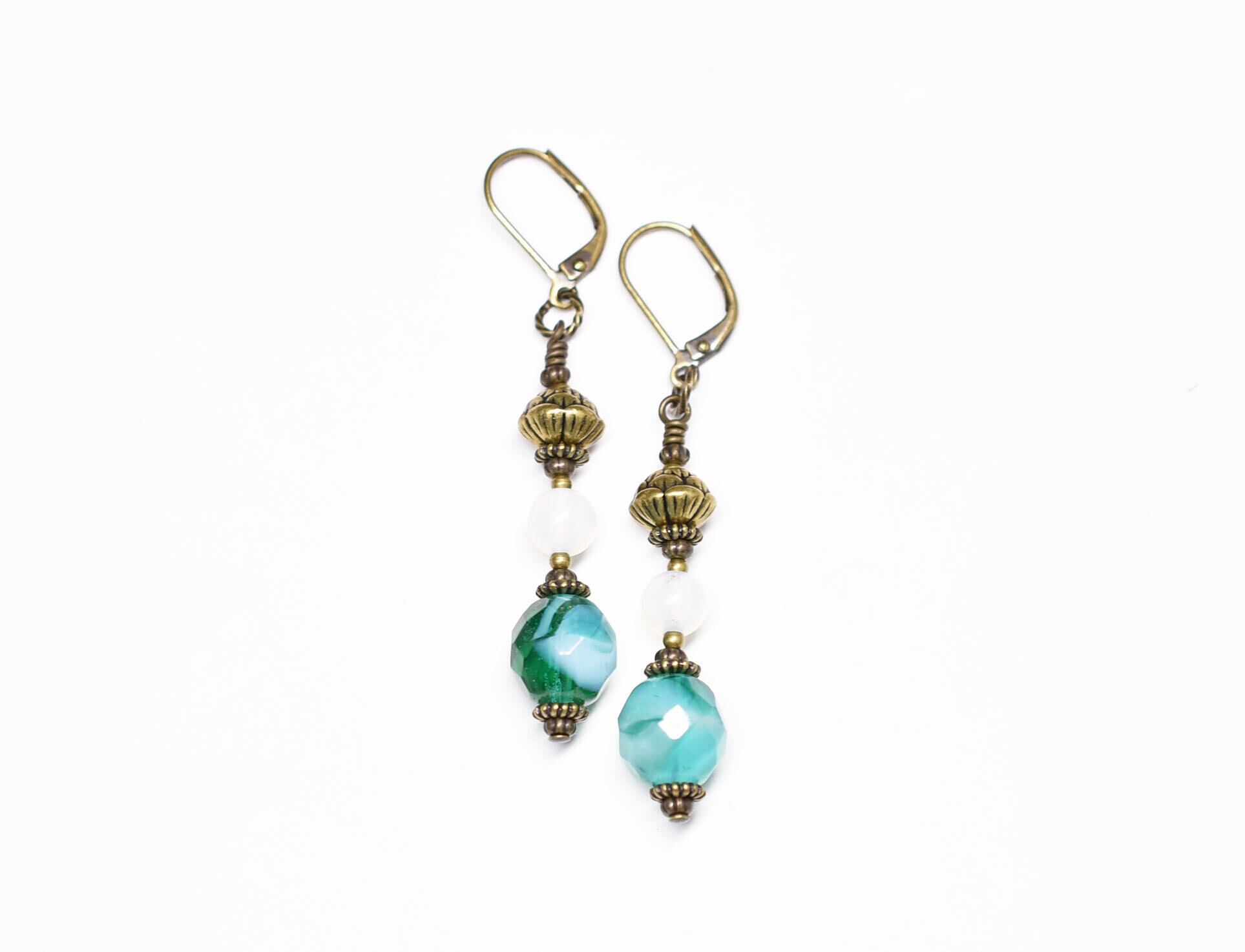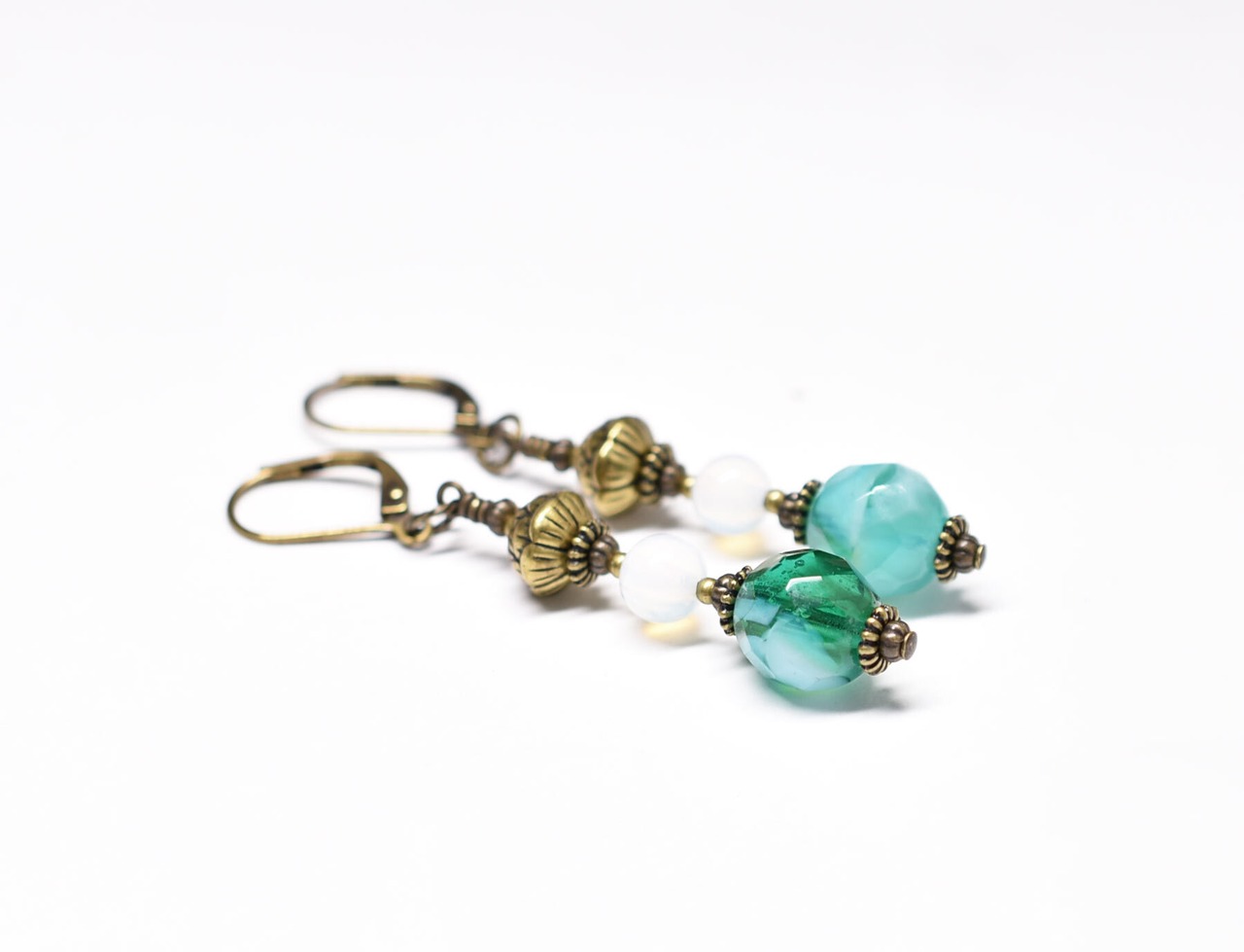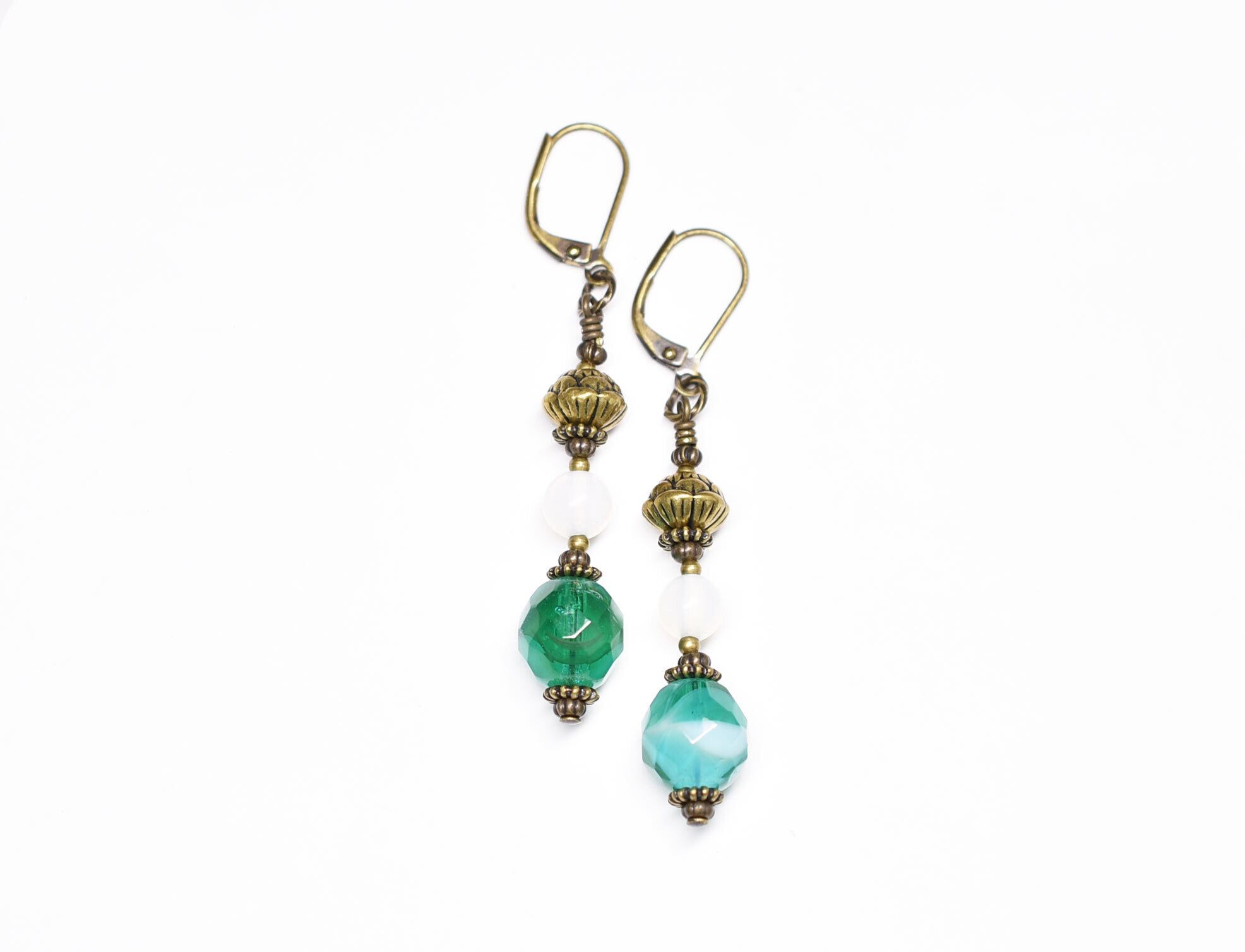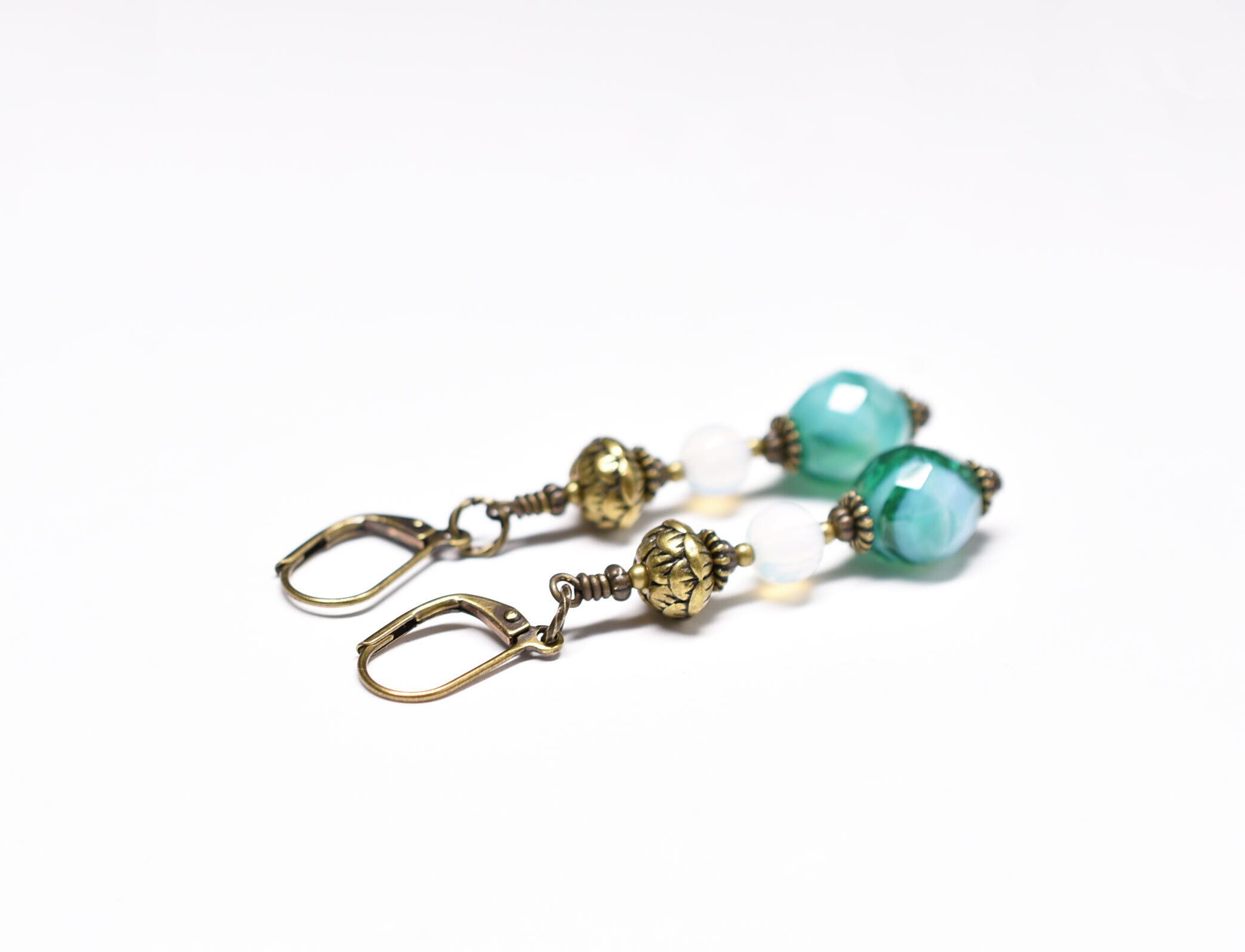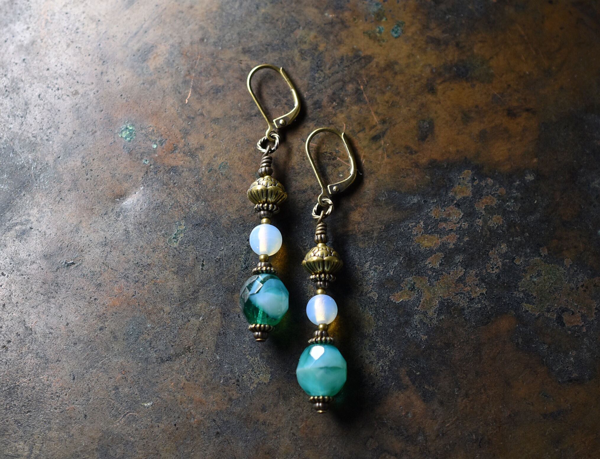 エメラルドグリーンチェコビーズとヴィンテージオパールグラス、蓮華ブラスのピアス
