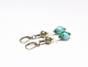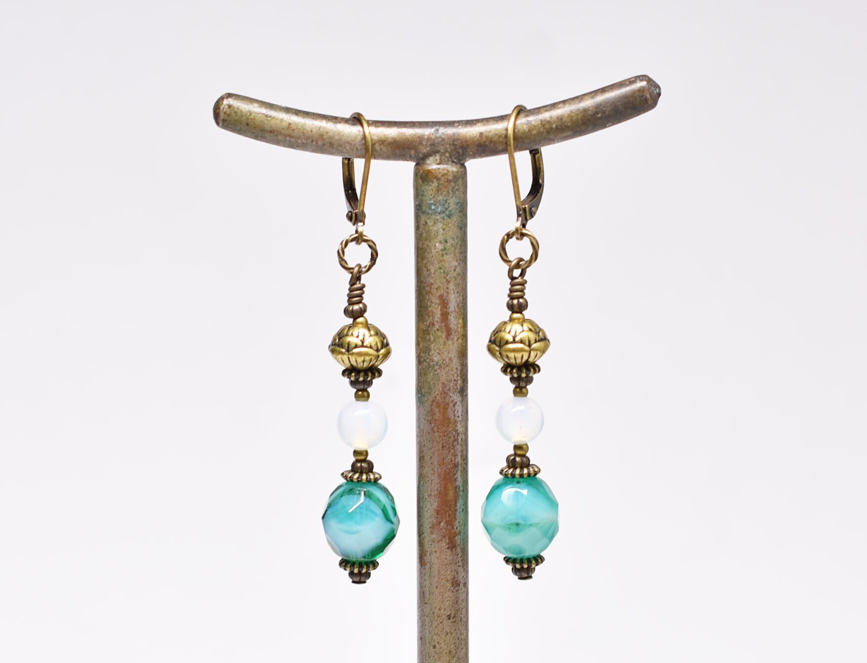 エメラルドグリーンチェコビーズとヴィンテージオパールグラス、蓮華ブラスを繋いだピアスです。
