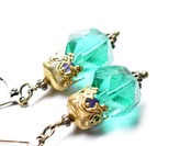 グリーンヴィンテージビーズとアメジスト、ブラス装飾のピアス