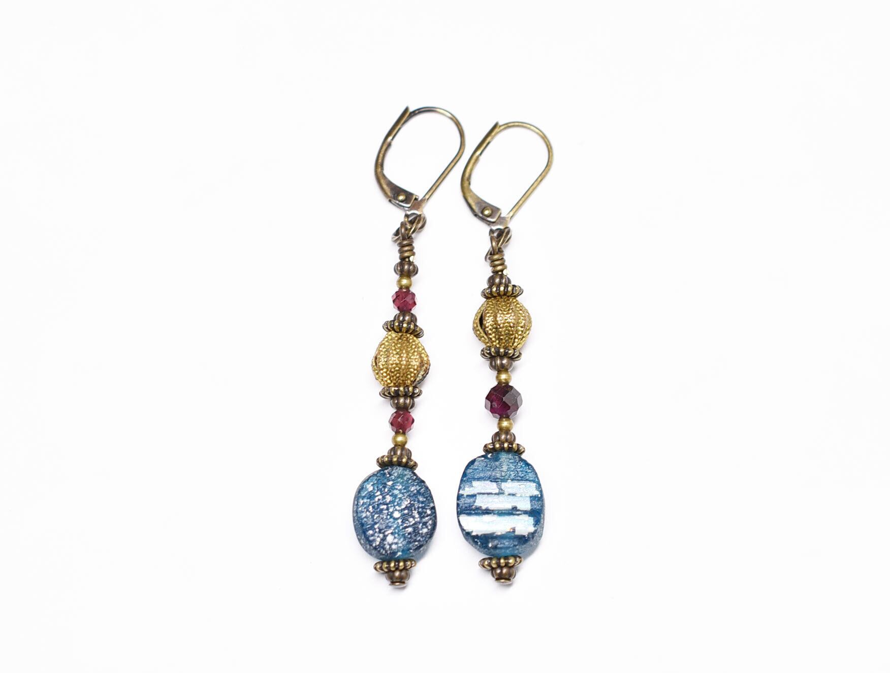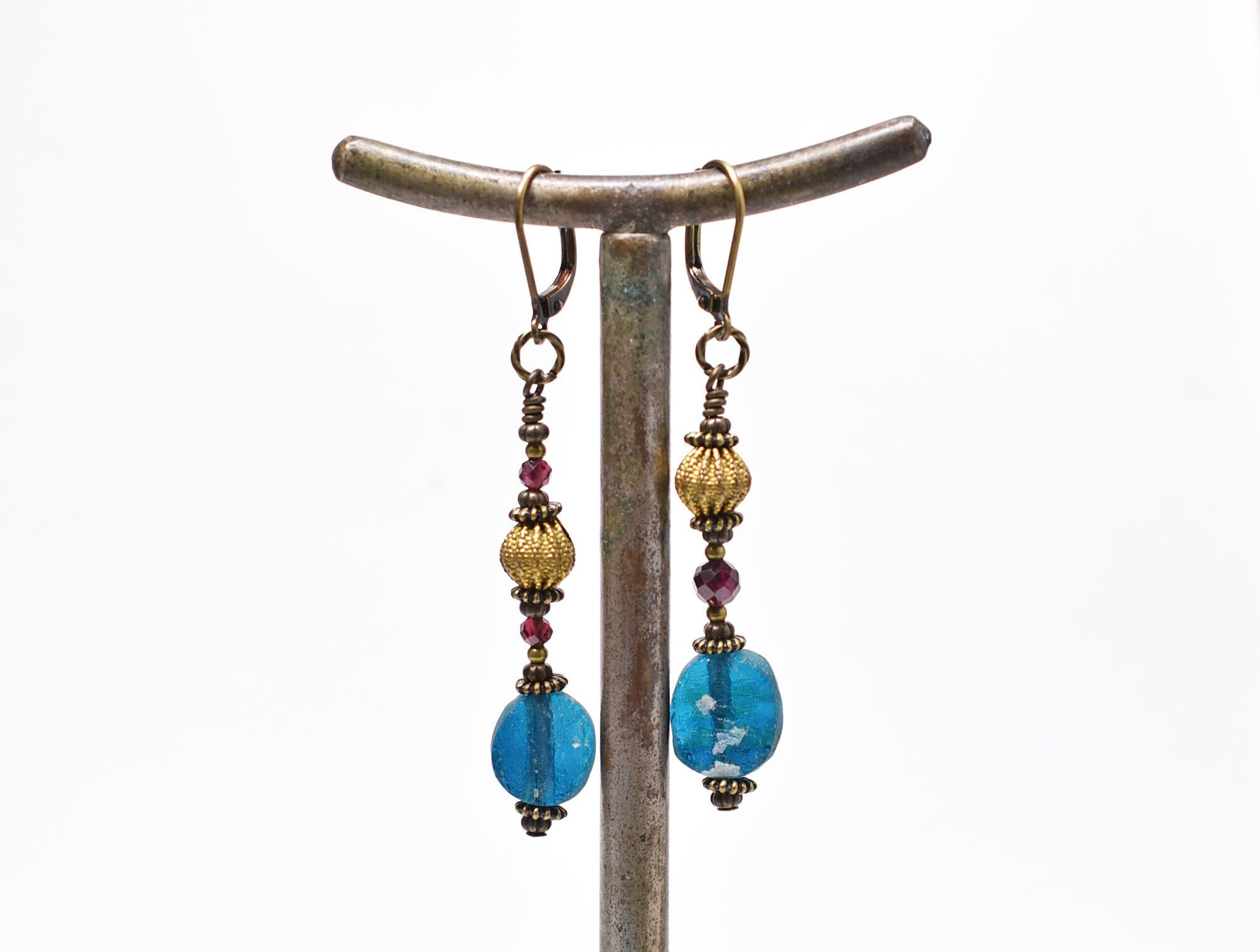 ブルーグリーンローマングラスとガーネット、ブラスビーズのアンシメトリーピアス