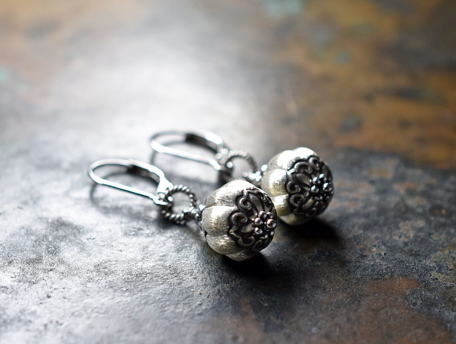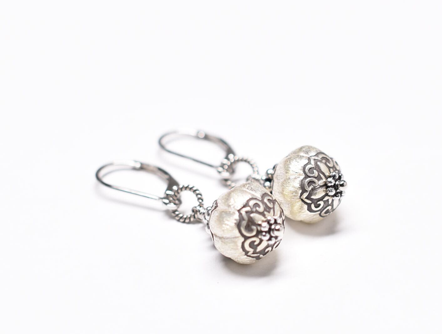筋が施されたぷっくりとしたカレンシルバーの上下には花弁のような繊細な刻印が施されています。