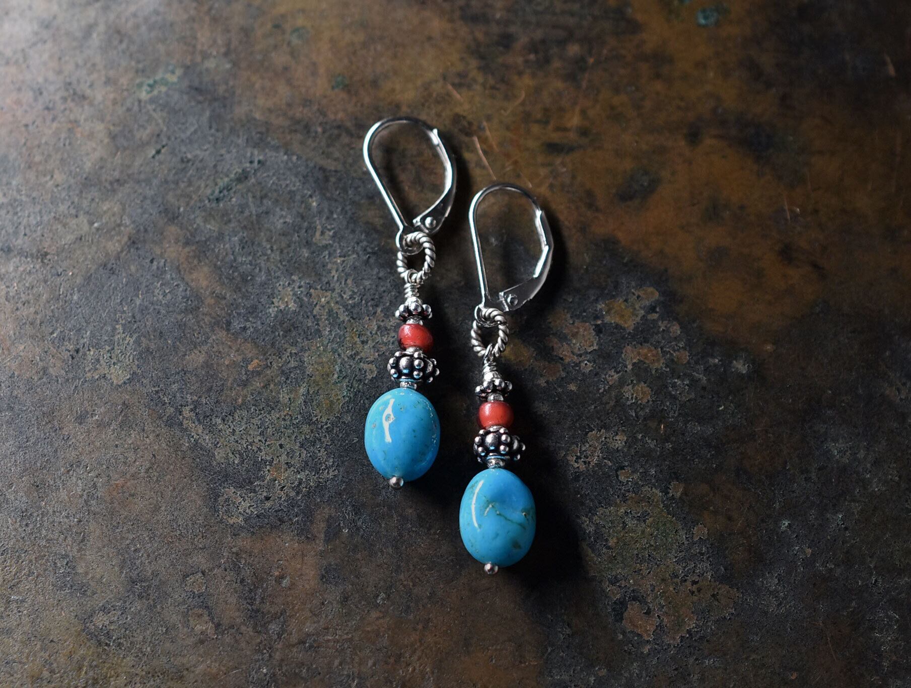 キングマンターコイズとアンティーク金赤ホワイトハーツ、シルバーを繋いだピアスです。