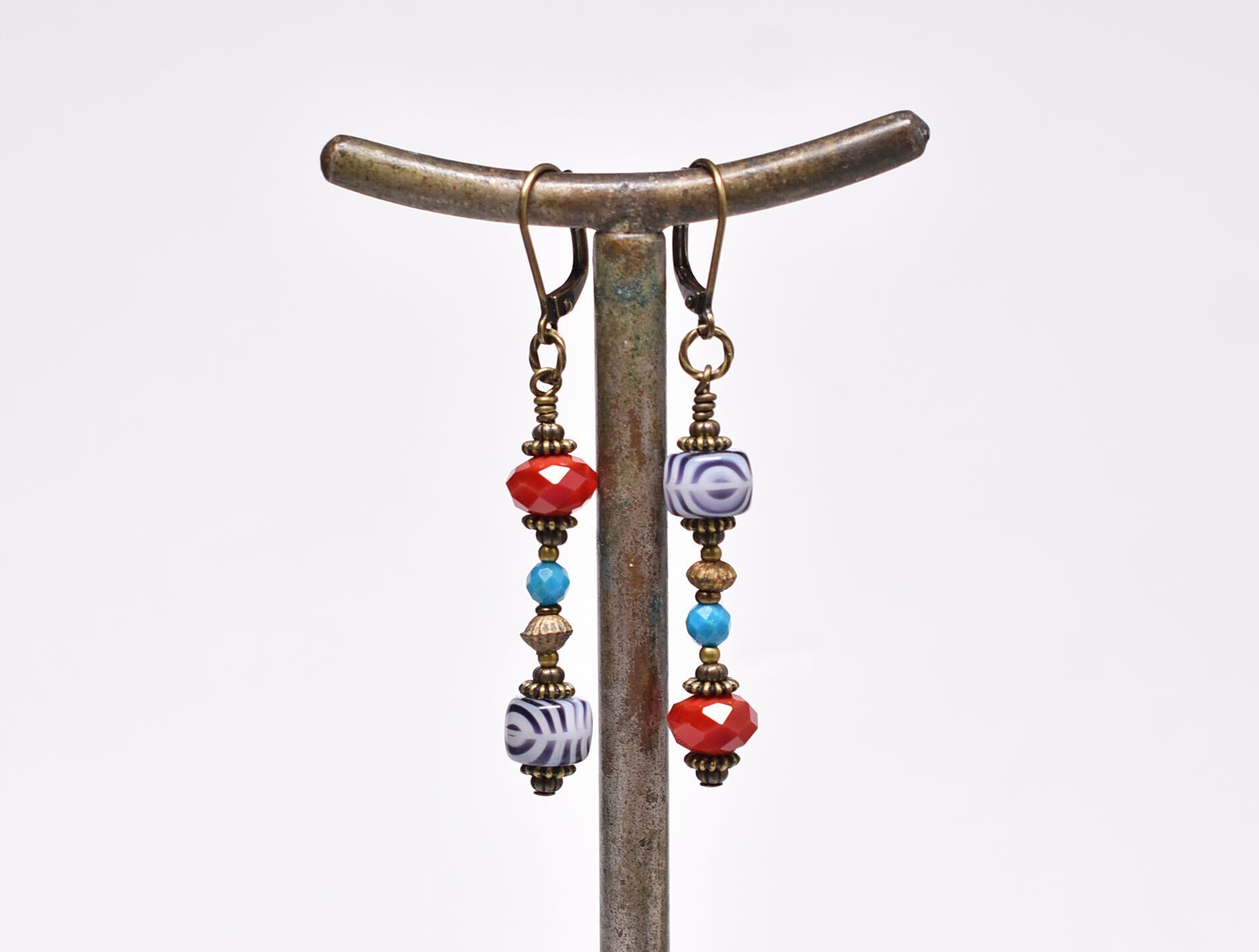 ゼブラ柄ヴィンテージビーズと真っ赤なカットビーズ、ターコイズとブラスビーズを繋いだアンシメトリーなピアスです。