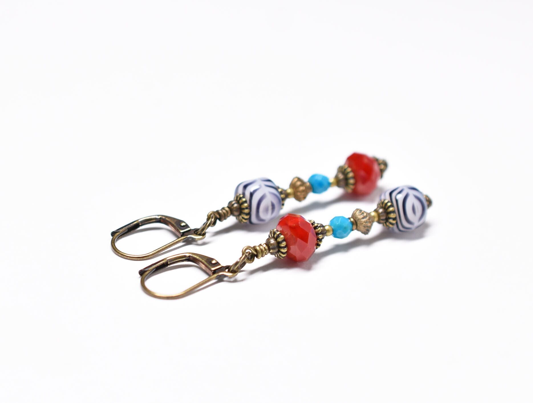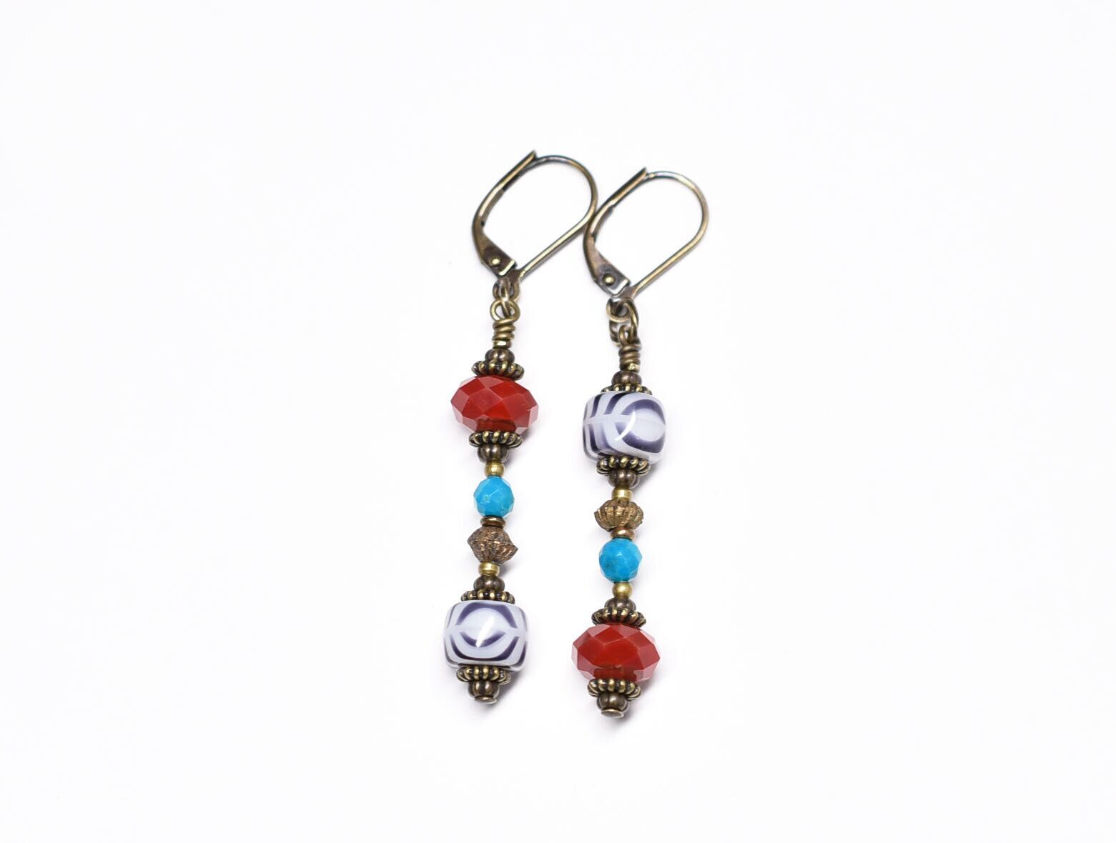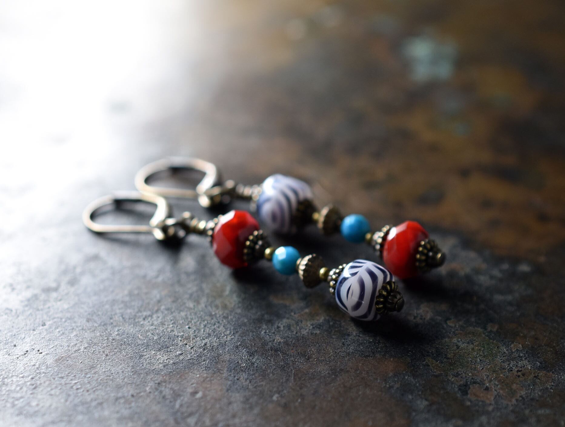 ゼブラ柄ヴィンテージビーズと真っ赤なカットビーズ、ターコイズとブラスビーズのアンシメトリーピアス