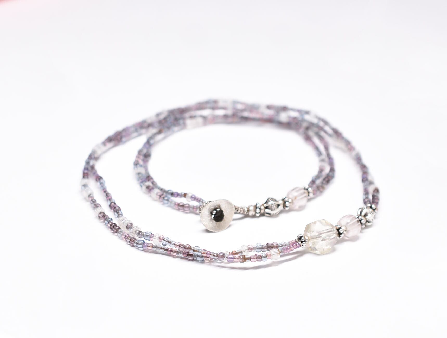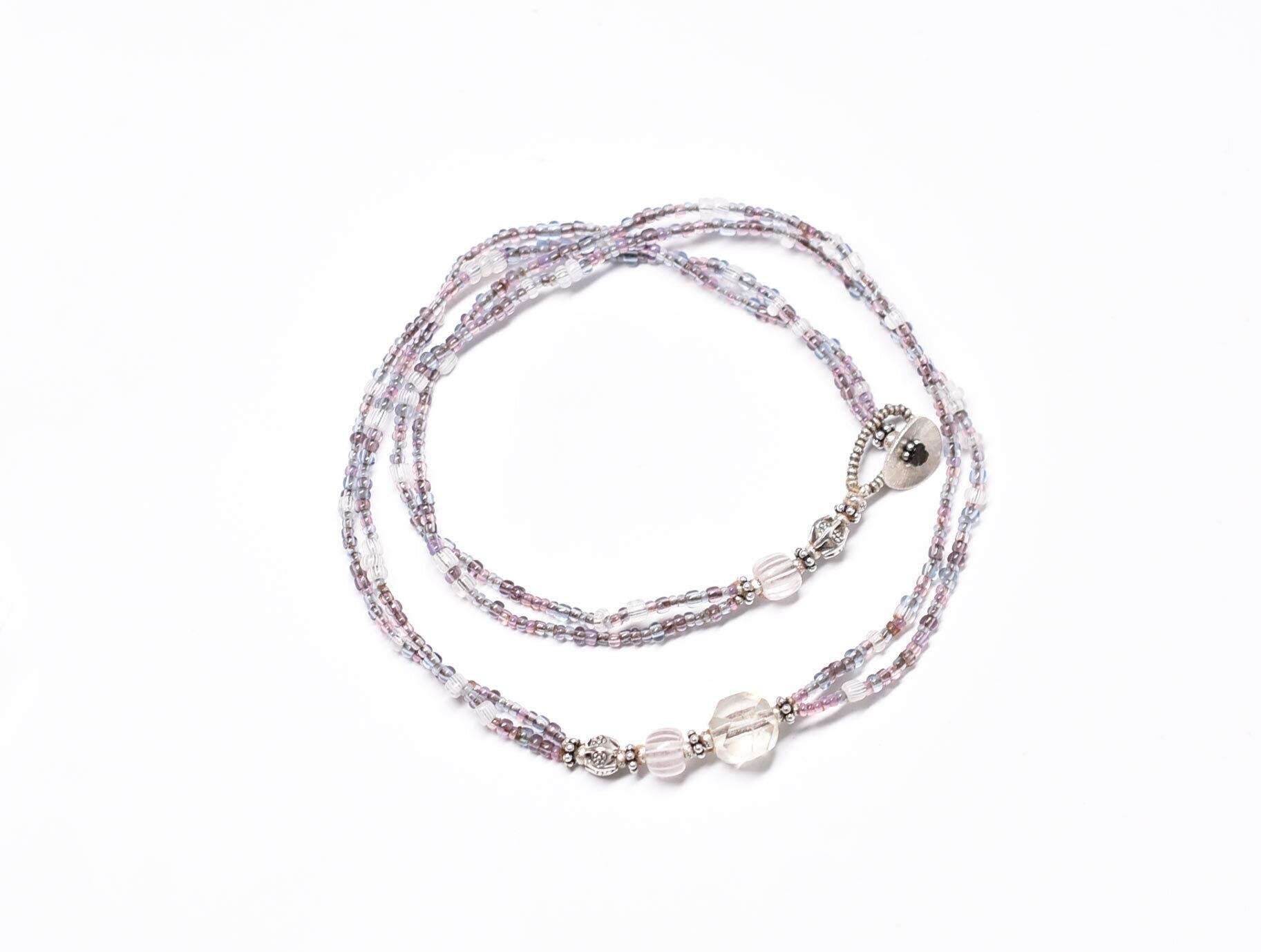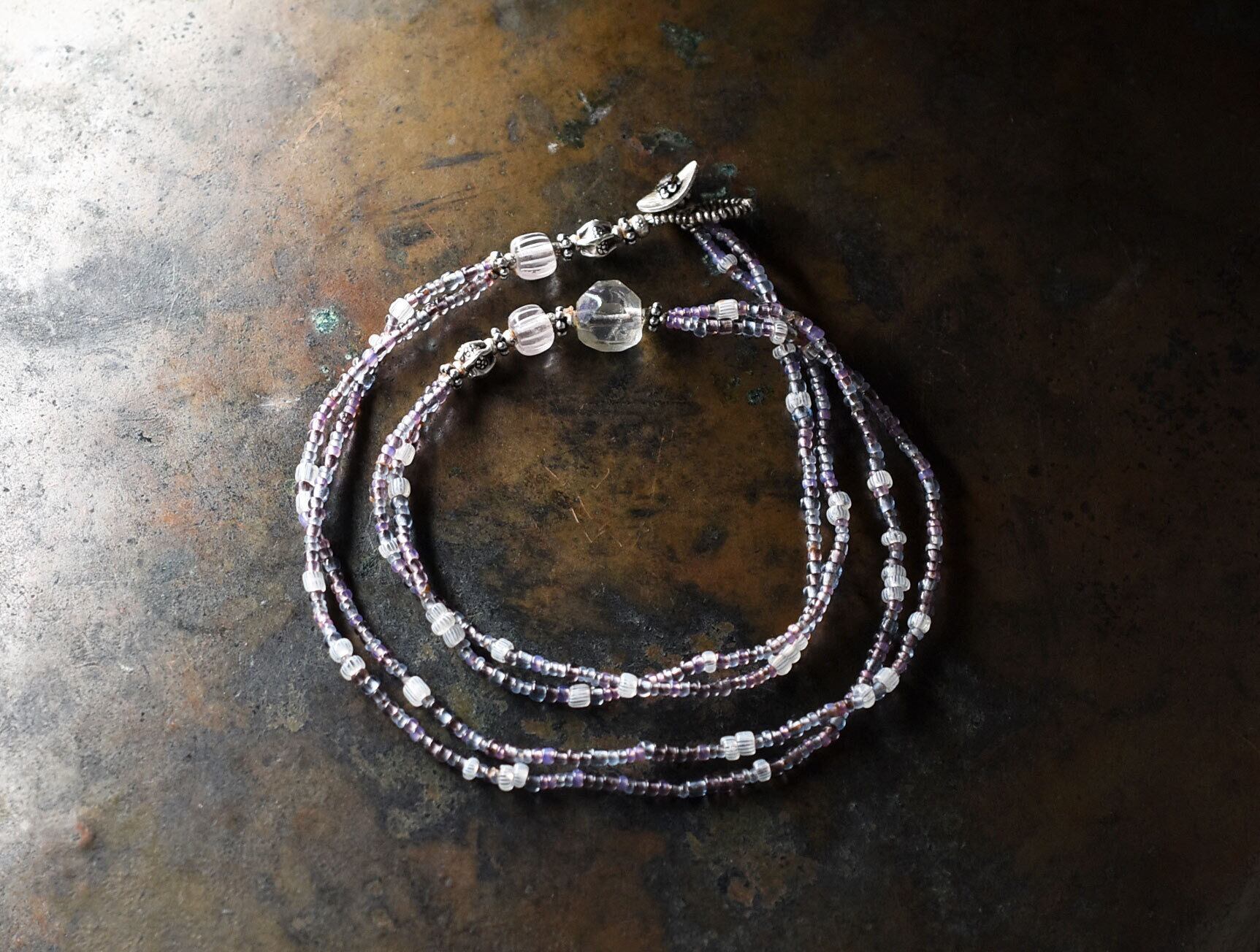 小さなパープルやピンクオパール、青藤色のビーズはフランスのヴィンテージビーズです。