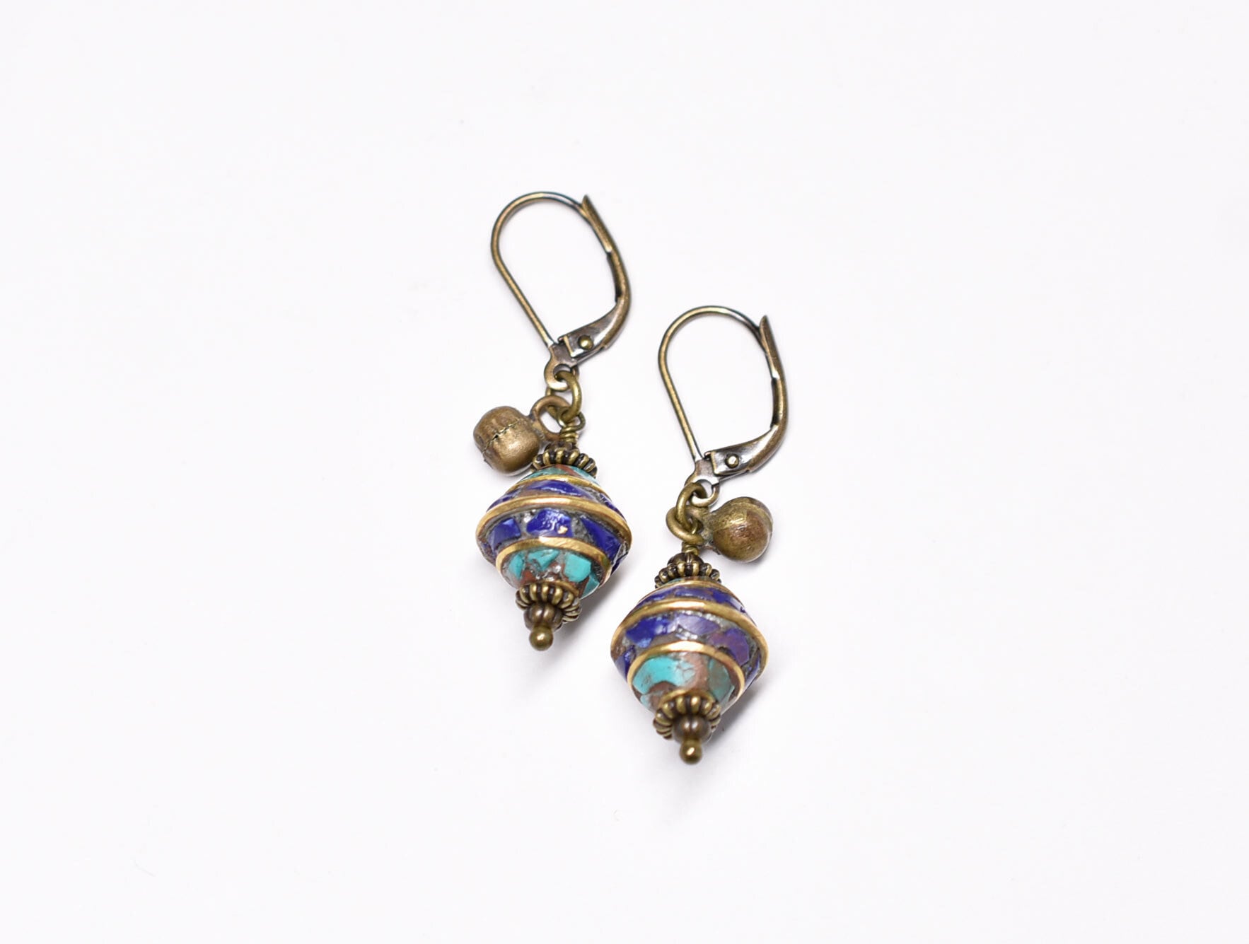 ラピスとターコイズ象嵌チベットビーズと民族鈴を繋いだピアスです。