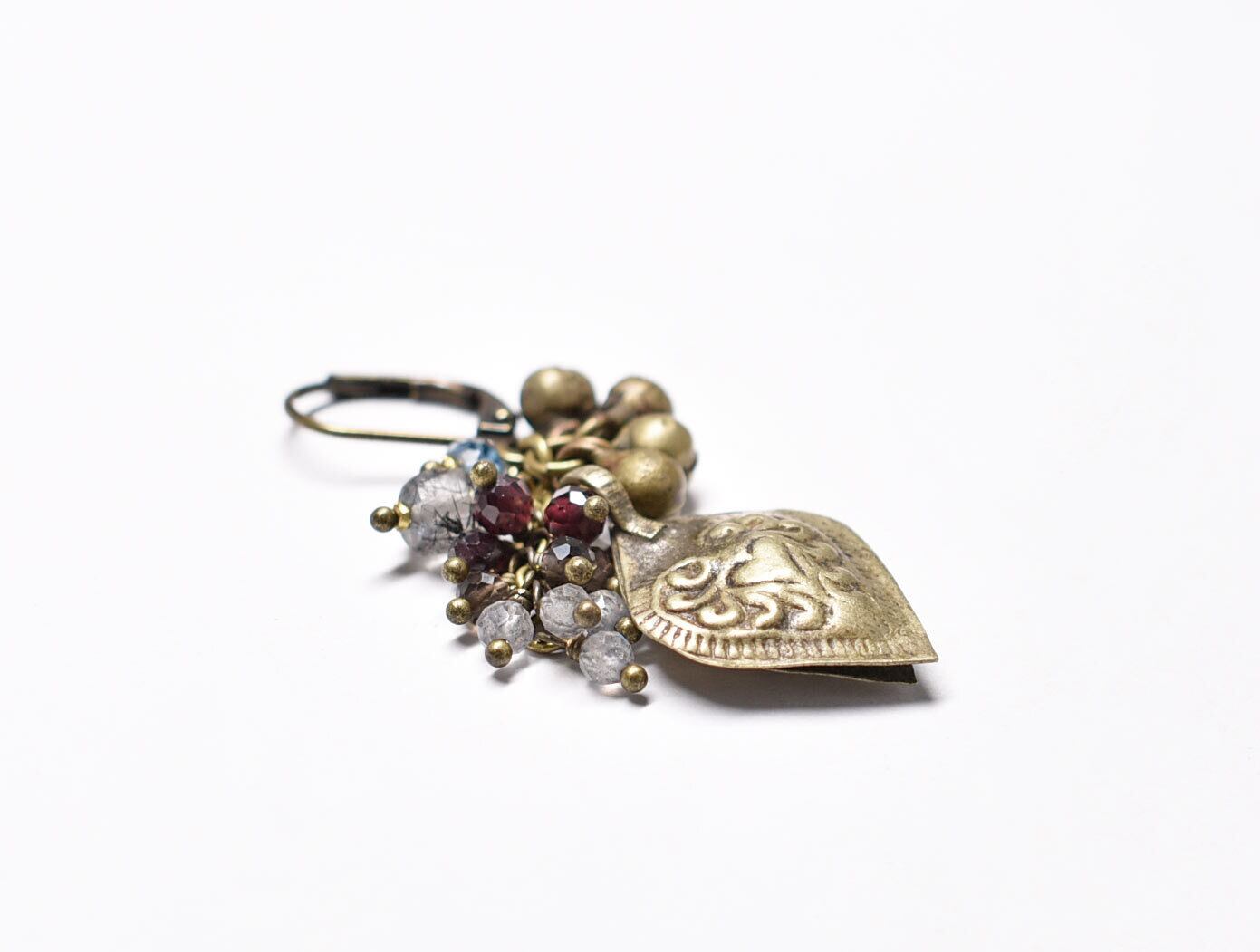 アフガニスタンメタルとブラックルチル、ロンドンブルートパーズ、たわわなストーンビーズ、民族鈴を繋いだ片耳ピアスです。