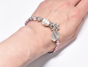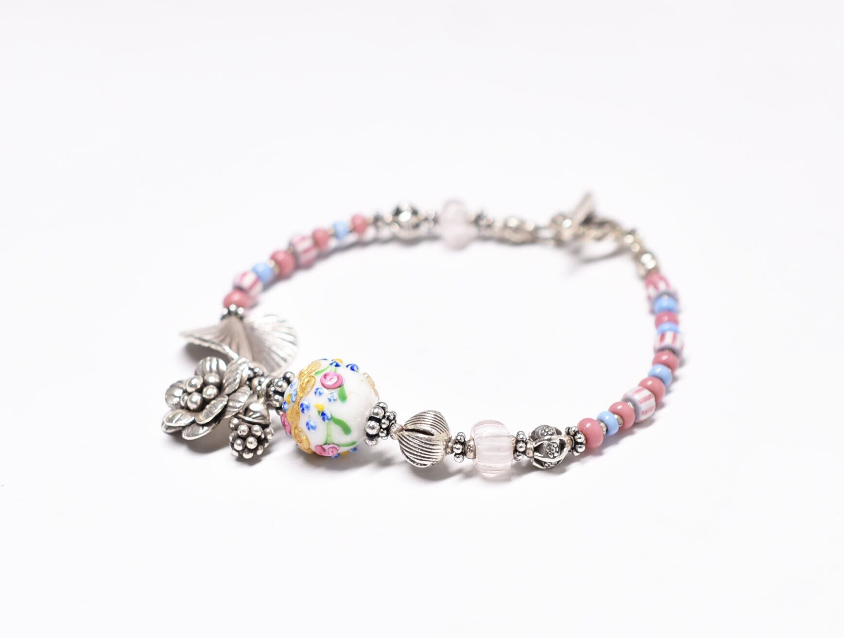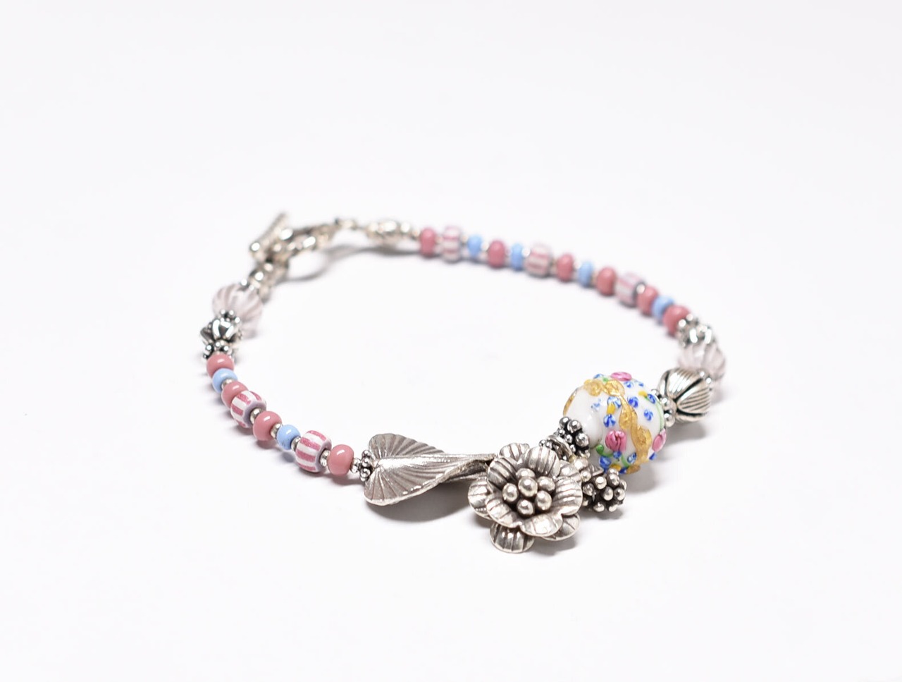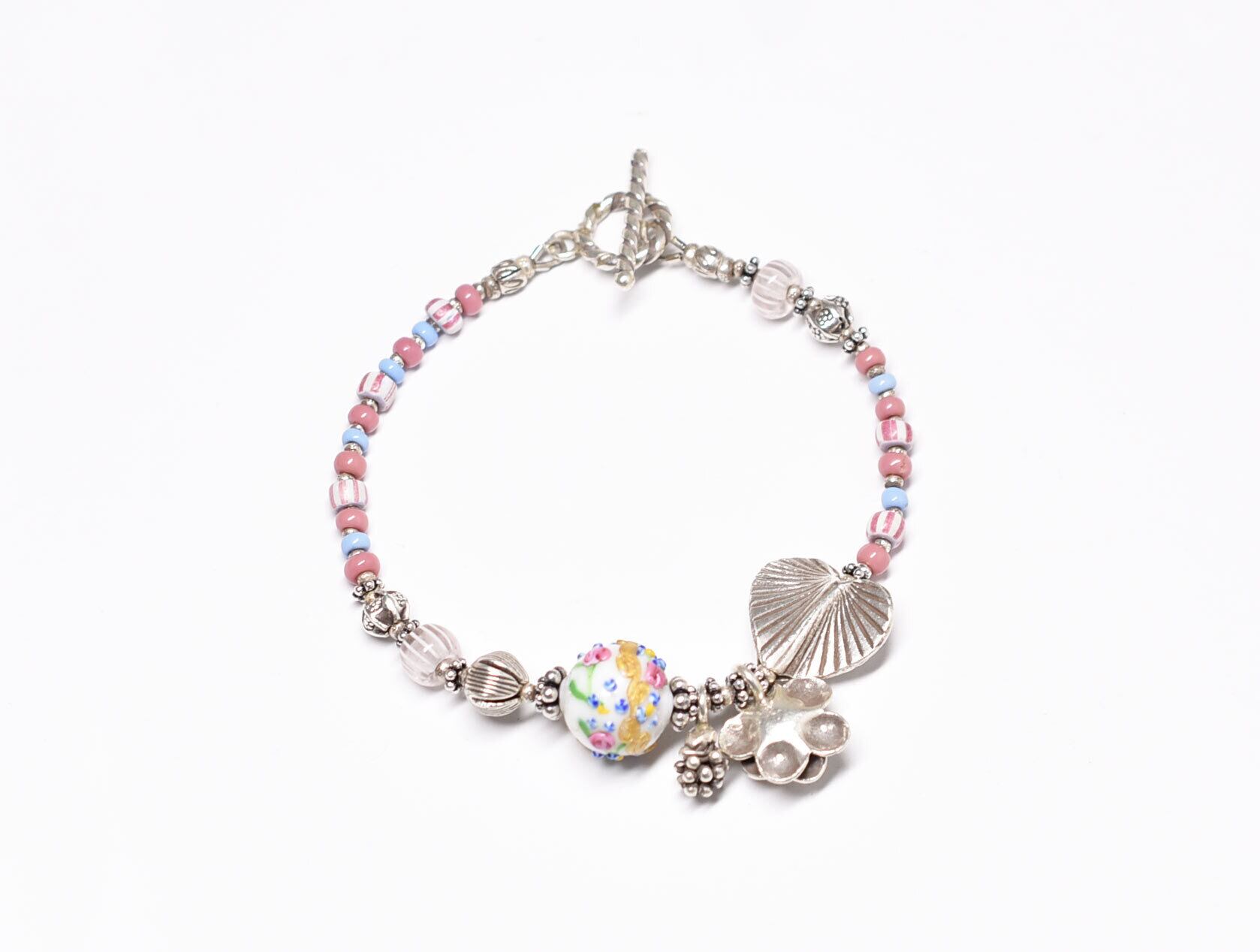 ホワイトヴェネチアアンティーク薔薇と勿忘草とカレンシルバー、グーズベリー、アンティークのヴェネチアビーズを繋いだブレスです。