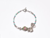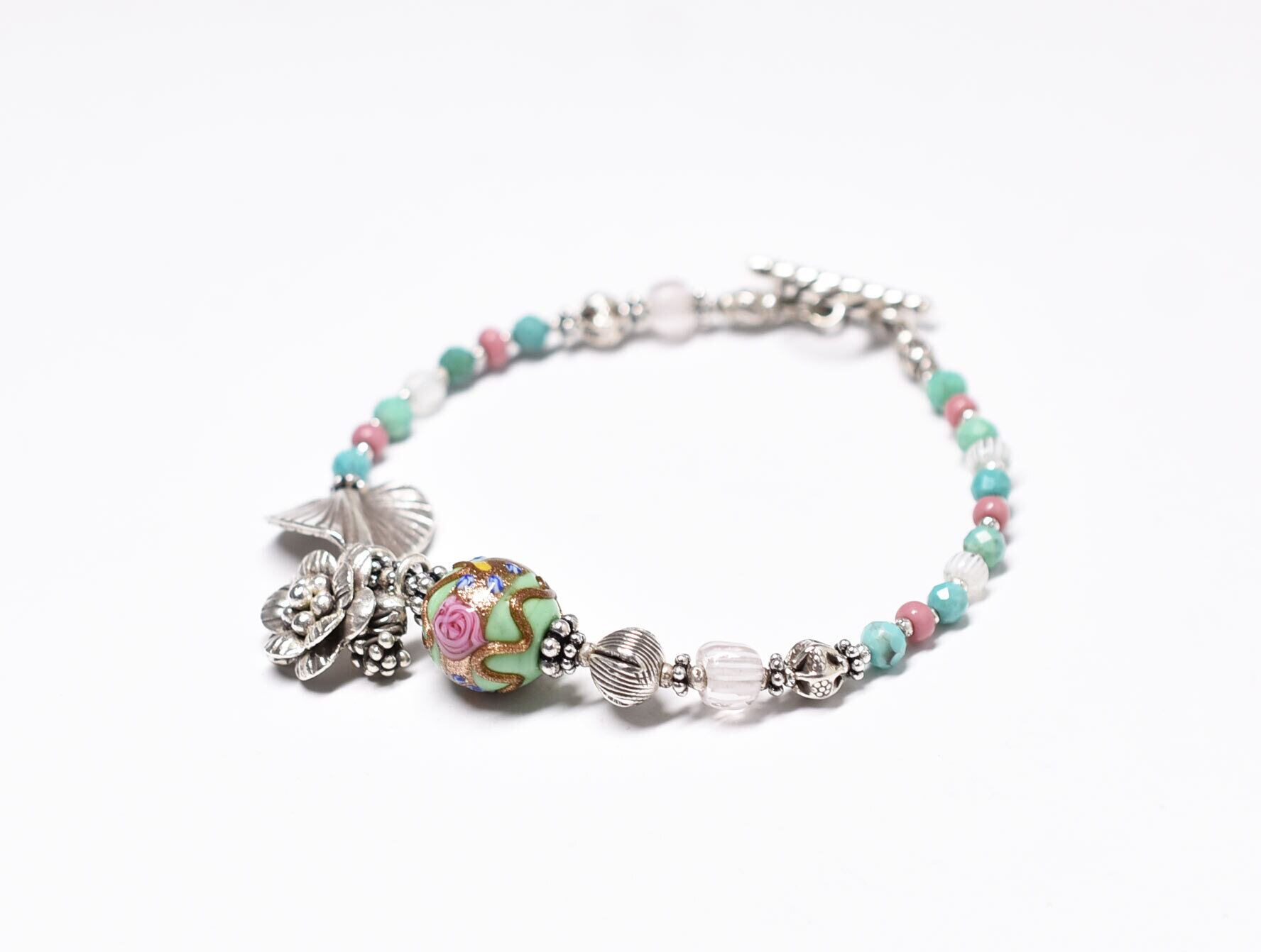 ミントグリーンヴェネチアアンティーク薔薇と勿忘草とカレンシルバー、グーズベリー、ピンクマサイ、ターコイズを繋いだブレスです。