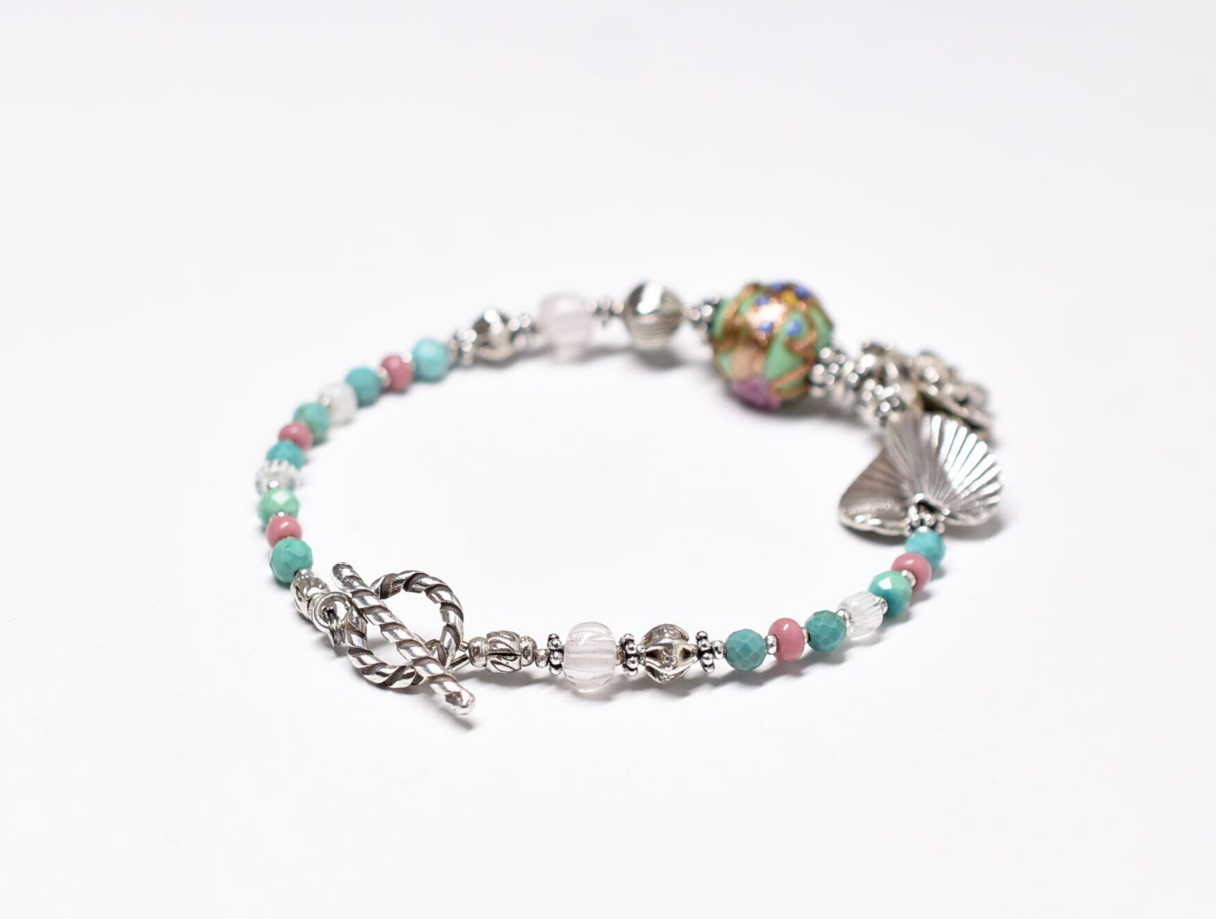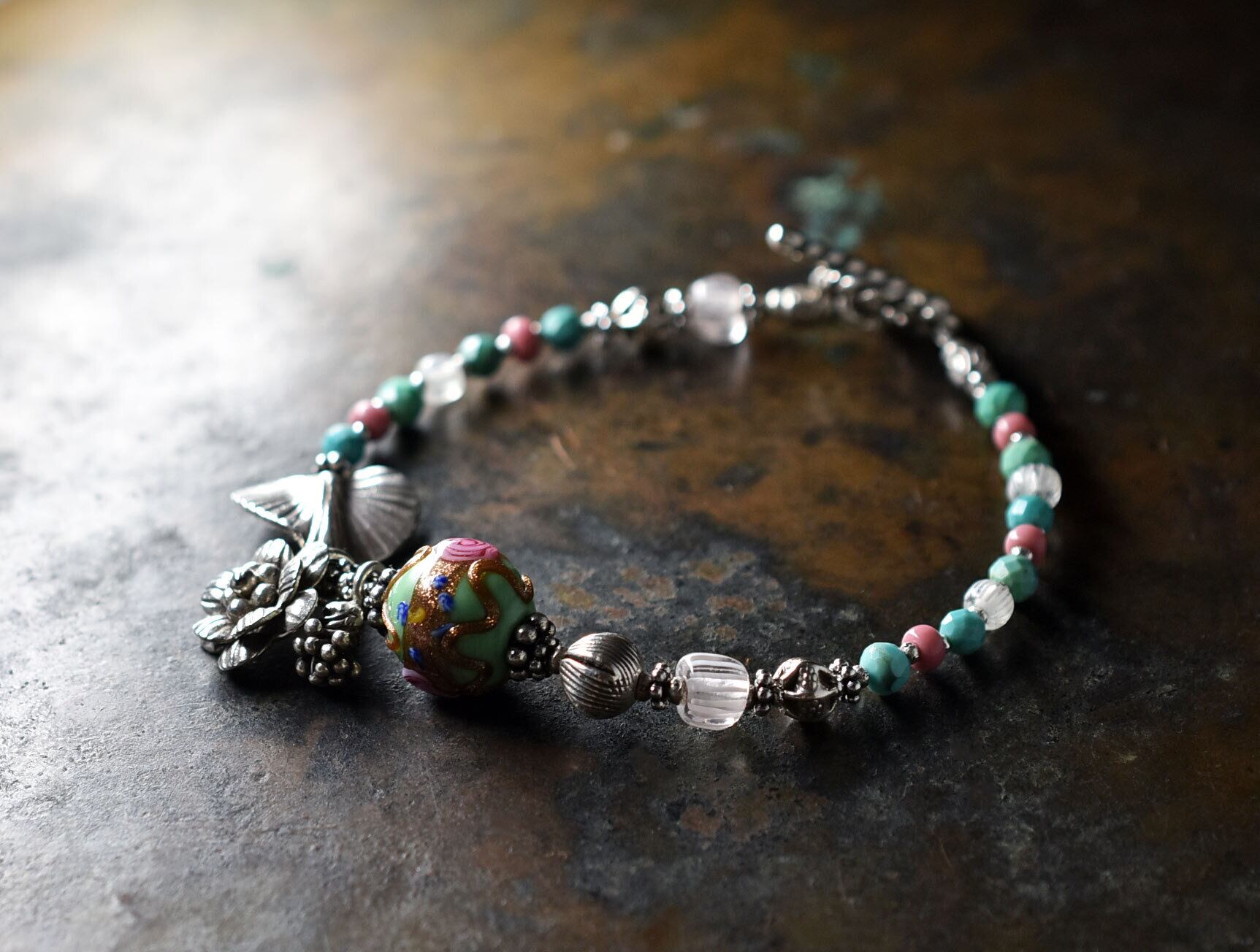 ミントグリーンヴェネチアアンティーク薔薇と勿忘草とカレンシルバー、グーズベリー、ピンクマサイ、ターコイズのブレス