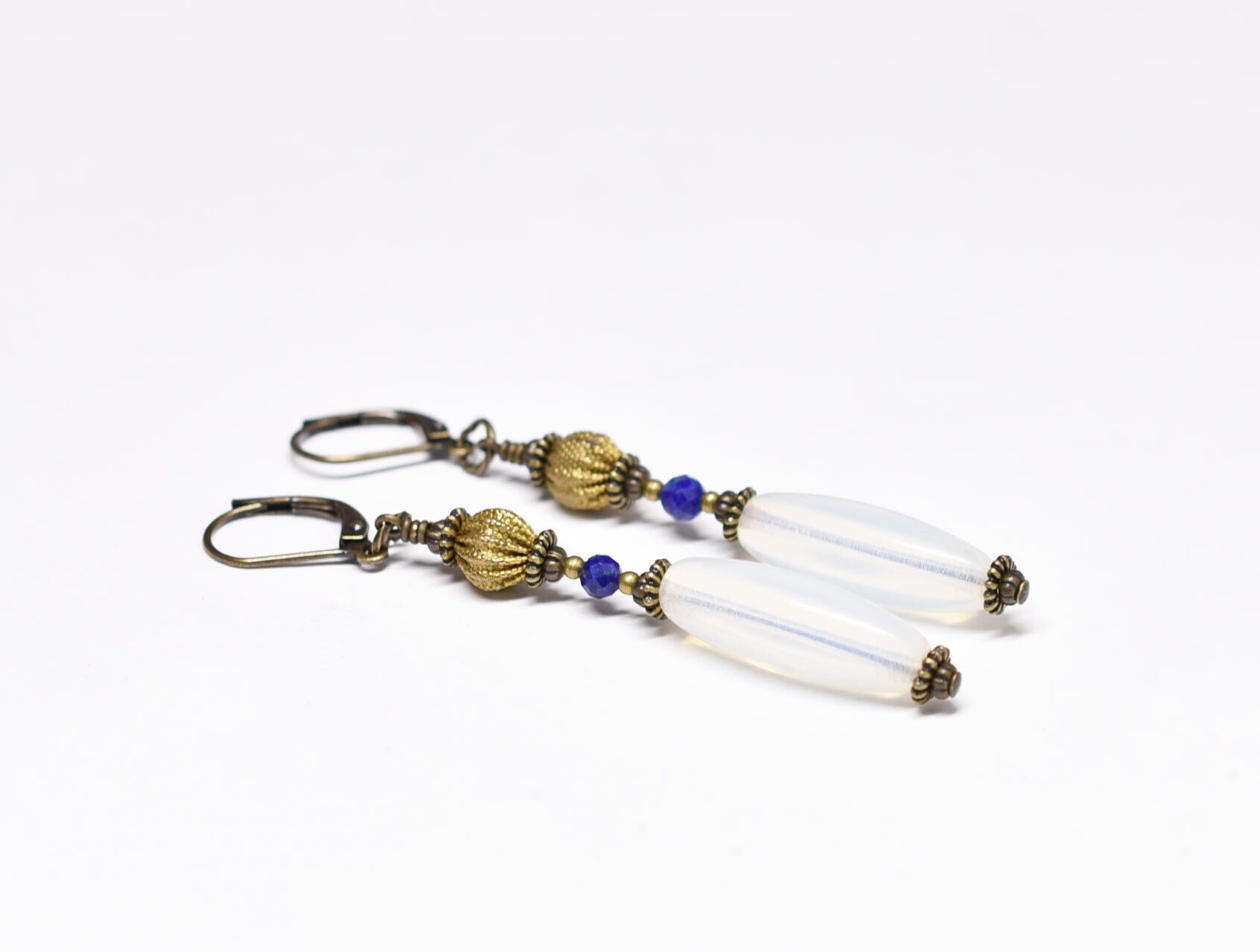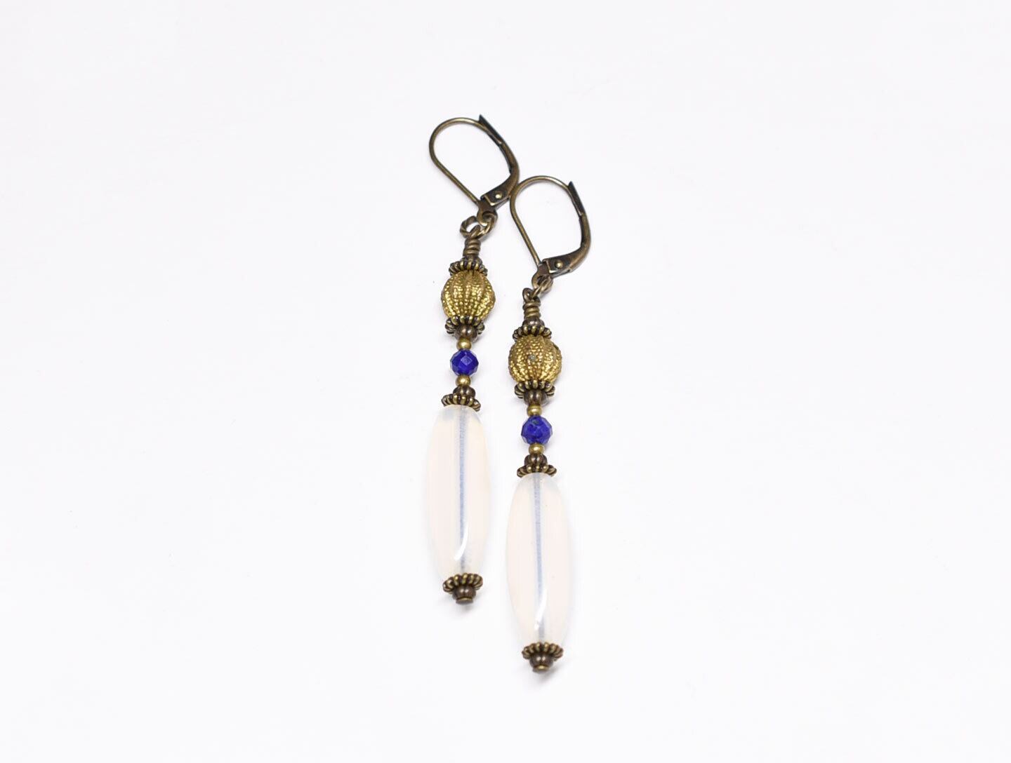 アンティークオパールガラスとブラスビーズ、ラピスを繋いだピアスです。