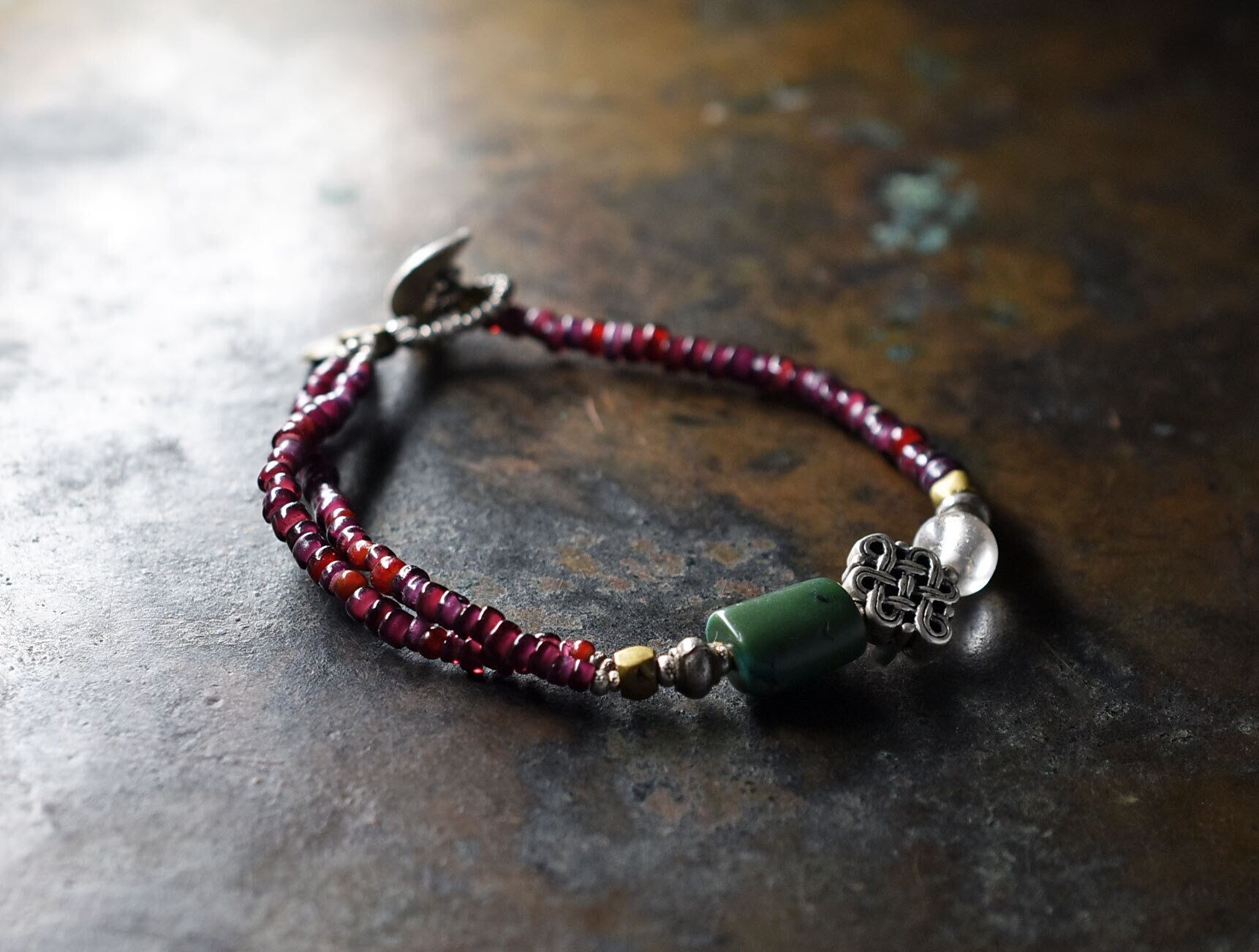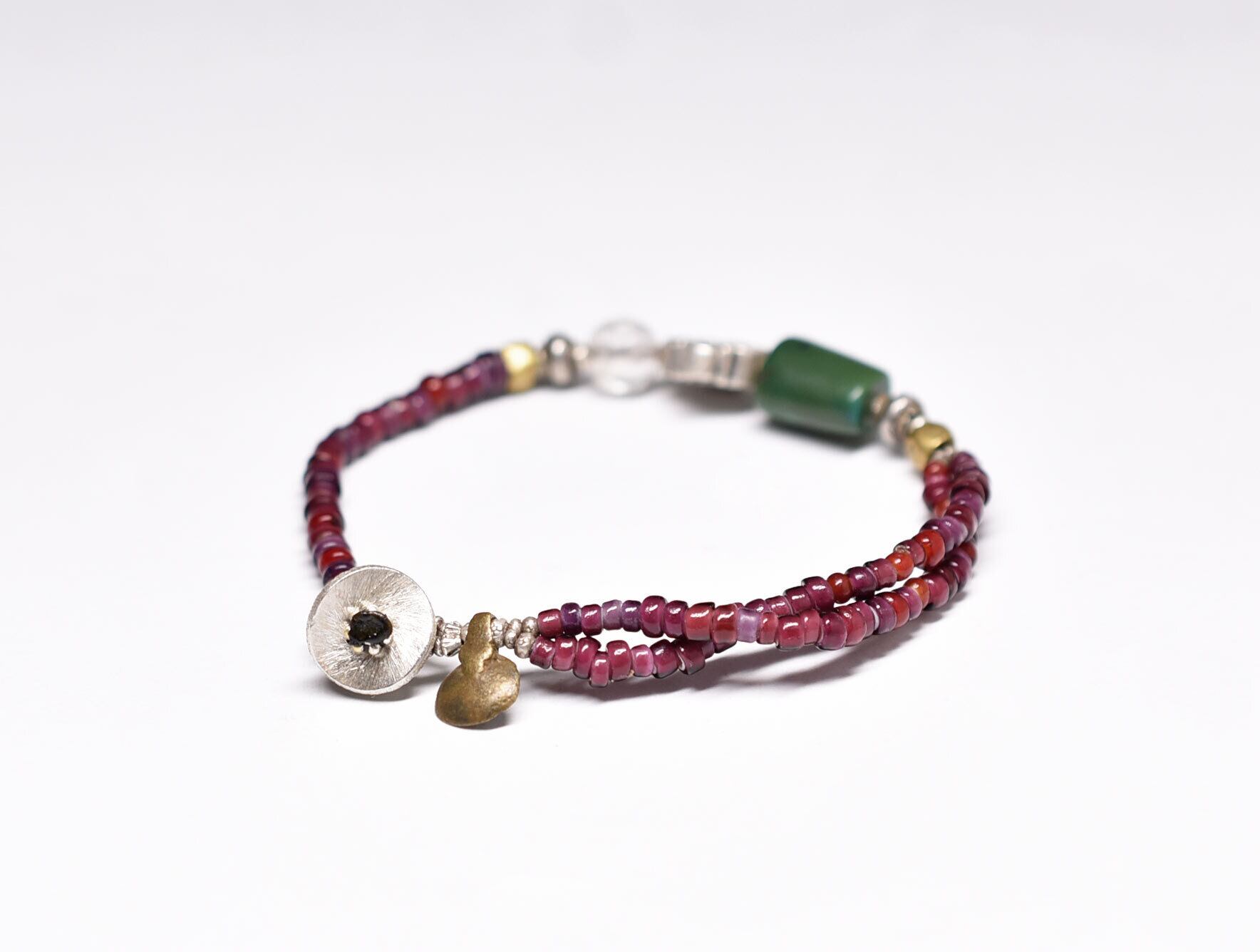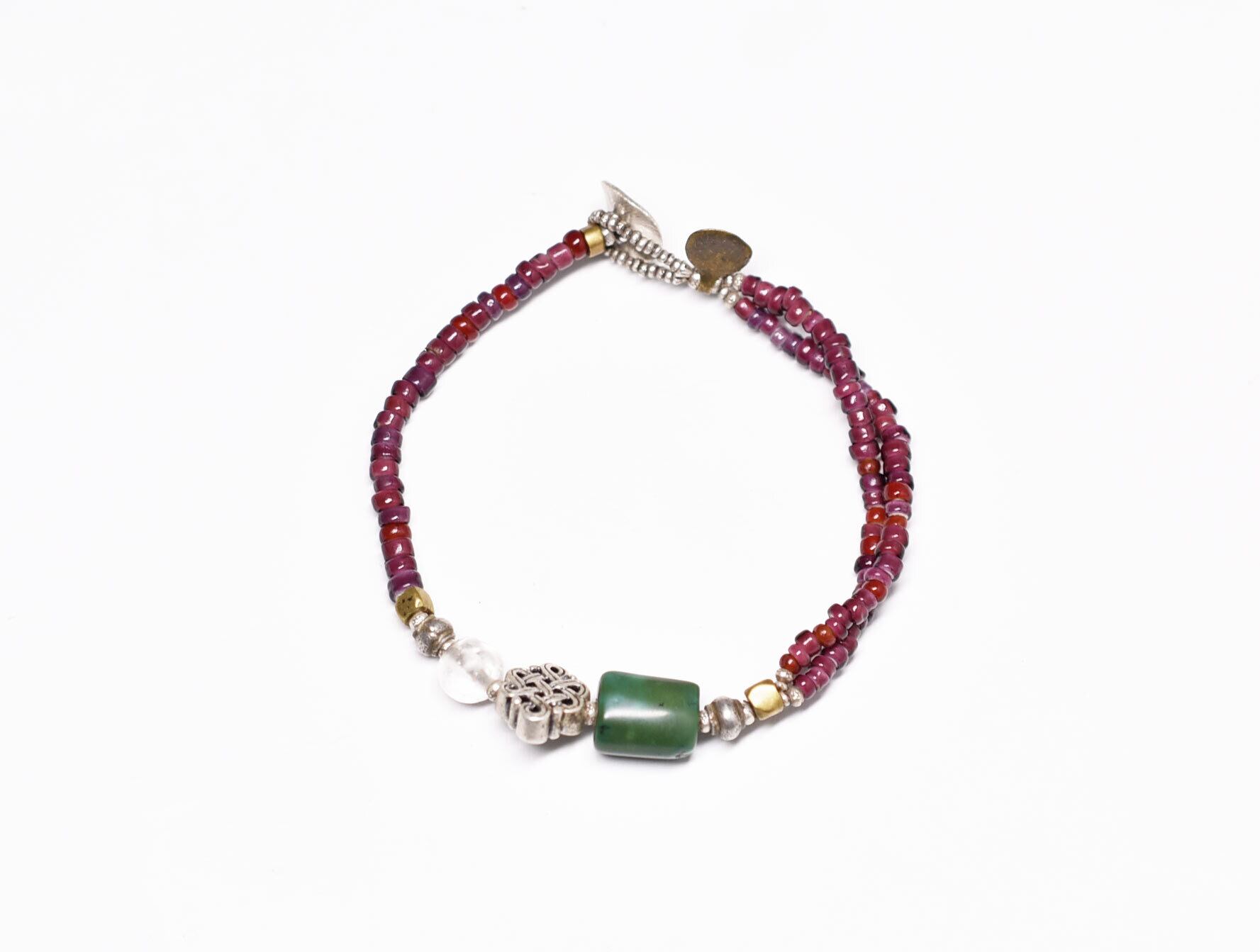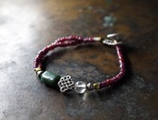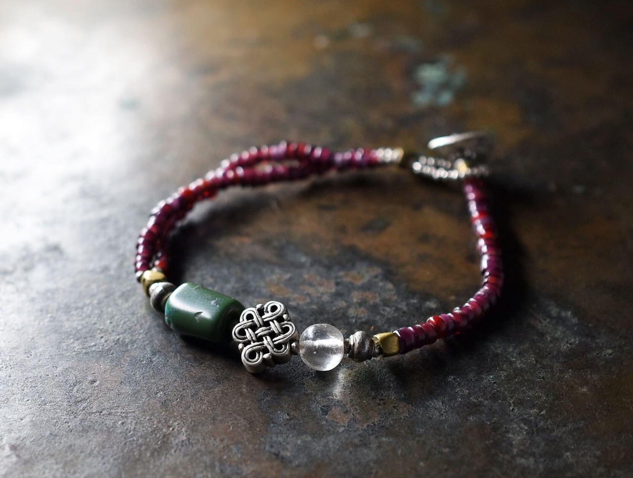 oldチベタンターコイズと古代水晶、エンドレスノット、oldチンシルバー、oldオリッサブラス、葡萄色ホワイトハーツなどを繋いだブレスです。