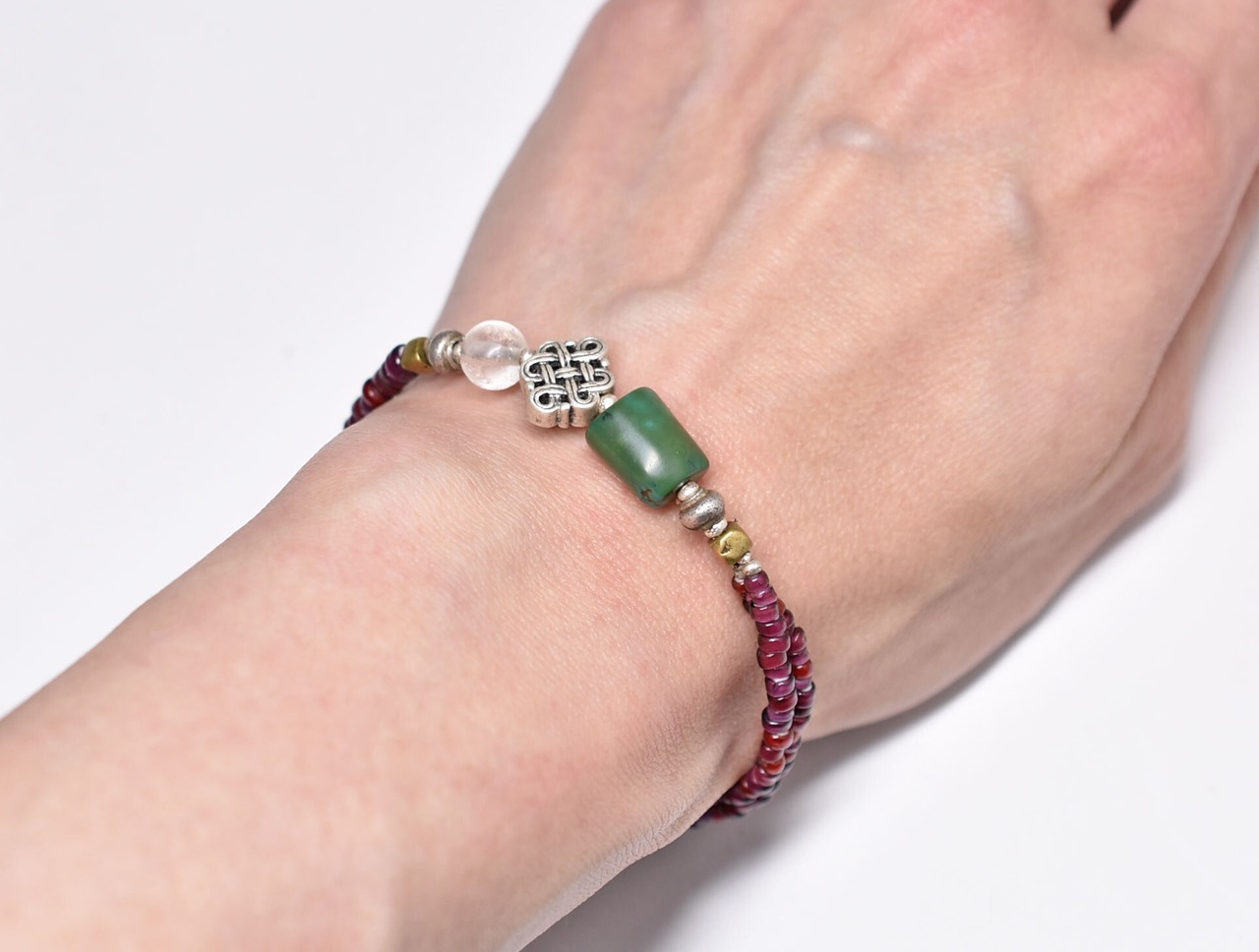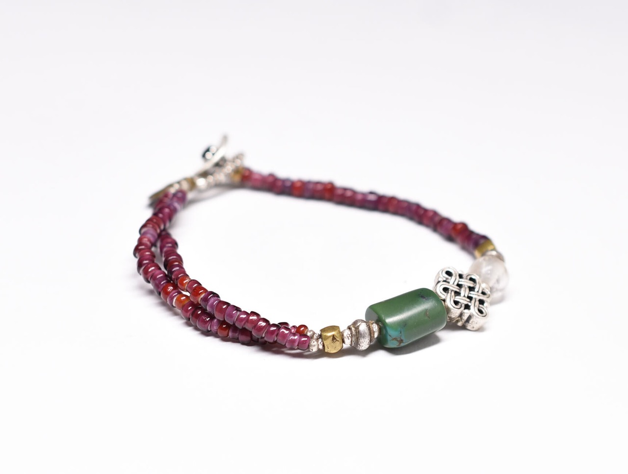 oldチベタンターコイズと古代水晶、エンドレスノット、oldチンシルバー、oldオリッサブラス、葡萄色ホワイトハーツのブレス