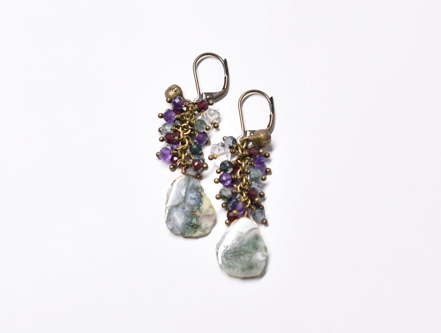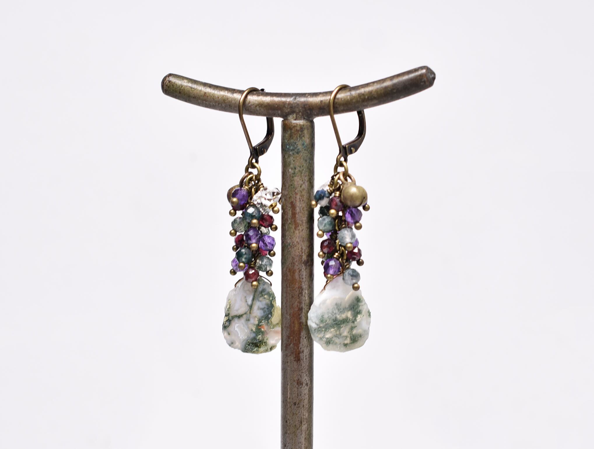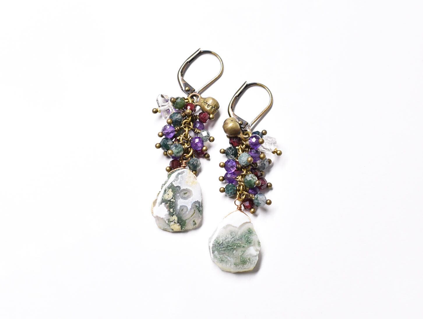 素材:ピーコッククォーツ、ガーネット、アメジスト、ハーキマーダイヤモンド、真鍮、ミックスメタル