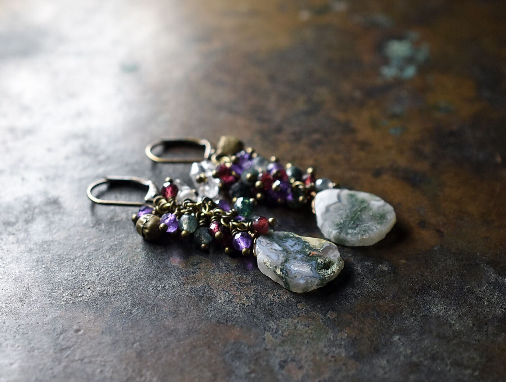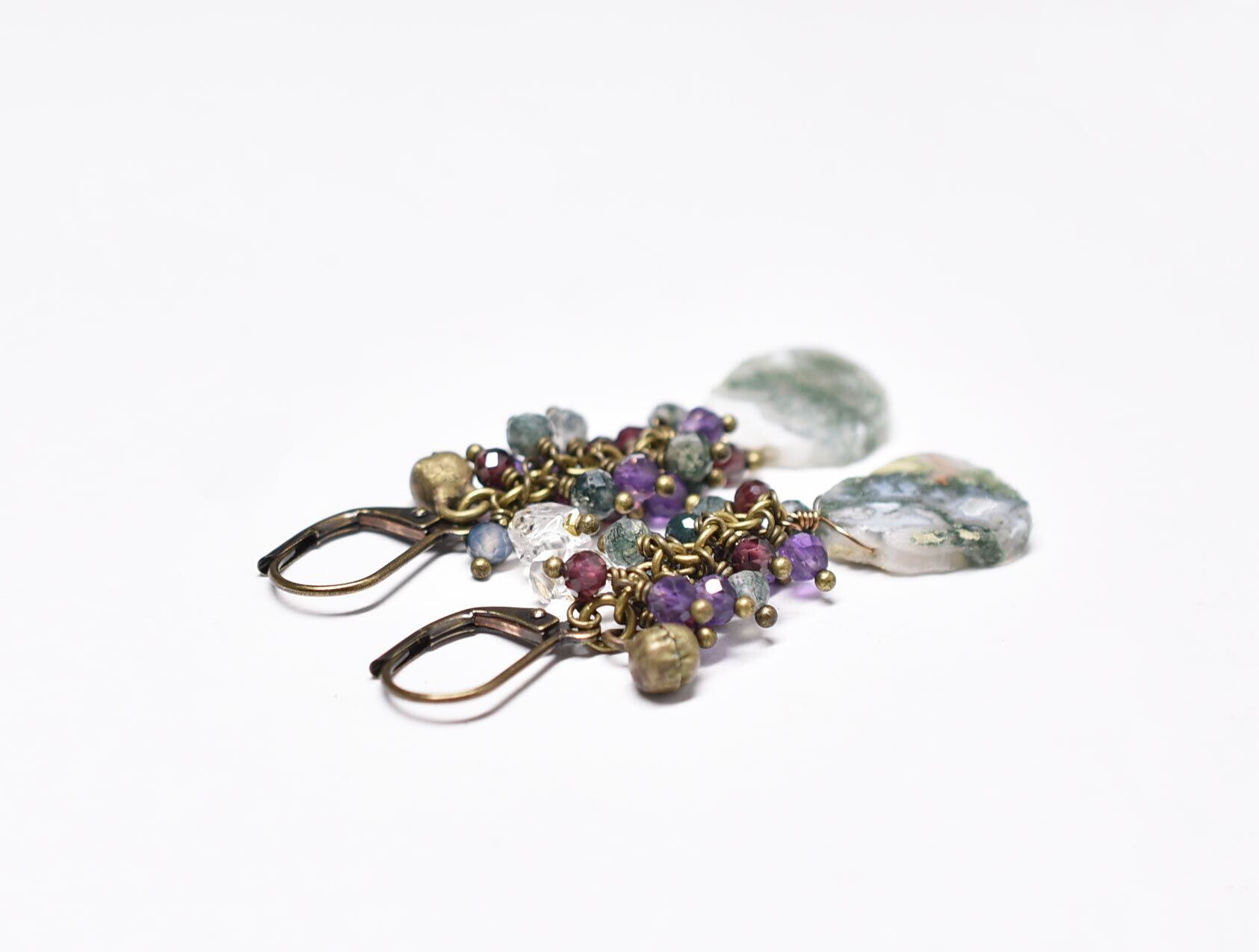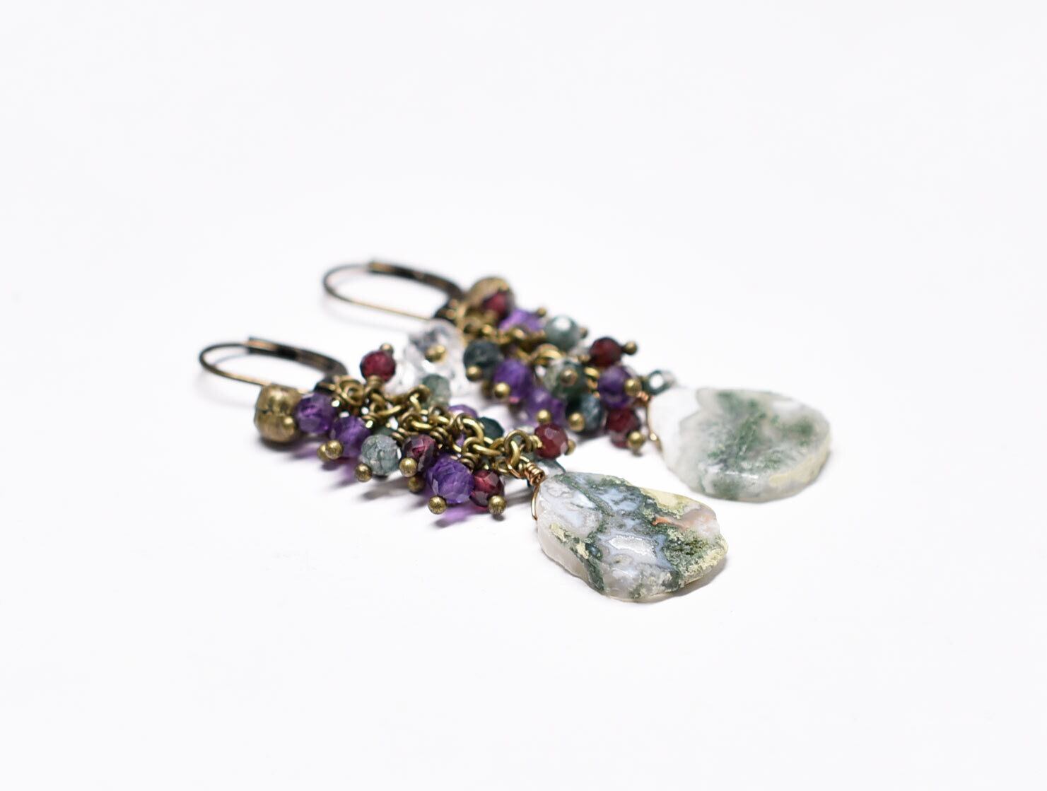 素材:ピーコッククォーツ、ガーネット、アメジスト、ハーキマーダイヤモンド、真鍮、ミックスメタル